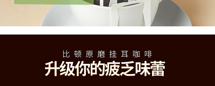比顿炭烧风味清咖咖啡,现磨包装,采用挂耳式,这样既简单又方便,而且还能自己体验到冲调的乐趣,可以更深入的品味到咖啡的内涵,将滤袋打开后放在咖啡杯里,然后冲入一小部份开水,先让整个咖啡粉都浸透后,再慢慢冲入开水,让滤挂慢慢渗出咖啡,这么好的盒装精品黑咖啡,值得你拥有哦。