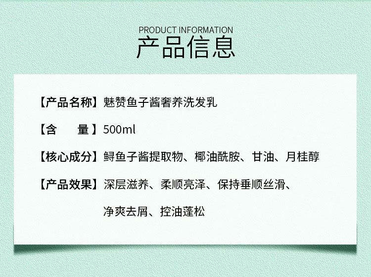 炎热的夏天即将到来,又到了要经常洗头的时候了,但是每次洗完头,头发老是打结,吹干之后还超级毛躁,急匆匆想出门,梳子却和头发难舍难分,真的是让人抓狂抓狂又抓狂。为什么你的头发枯燥易断,别人的一梳就顺?那是你没选对洗发水!魅赞鱼子酱润养奢妍洗发乳,富含深海鲟鱼子酱提取物,椰油酰胺、甘油等营养成分,可有效滋养秀发、去屑,给你从发梢大到发根的滋养,让你的每一个毛囊都通透自如,时刻保持垂顺丝滑。