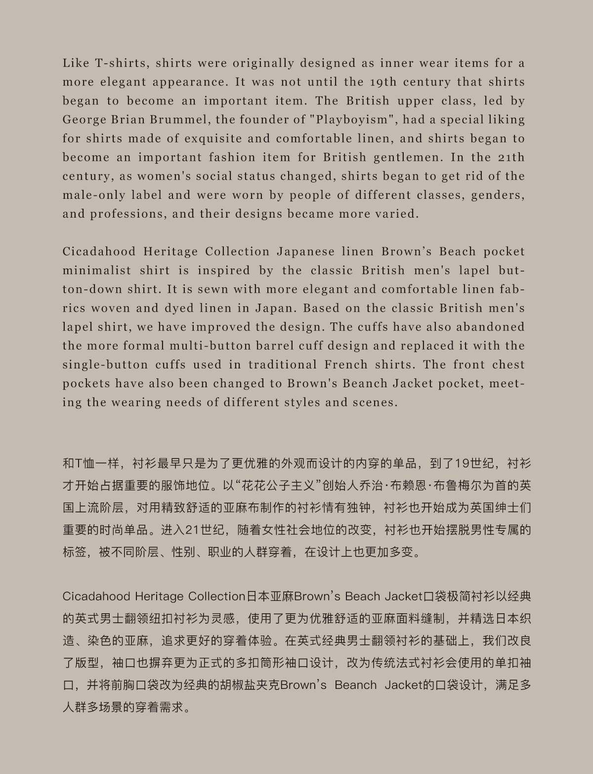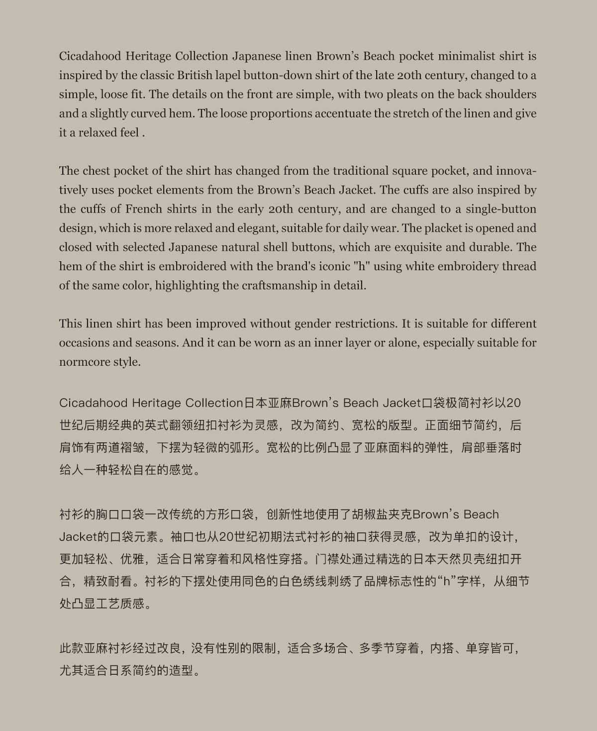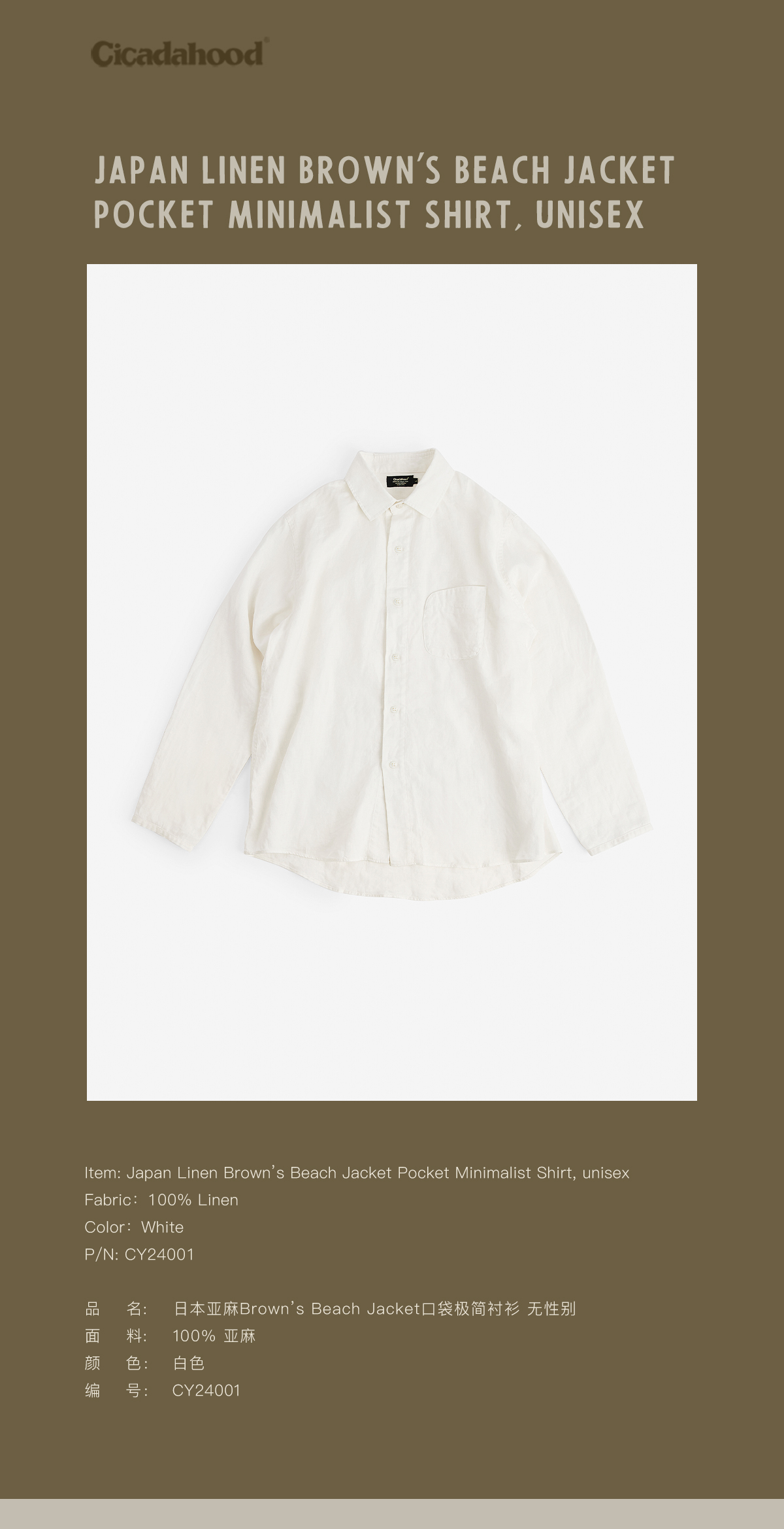 Cicadahood日本亚麻Brown’s Beach Jacket口袋极简衬衫 男女款