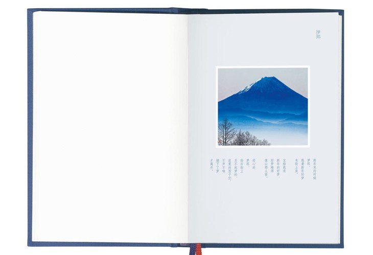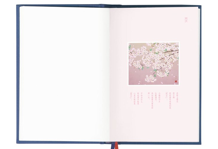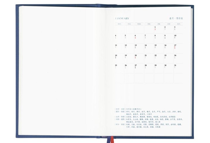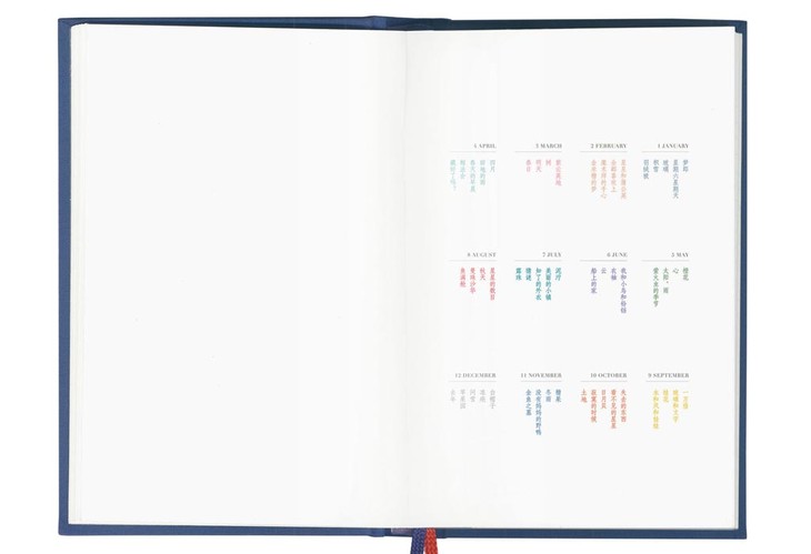 一月一周的日期安排,页面留白较多,方便记录点滴。每周一首小诗,配一幅小画,每月选一种主色调,十二个月颜色渐变,时光流转。