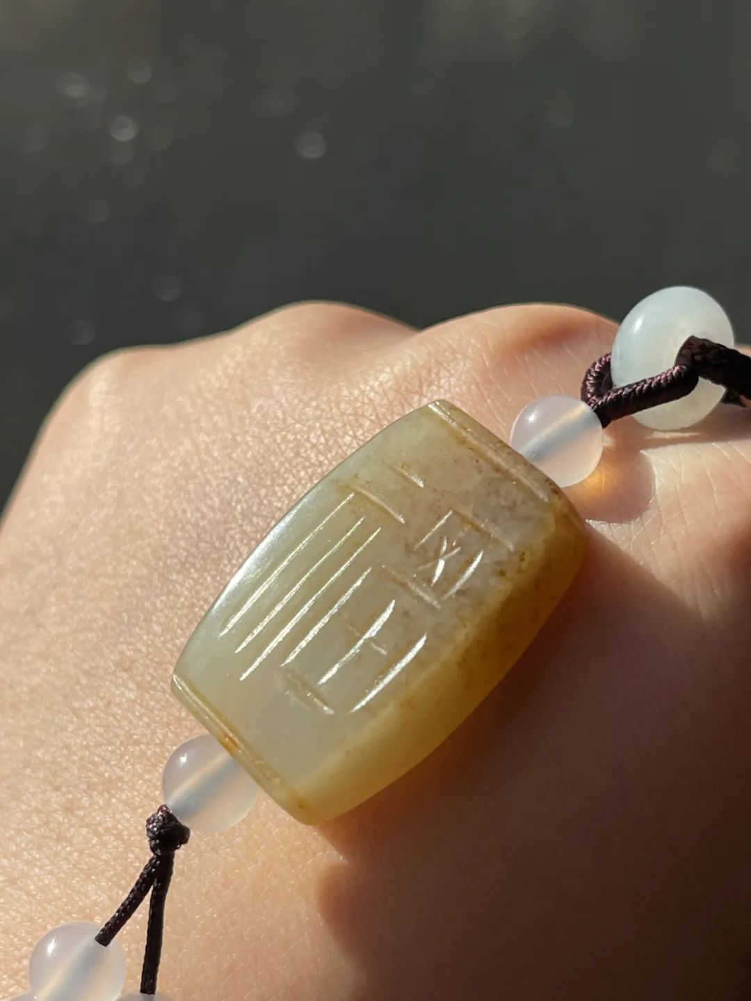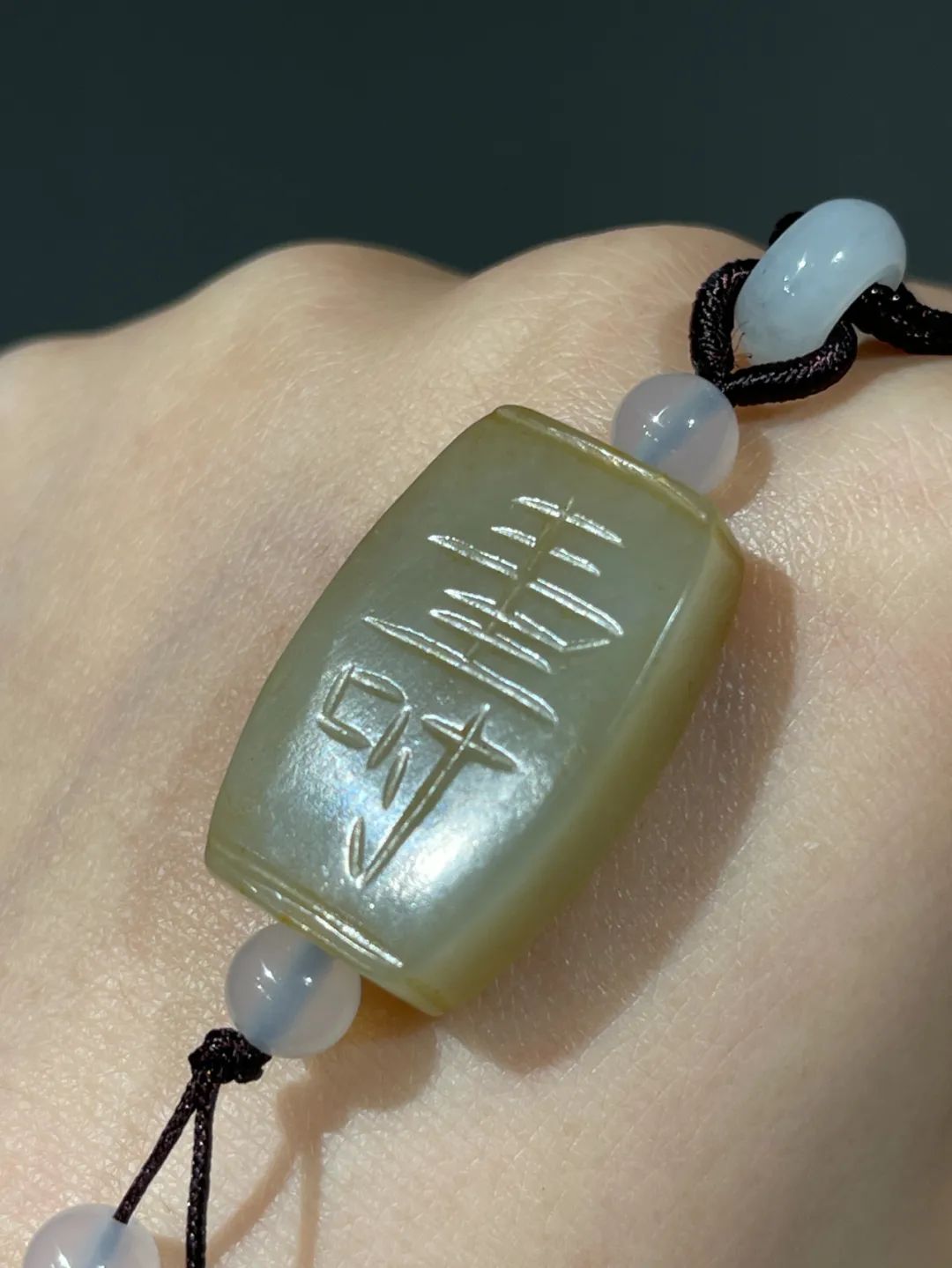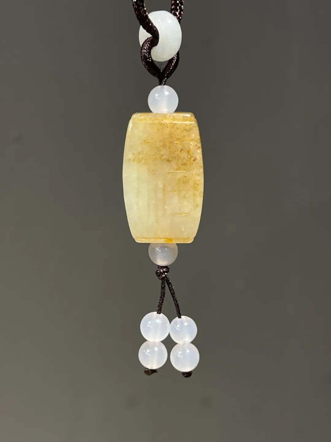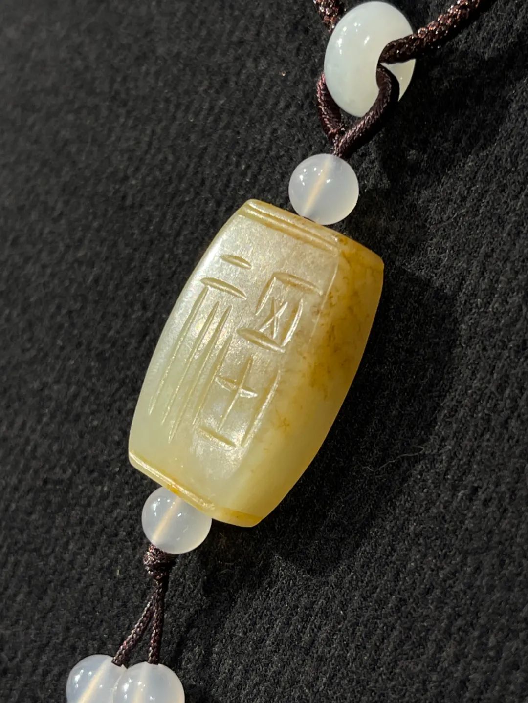 此粒糖沁籽料白玉雕福壽纹扁形勒子,造型典雅,纹饰细致华丽,籽料玉质温润细腻,搭配白玉配珠与绳结设计成绳结吊坠,入手即可佩戴,男女皆宜高贵大气,或是可以融入当代珠宝首饰设计,色泽生动,纹饰精美贵气,是首饰设计师可以尽情创想的难得糖沁沁白玉勒子。