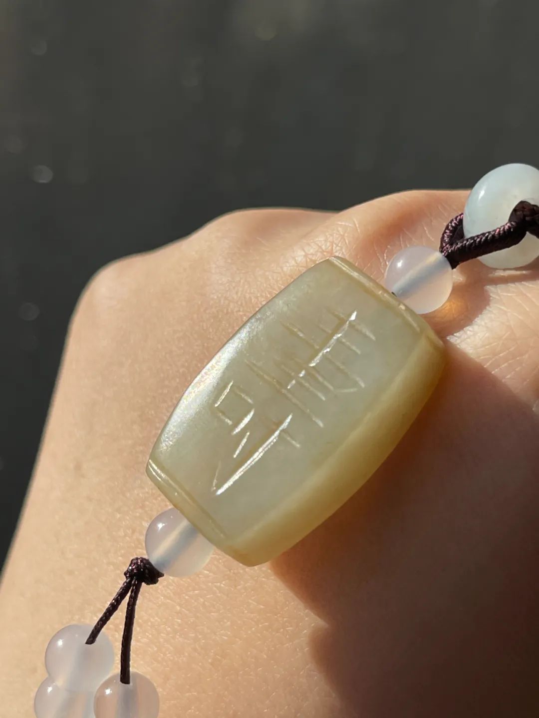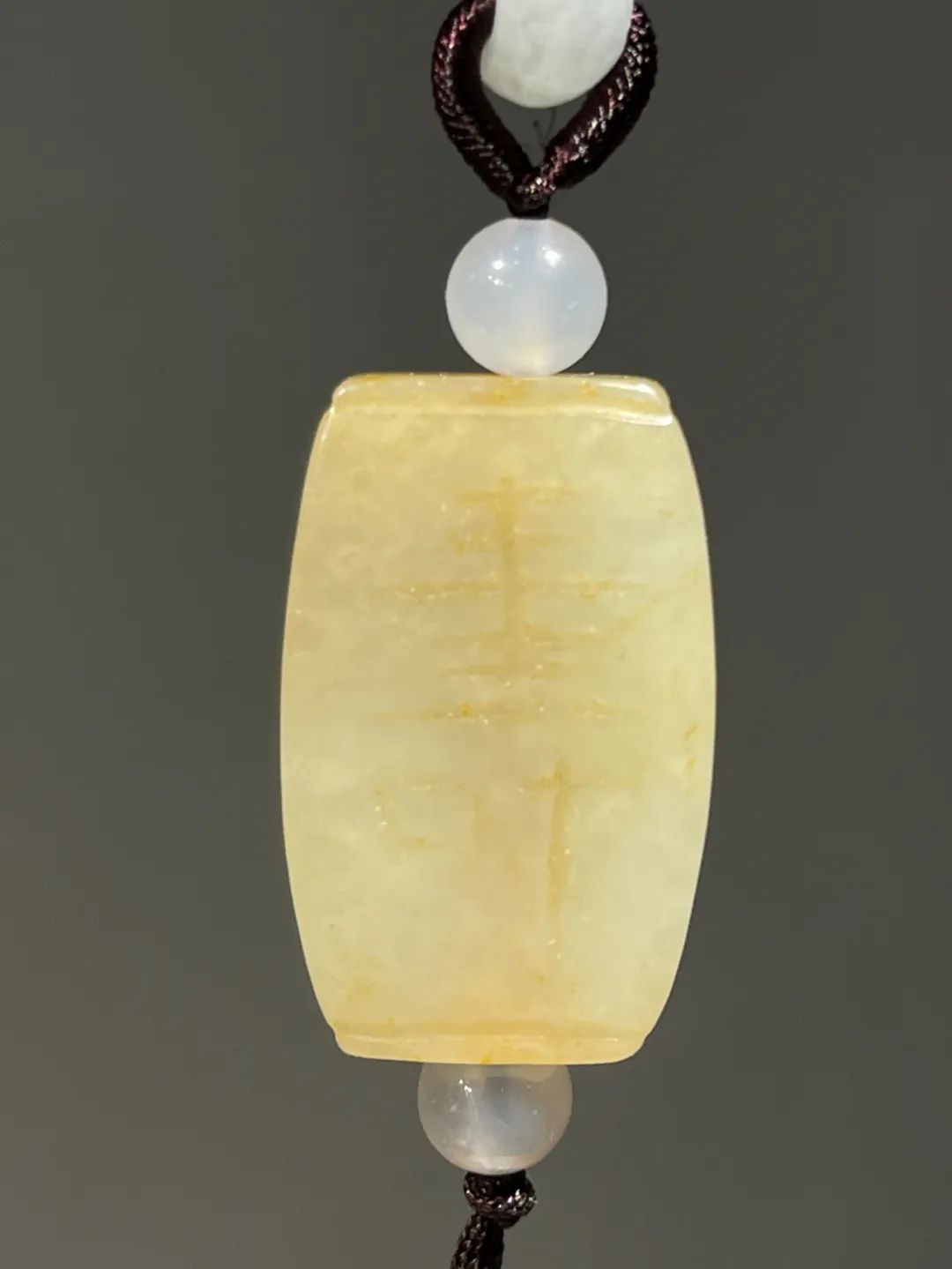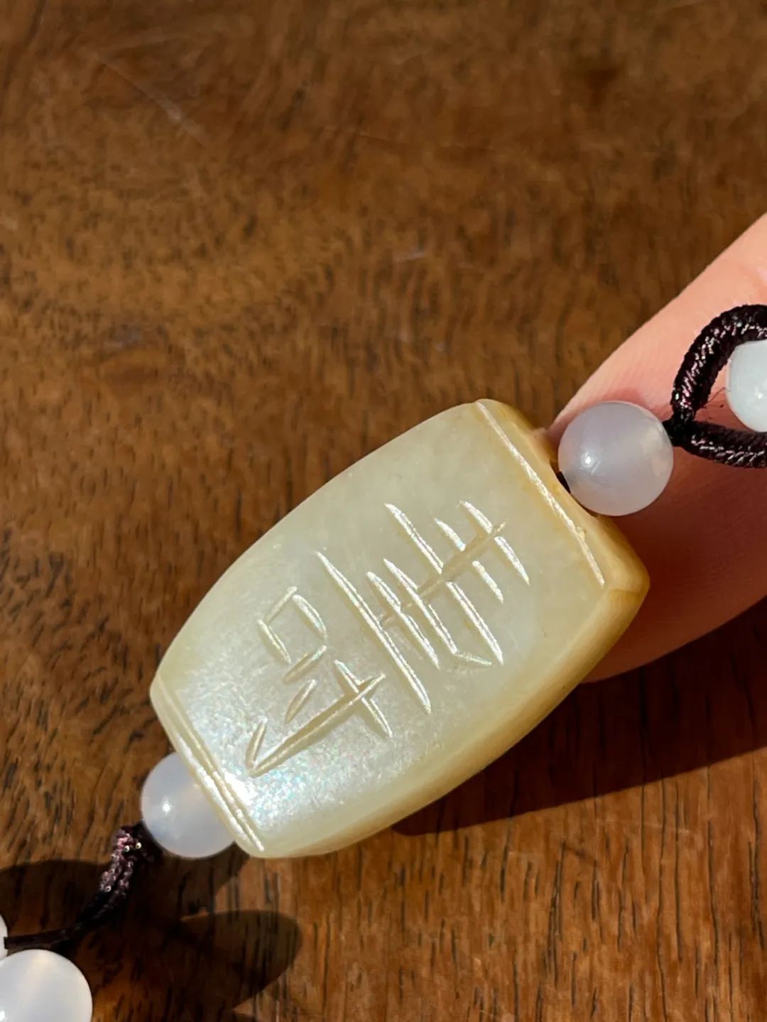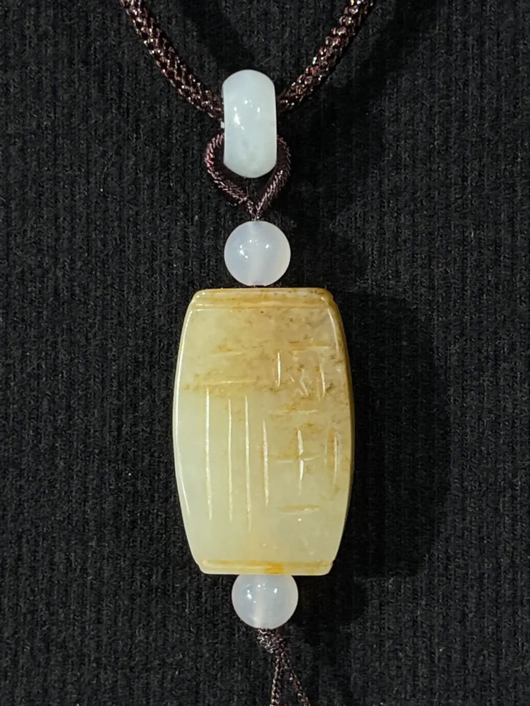 此粒糖沁籽料白玉雕福壽纹扁形勒子,造型典雅,纹饰细致华丽,籽料玉质温润细腻,搭配白玉配珠与绳结设计成绳结吊坠,入手即可佩戴,男女皆宜高贵大气,或是可以融入当代珠宝首饰设计,色泽生动,纹饰精美贵气,是首饰设计师可以尽情创想的难得糖沁沁白玉勒子。