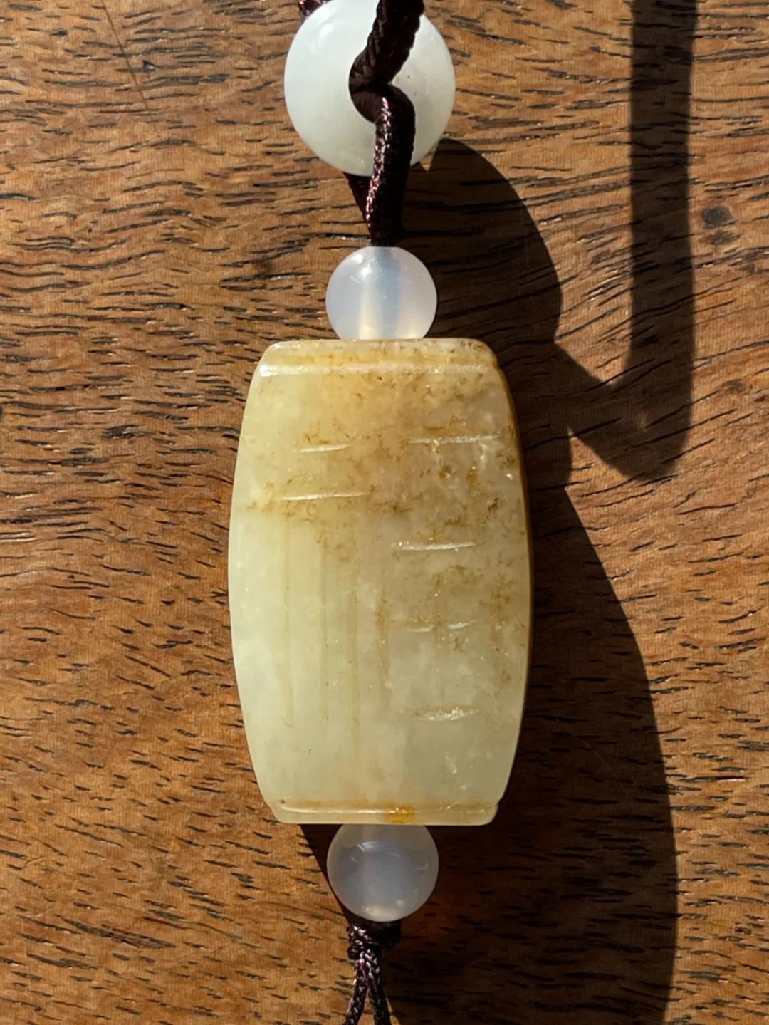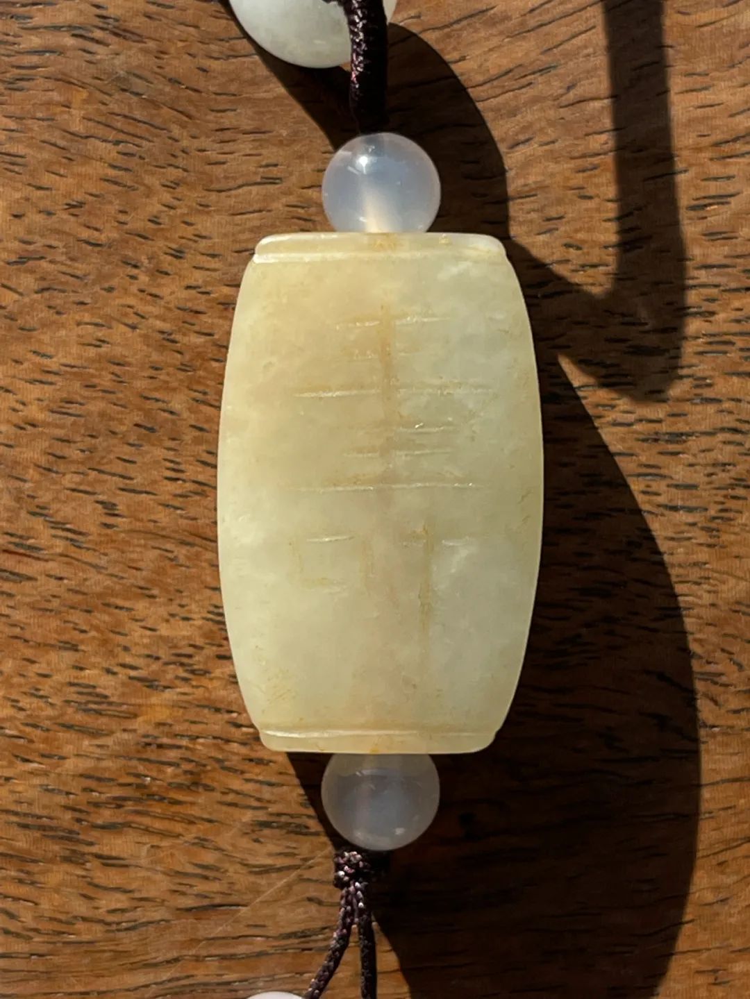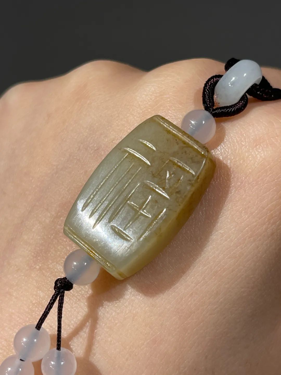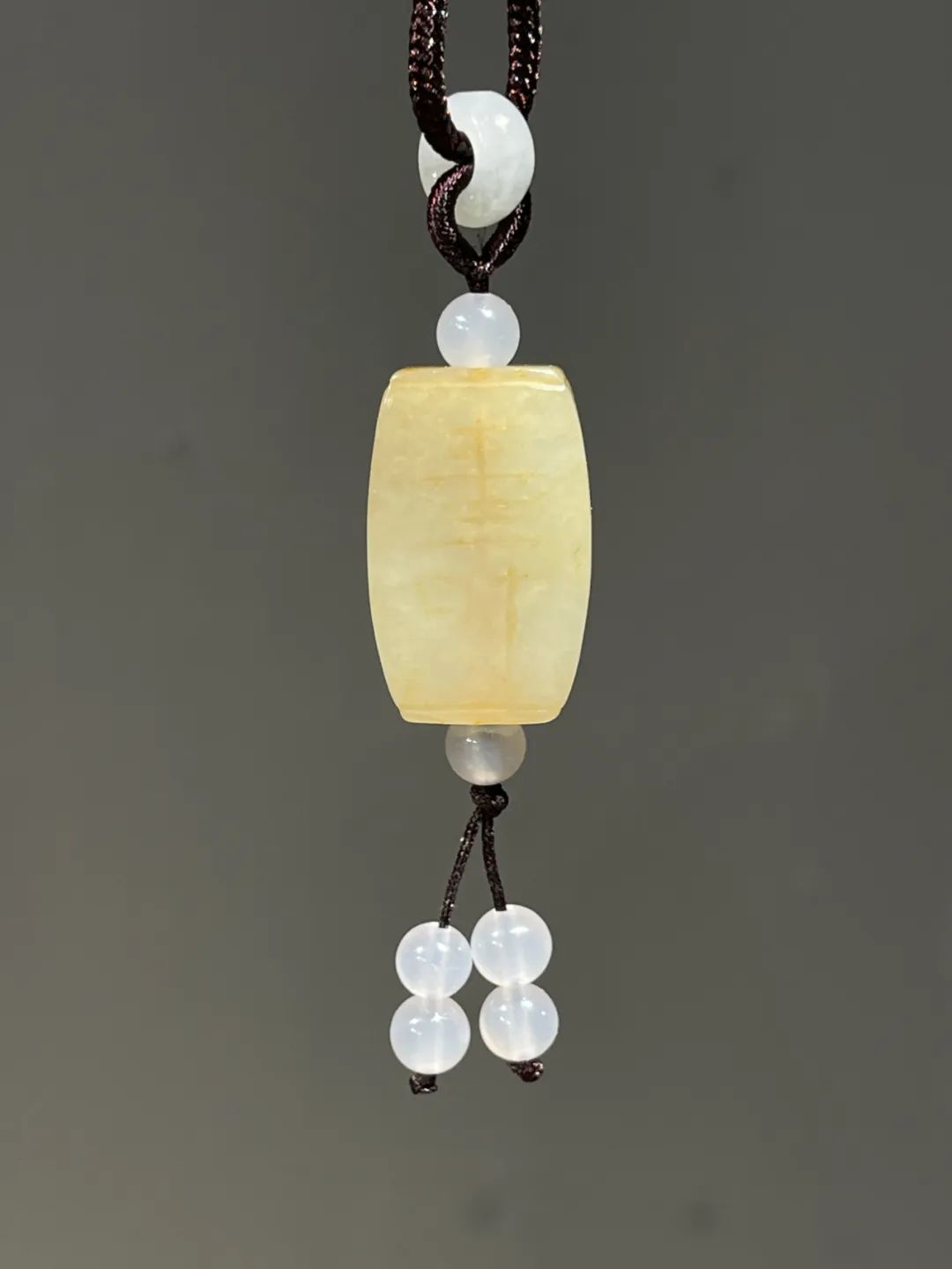 此粒糖沁籽料白玉雕福壽纹扁形勒子,造型典雅,纹饰细致华丽,籽料玉质温润细腻,搭配白玉配珠与绳结设计成绳结吊坠,入手即可佩戴,男女皆宜高贵大气,或是可以融入当代珠宝首饰设计,色泽生动,纹饰精美贵气,是首饰设计师可以尽情创想的难得糖沁沁白玉勒子。