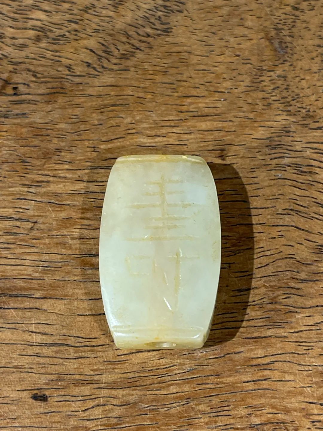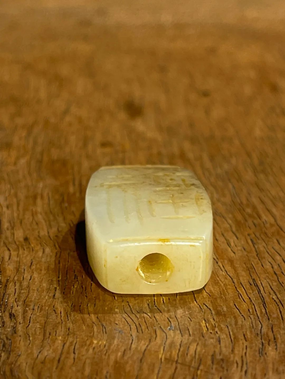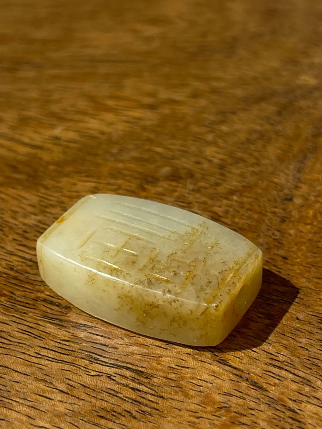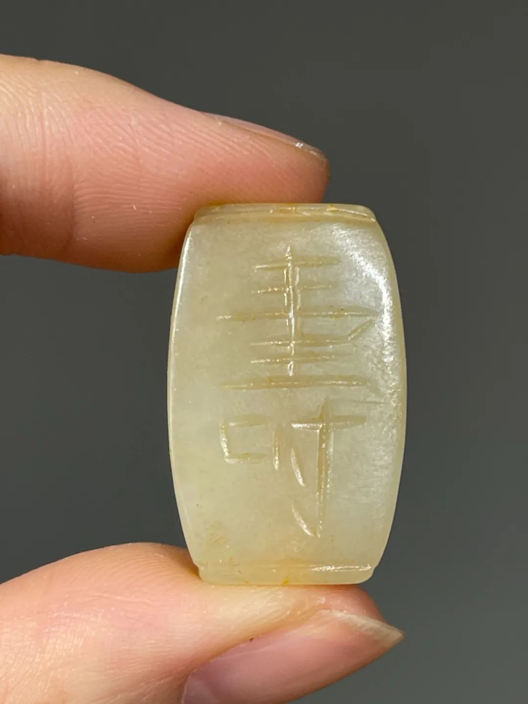 这是一粒糖沁籽料白玉雕福壽纹扁形勒子,白底糖沁和田玉雕琢四方扁形勒子,正反面各阴刻“福”“壽”字,纹样字体设计典雅,造形独特、刻工精致、和田籽料糖沁色泽生动流畅,质地堅硬细腻,打磨细腻油亮温润。