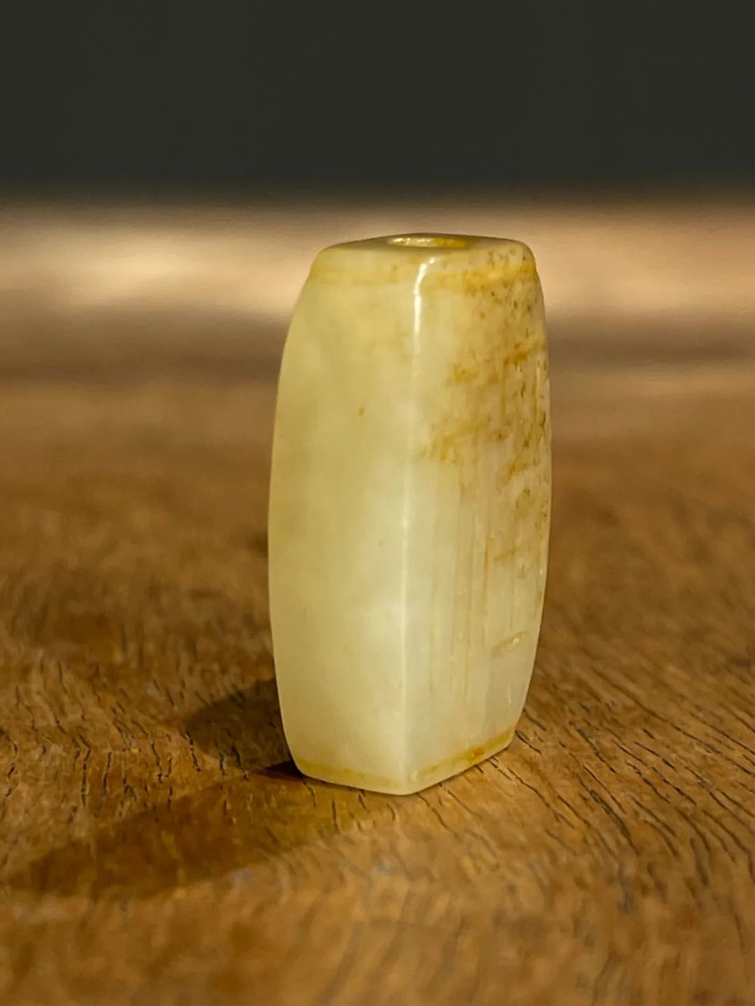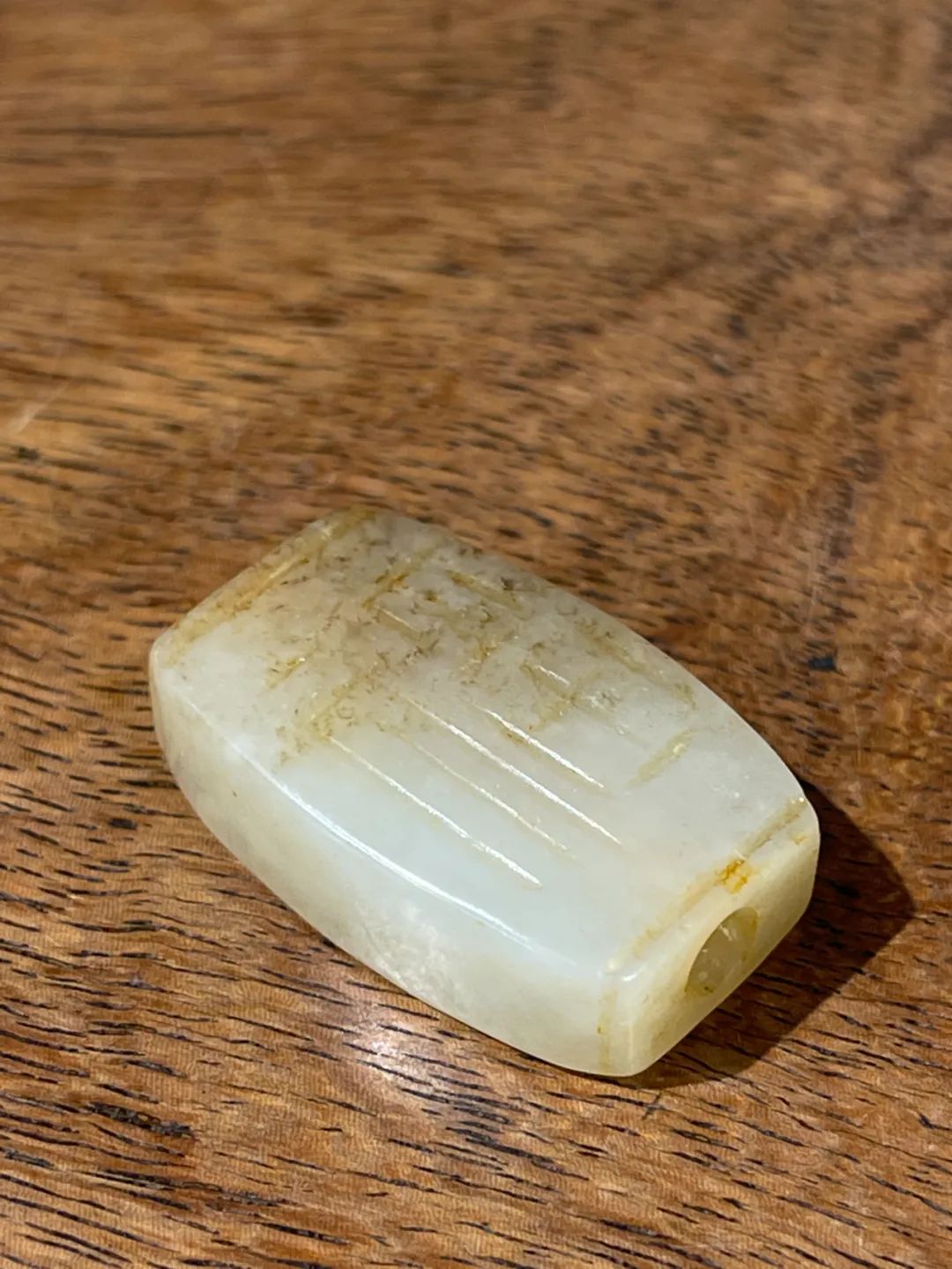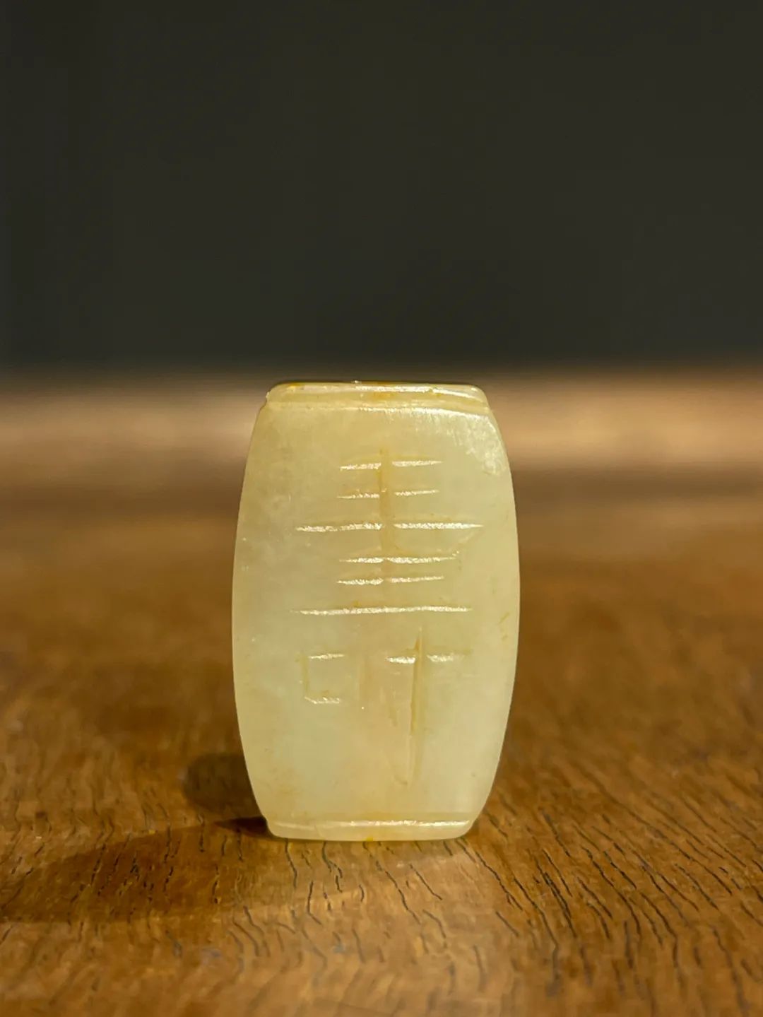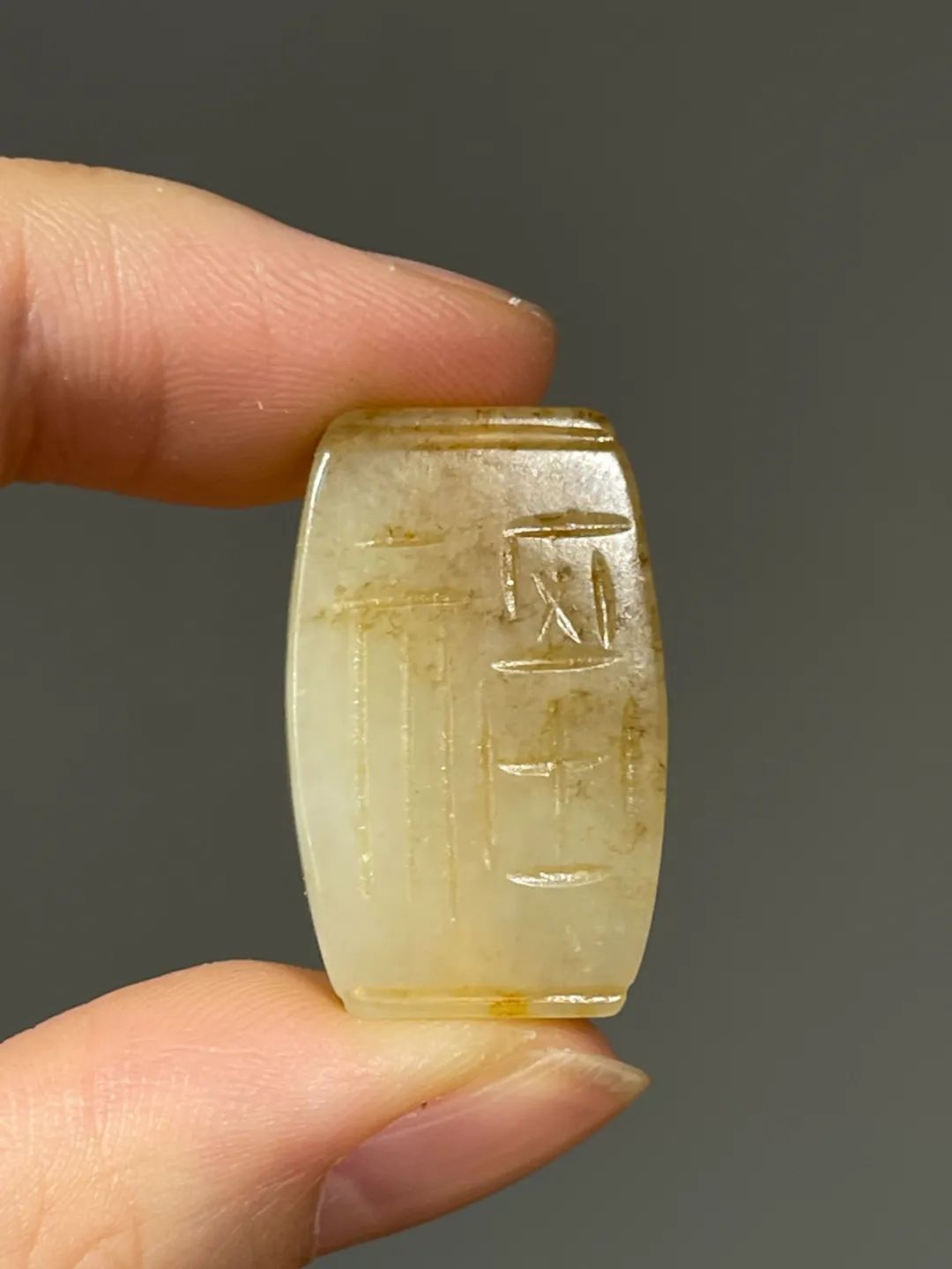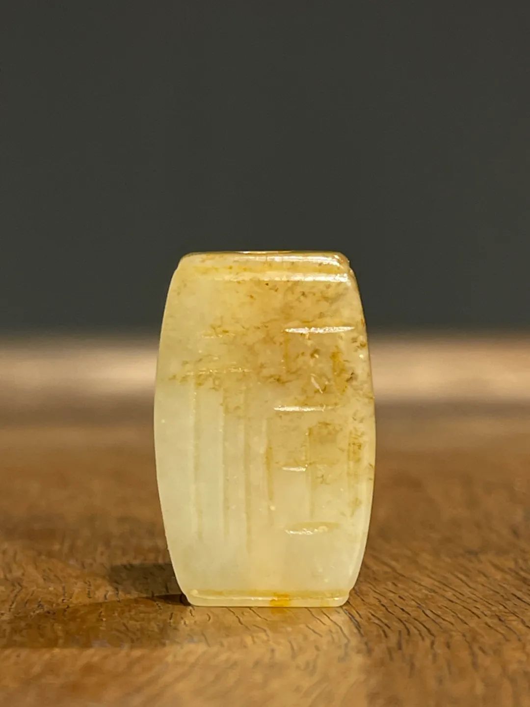这是一粒糖沁籽料白玉雕福壽纹扁形勒子,白底糖沁和田玉雕琢四方扁形勒子,正反面各阴刻“福”“壽”字,纹样字体设计典雅,造形独特、刻工精致、和田籽料糖沁色泽生动流畅,质地堅硬细腻,打磨细腻油亮温润。