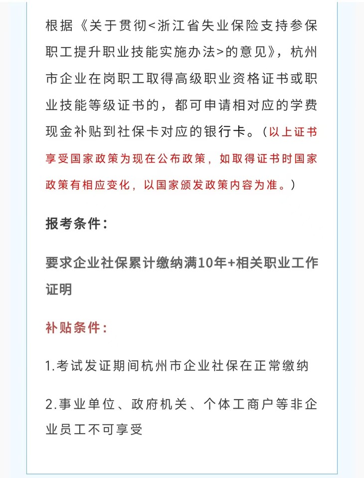 根据《关于贯彻<浙江省失业保险支持参保职工提升职业技能实施办法>的意见》,杭州市企业在岗职工取得高级 中级 职业资格证书或职业技能等级证书的,都可申请相对应的学费现金补贴到社保卡对应的银行卡,补贴(以上证书享受国家政策为现在公布政策,如取得证书时国家政策有相应变化,以国家颁发政策内容为准。)