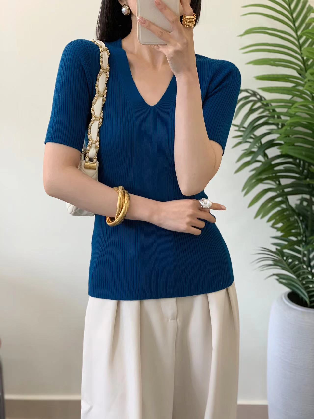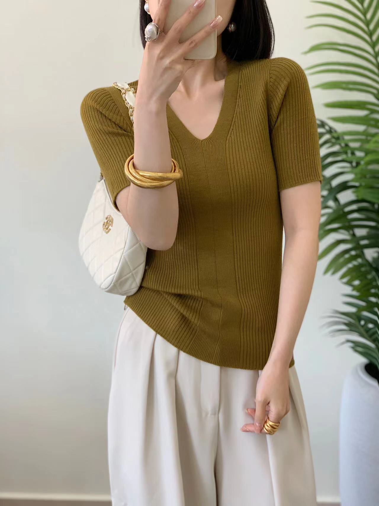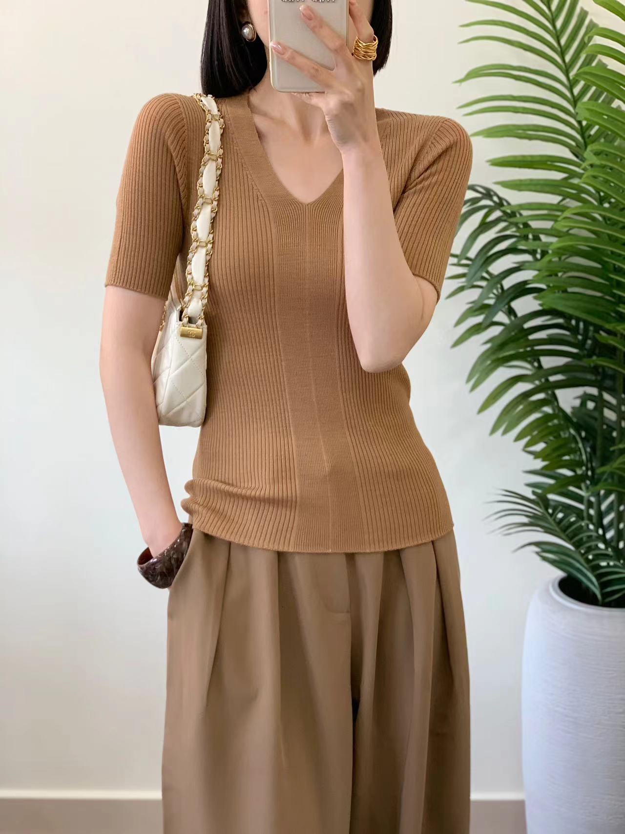 精纺羊毛无缝短袖针织衫 100%羊毛 基础版型好打理 版型合身但不紧绷 全成型无缝织造工艺 纵向纹理显瘦不变形 V领设计很实穿