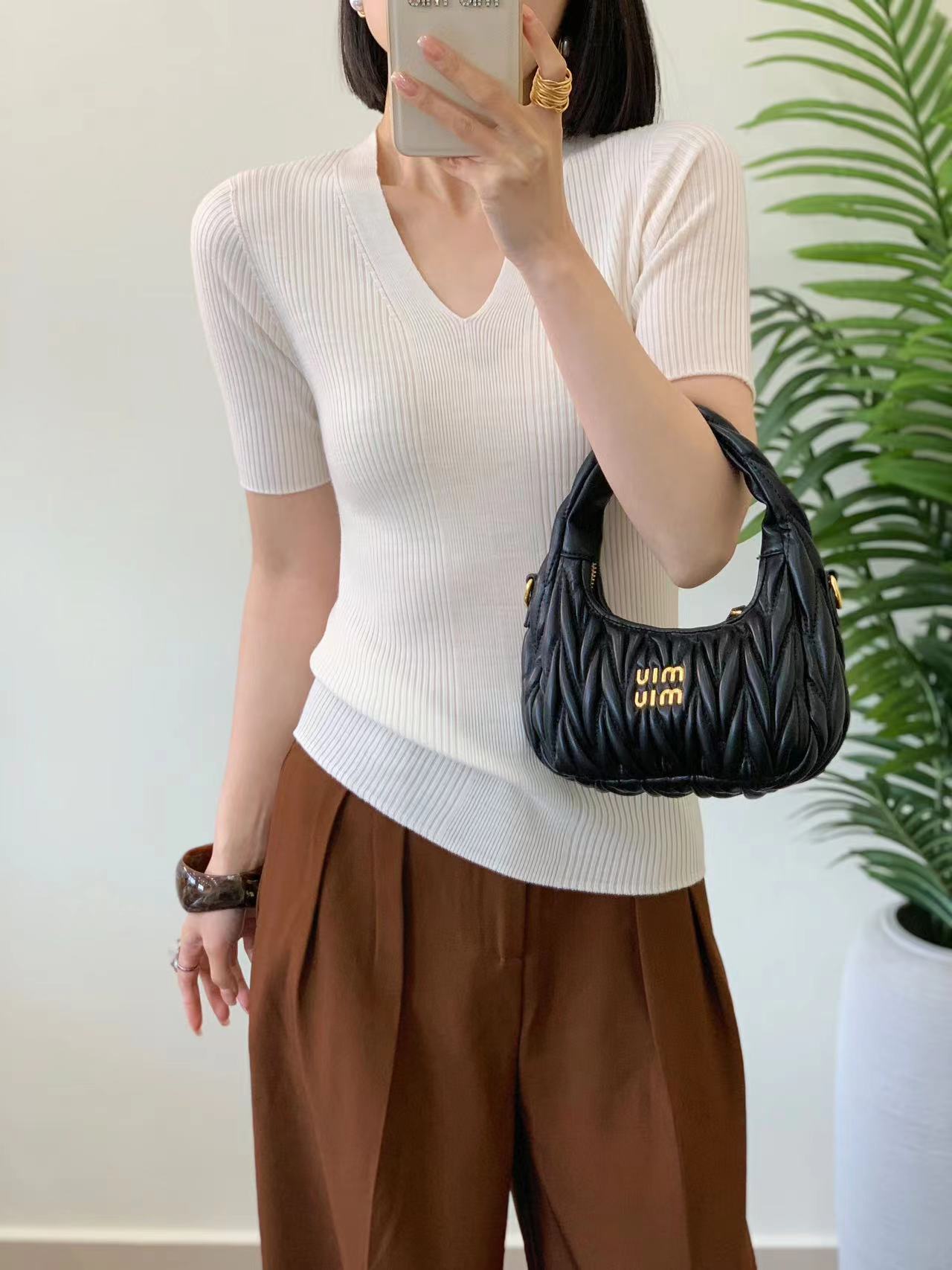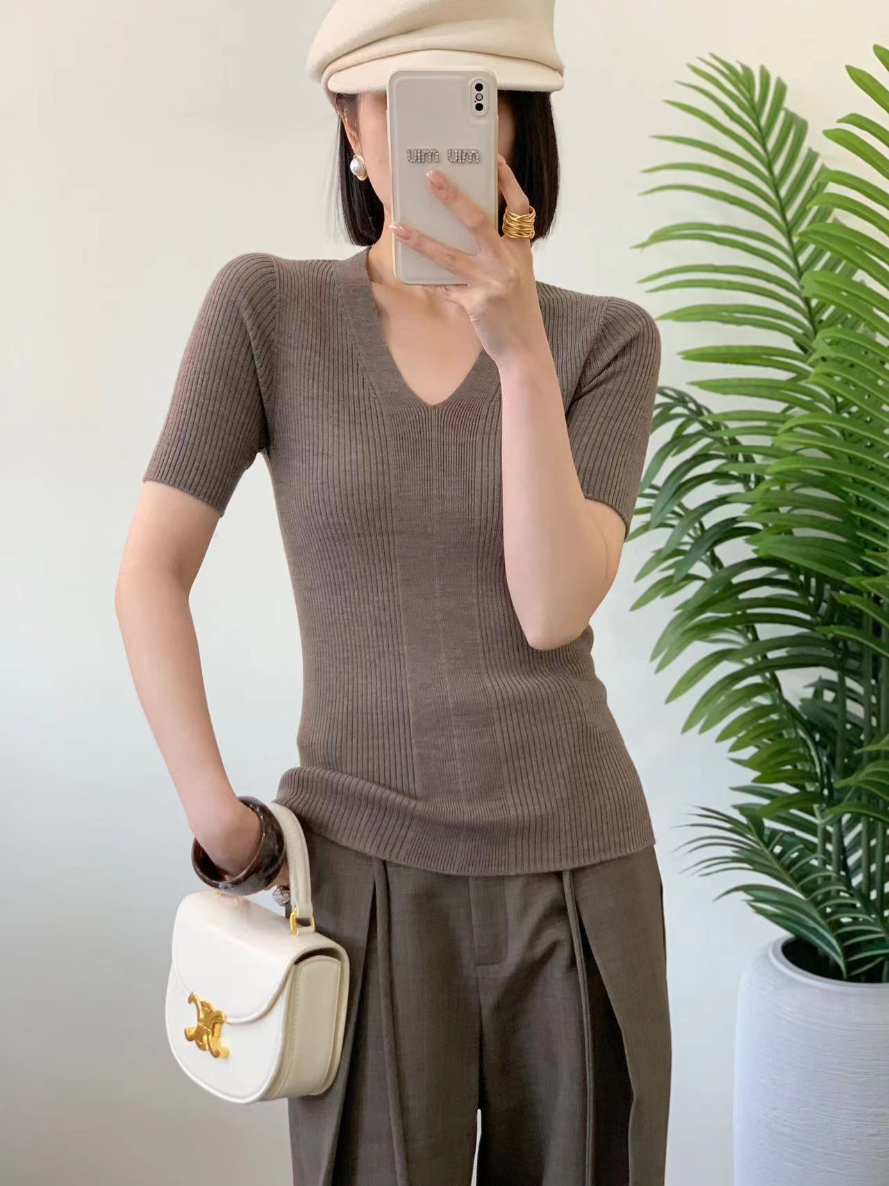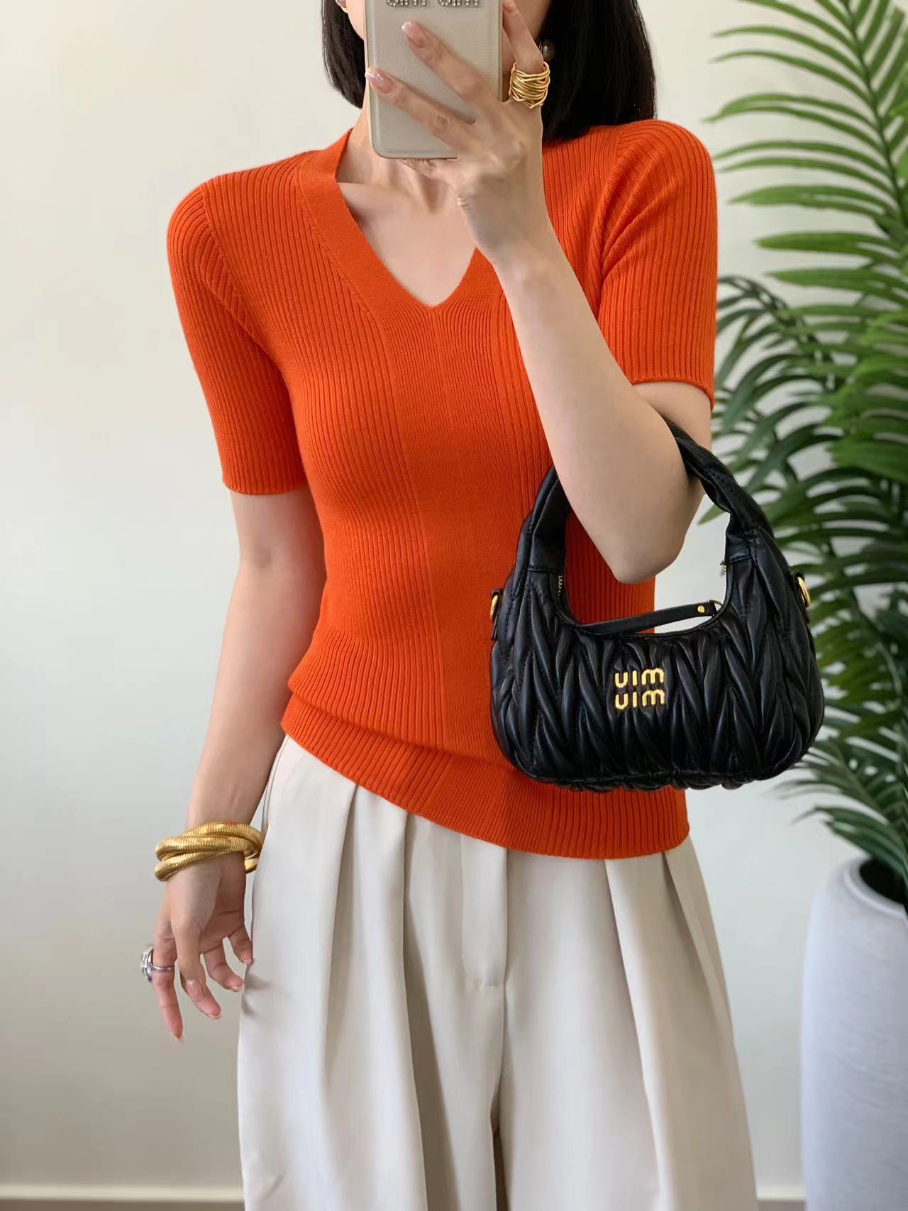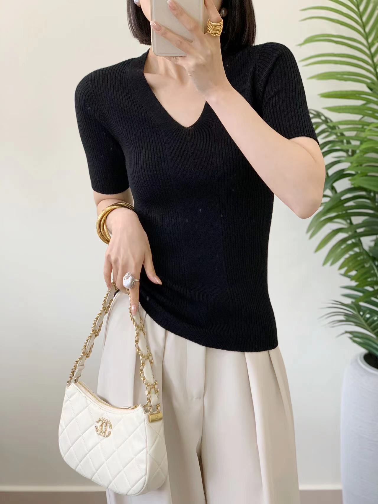 精纺羊毛无缝短袖针织衫 100%羊毛 基础版型好打理 版型合身但不紧绷 全成型无缝织造工艺 纵向纹理显瘦不变形 V领设计很实穿