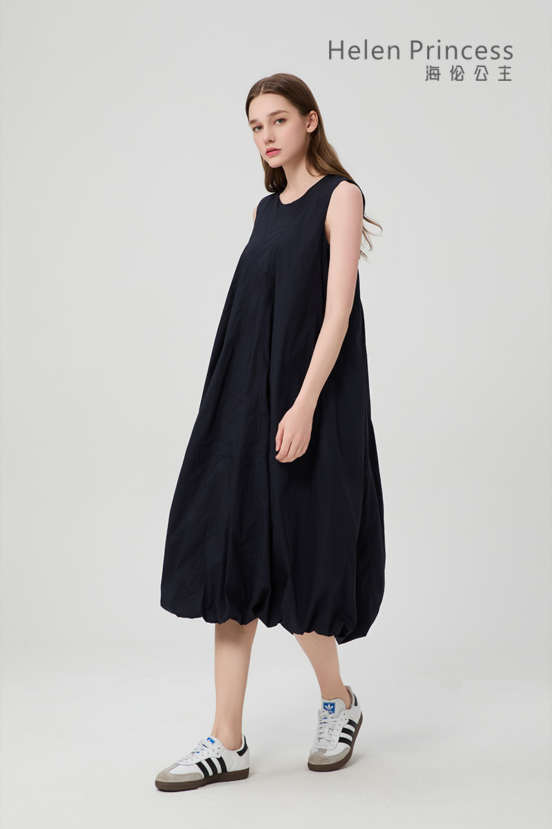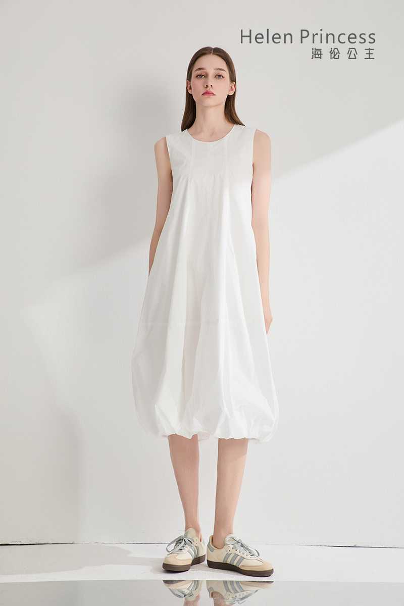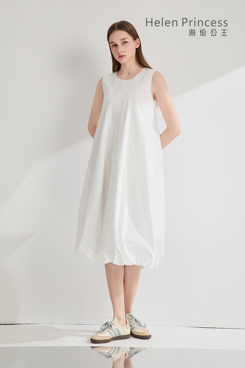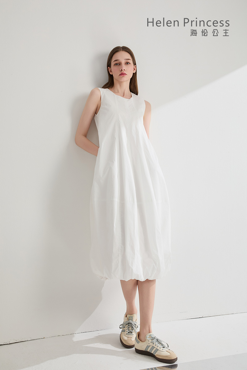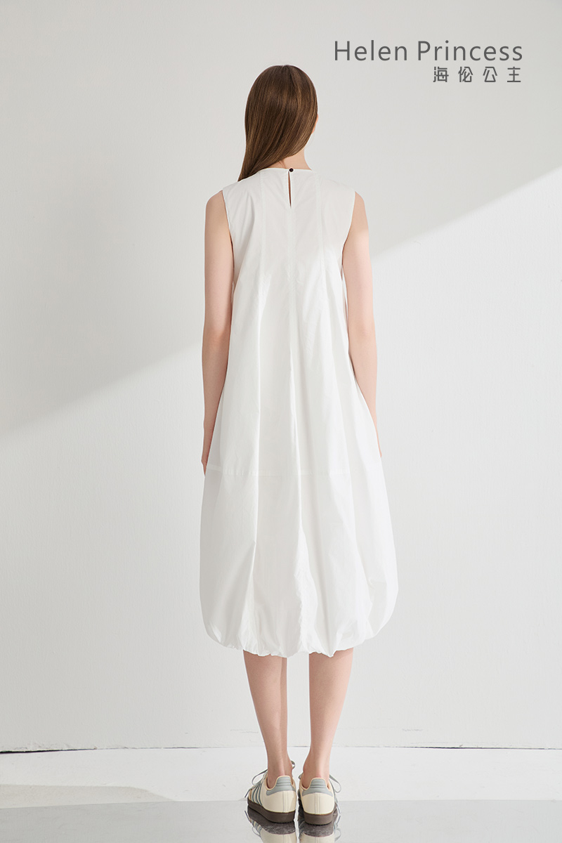圆领的造型经典又百搭,适合各种脸型和场合,无袖的设计,尽显柔美气质,裙摆的松紧边花苞设计,轻盈而灵动,同时又极具层次感和立体感。