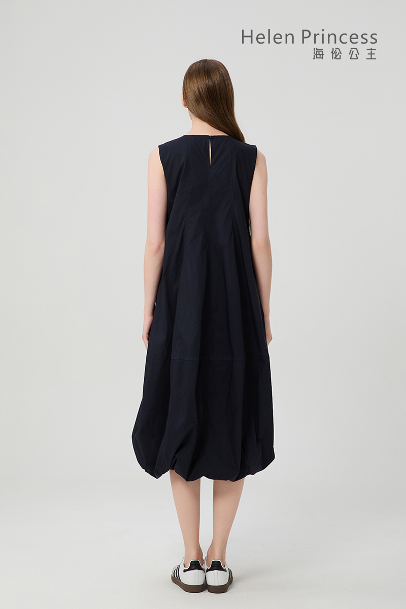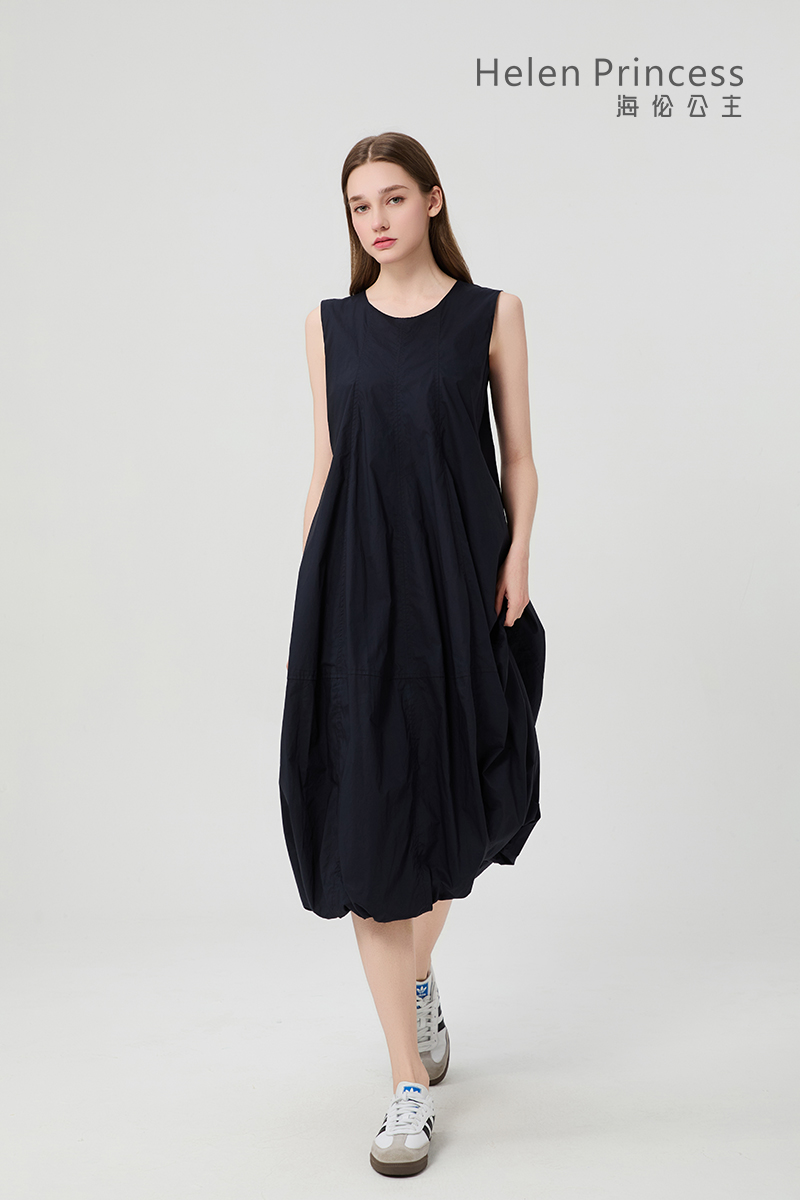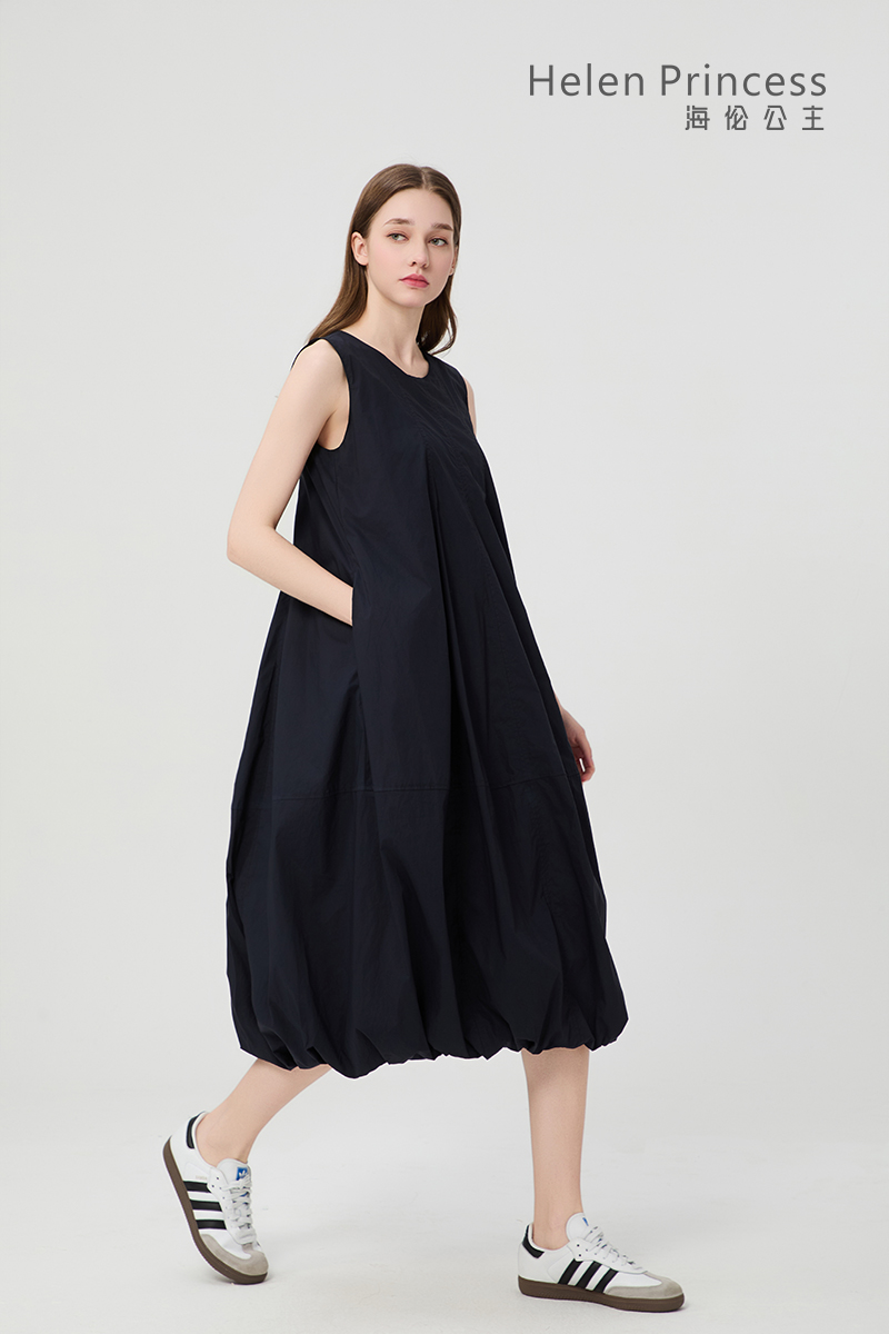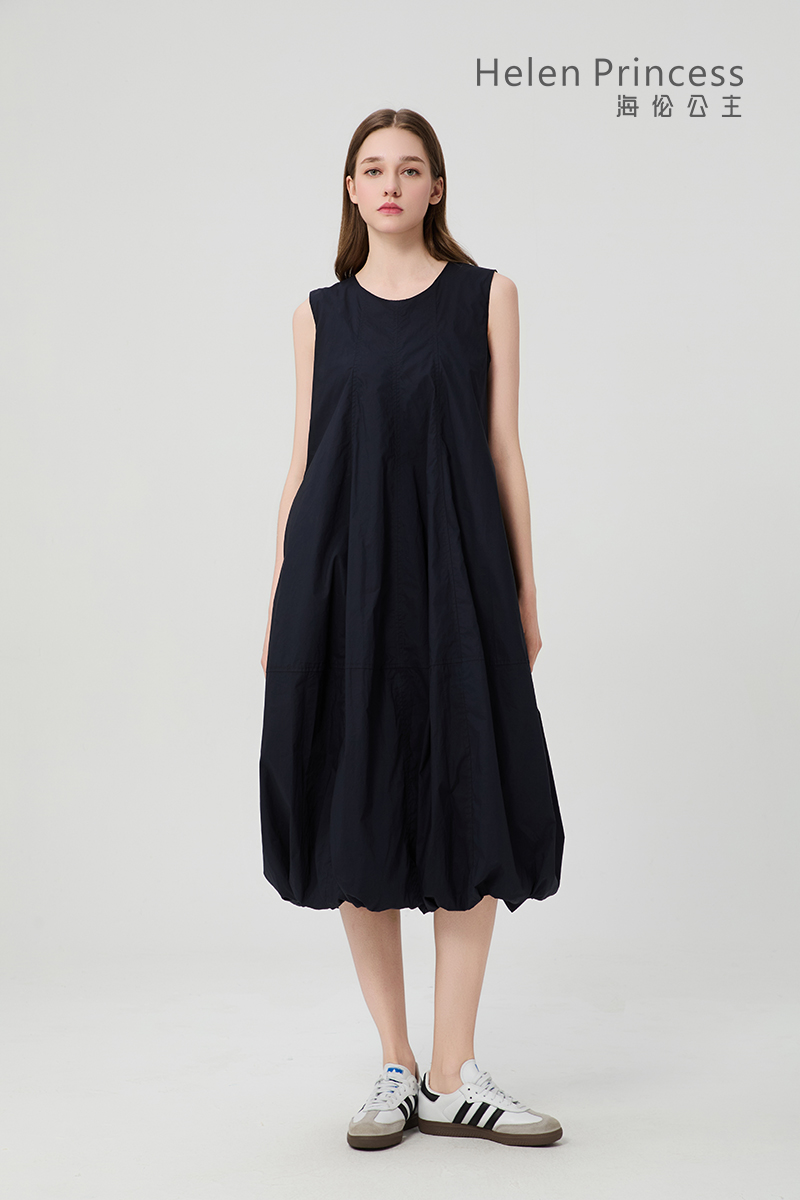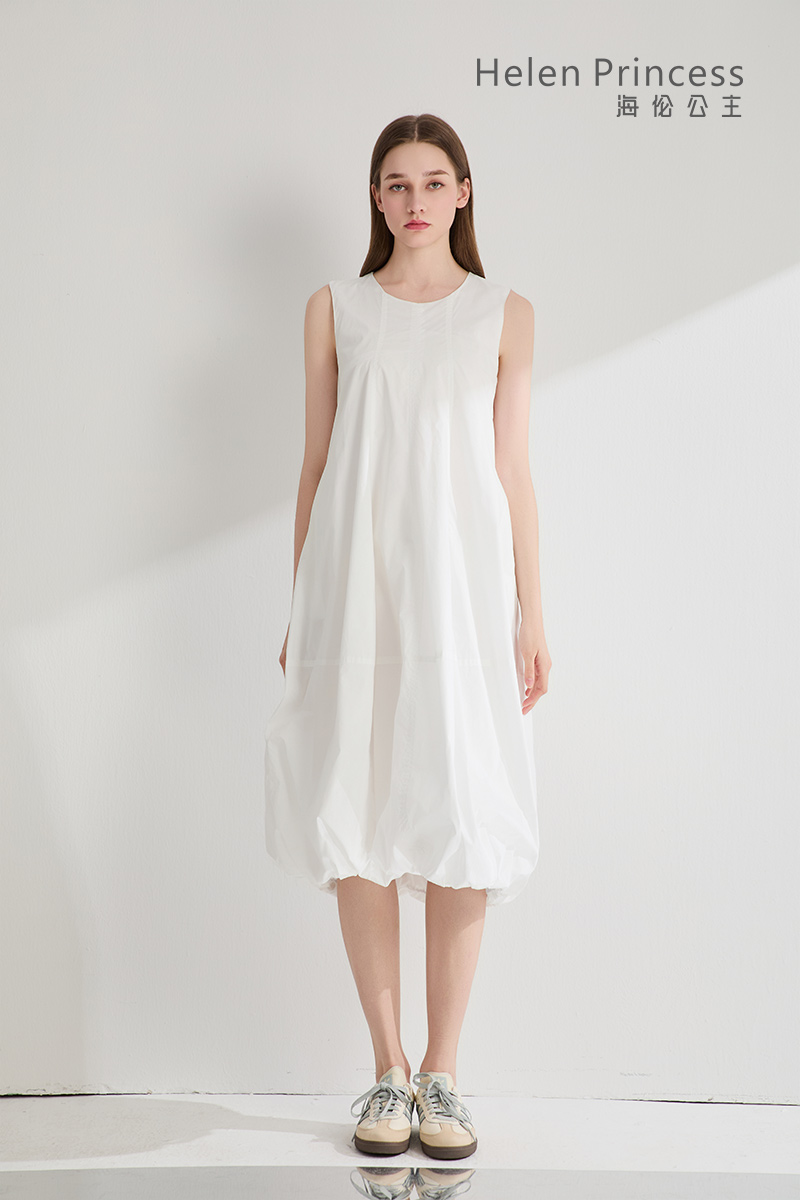 圆领的造型经典又百搭,适合各种脸型和场合,无袖的设计,尽显柔美气质,裙摆的松紧边花苞设计,轻盈而灵动,同时又极具层次感和立体感。