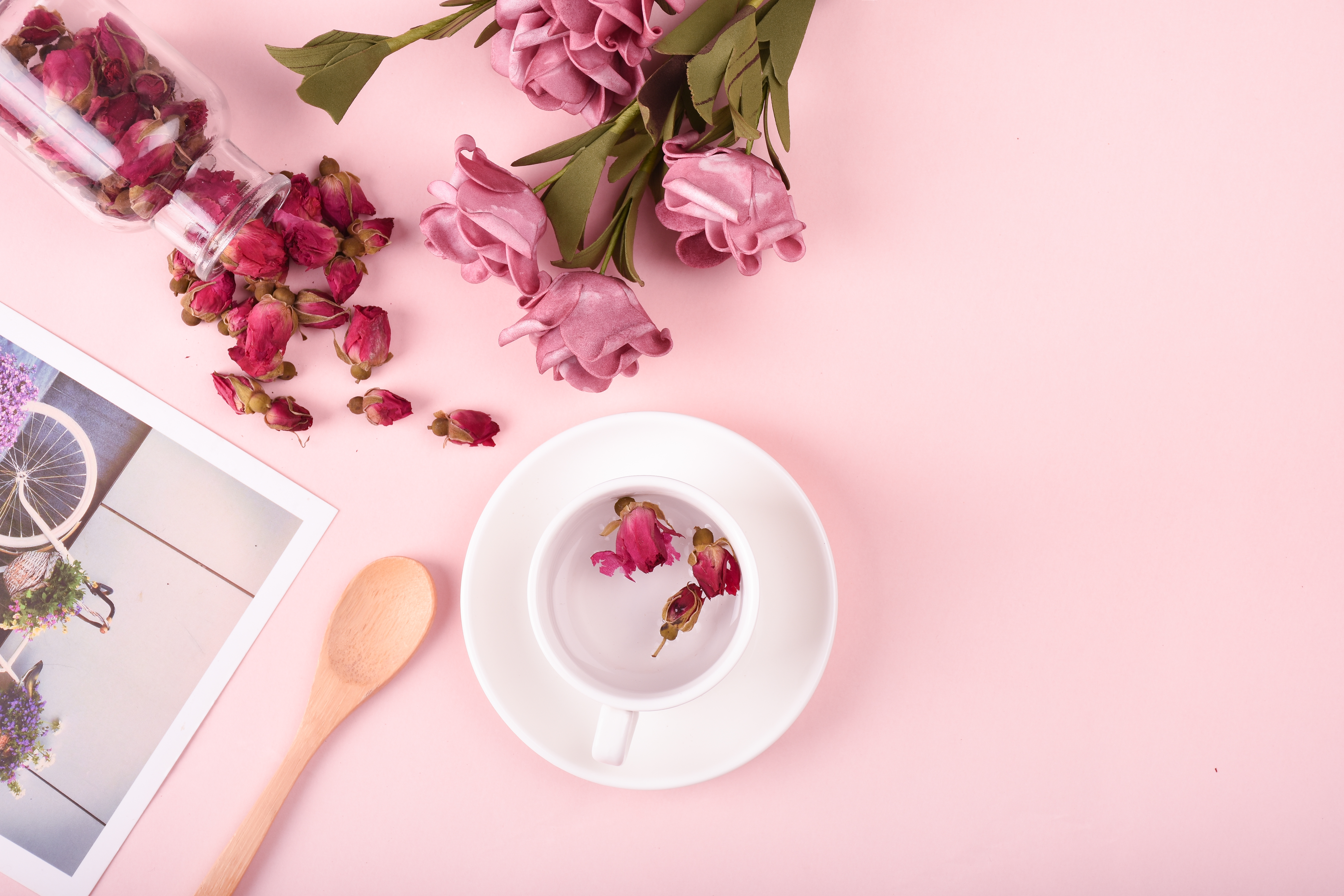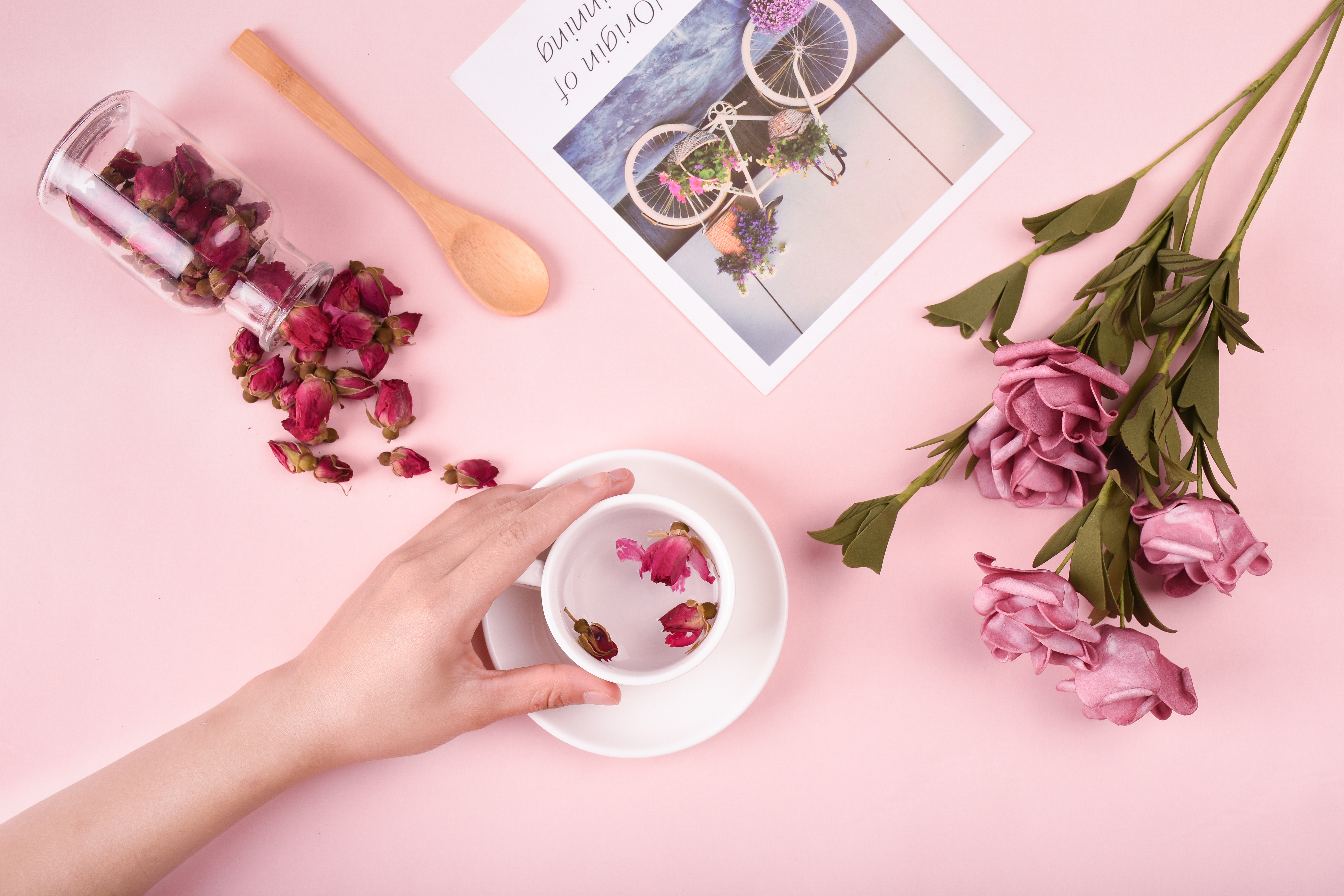 玫瑰花含丰富的维生素A、C、B、E、K,以及单宁酸,能改善内分泌失调,对消除疲劳和伤口愈合也有帮助。调气血,调理女性生理问题,促进血液循环,美容,调经,利尿,缓和肠胃神经,防皱纹,防冻伤,养颜美容。常喝玫瑰花茶,还能帮助清肠道、助消化、去口臭、消脂肪。满口花香,由里至外,散发迷人的气息。经常加班、熬夜、应酬的人可以多饮玫瑰花茶,可以有效改善睡眠质量,舒缓压力,放松身心,使晦暗、干燥、松弛的皮肤重回弹润活力