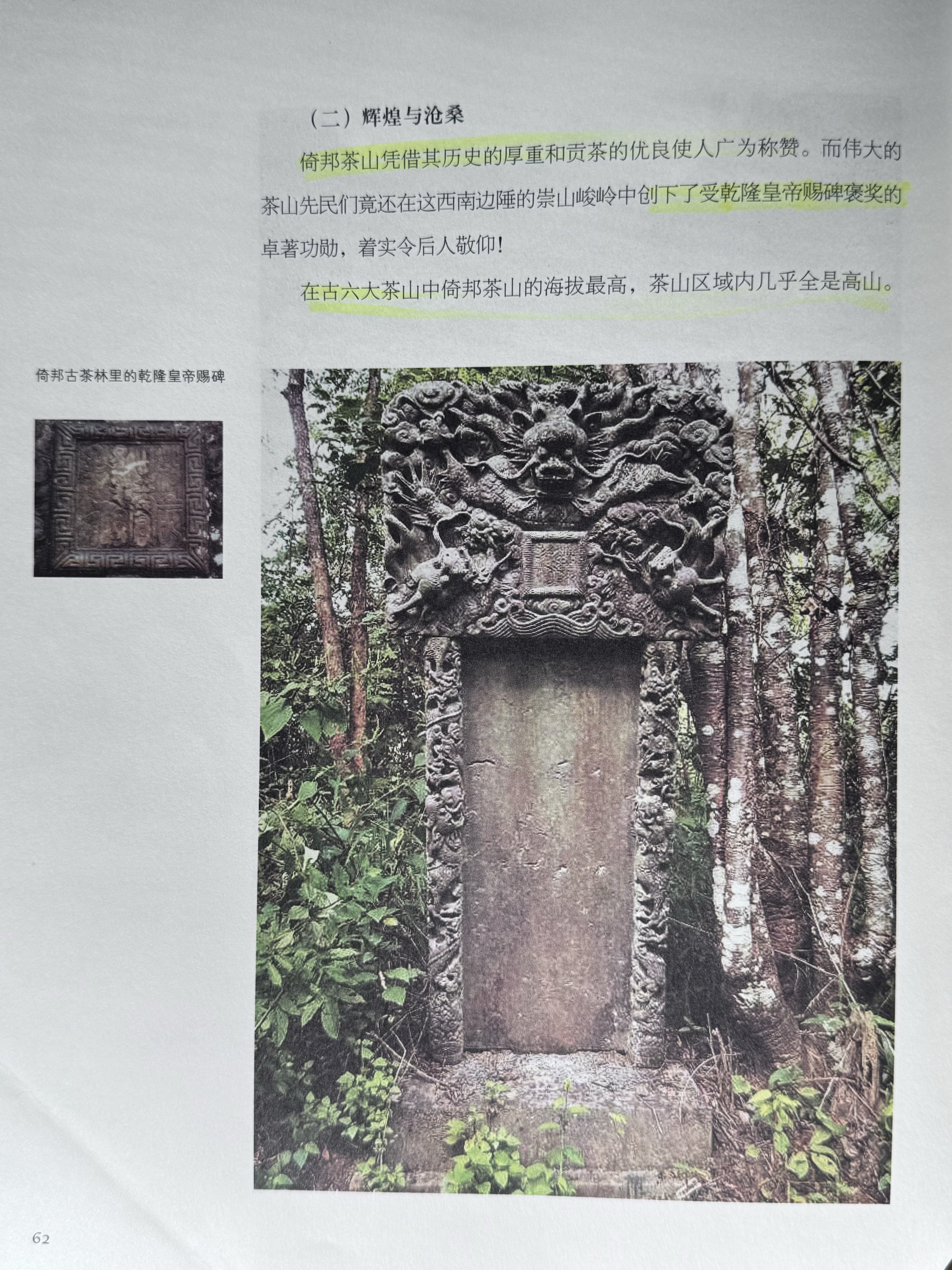 倚邦贡茶,作为普洱茶历史上的璀璨瑰宝,承载着深厚的历史文化底蕴,曾受到乾隆皇帝的赐碑褒奖。