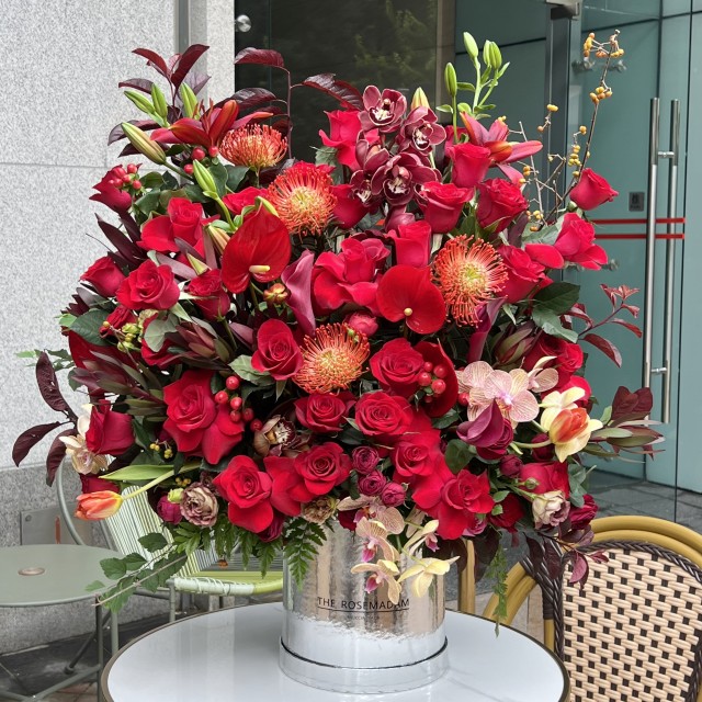 精选花材:红色针垫,海芋,红掌,红色大花惠兰,