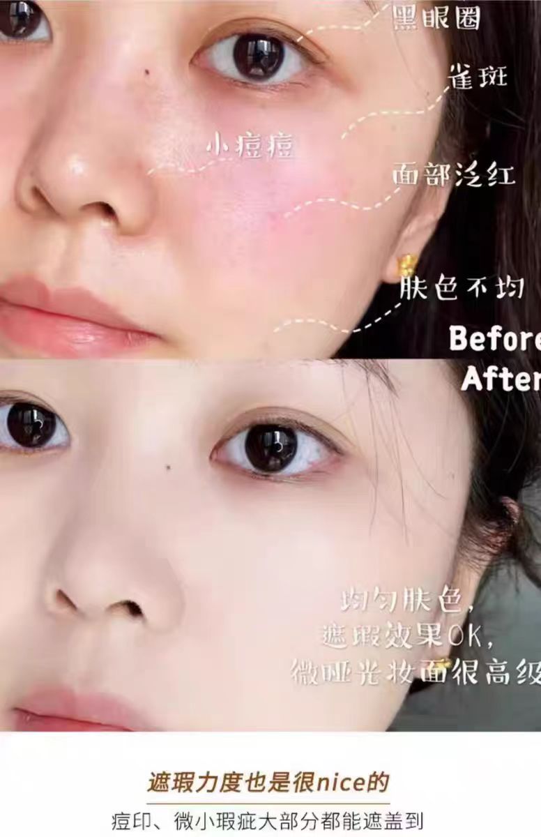 妆感很轻薄,上脸皮肤完全没有负担感,不容易闷痘,遮瑕力适中,能够很好均匀肤色,遮盖泛红、浅色斑点和隐形毛孔!质地流动性很好,而且不会干得太快,顺滑好推开,四个色号可根据自己肤色选择!