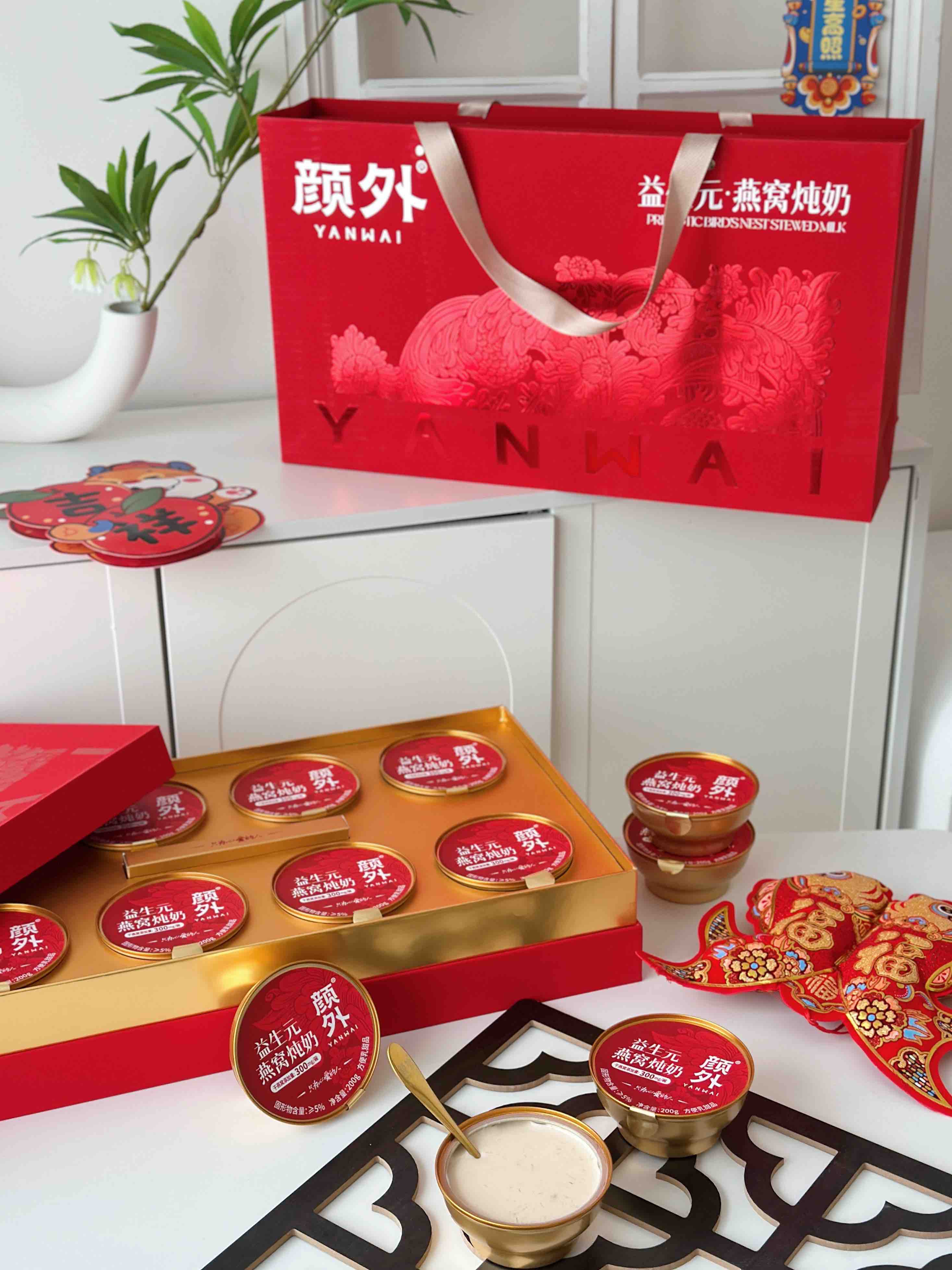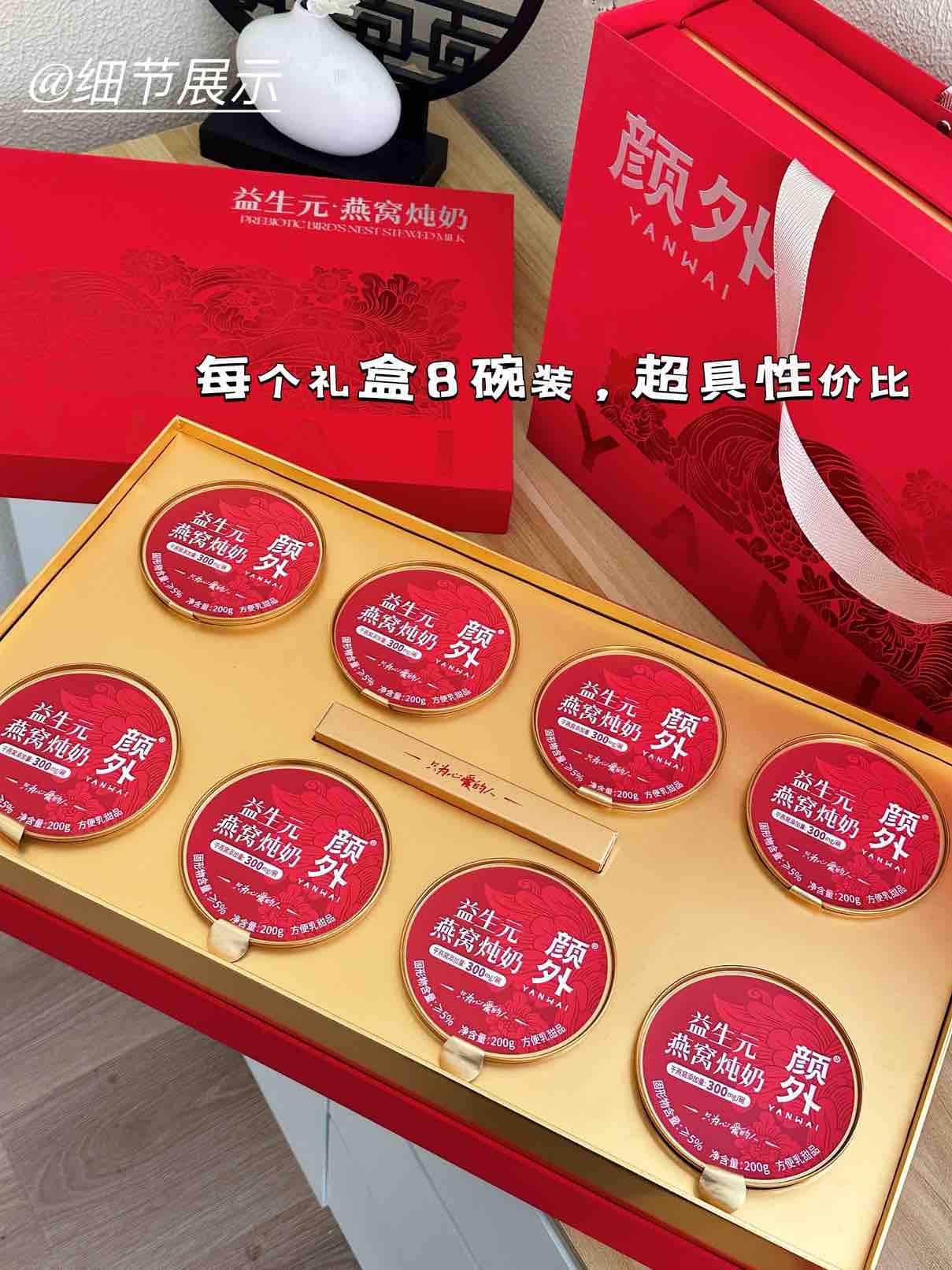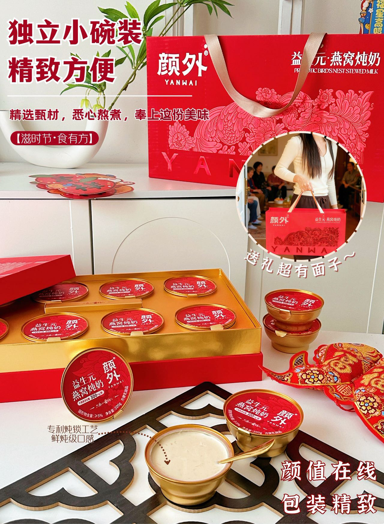 【新年好礼】石家庄优选仓库速达,颜外®益生元·燕窝炖奶,“益生元+燕窝”的组合,既有燕窝的柔润口感, 又带着奶香的清甜~ 200克*8碗/礼盒装