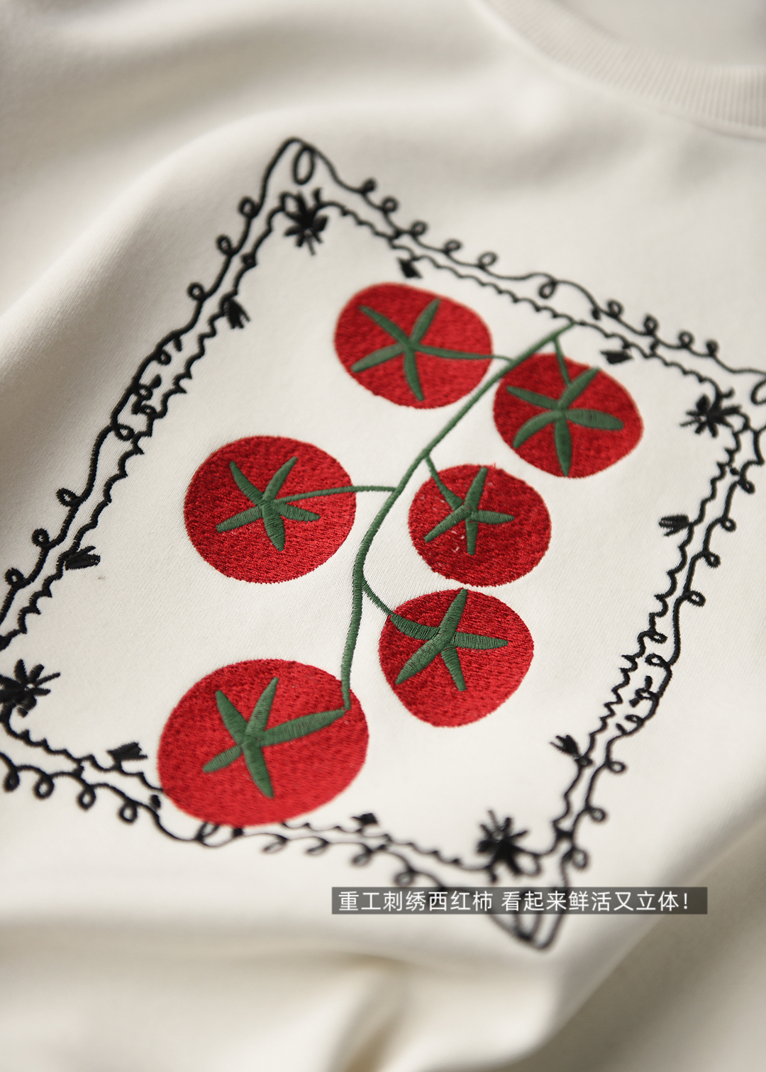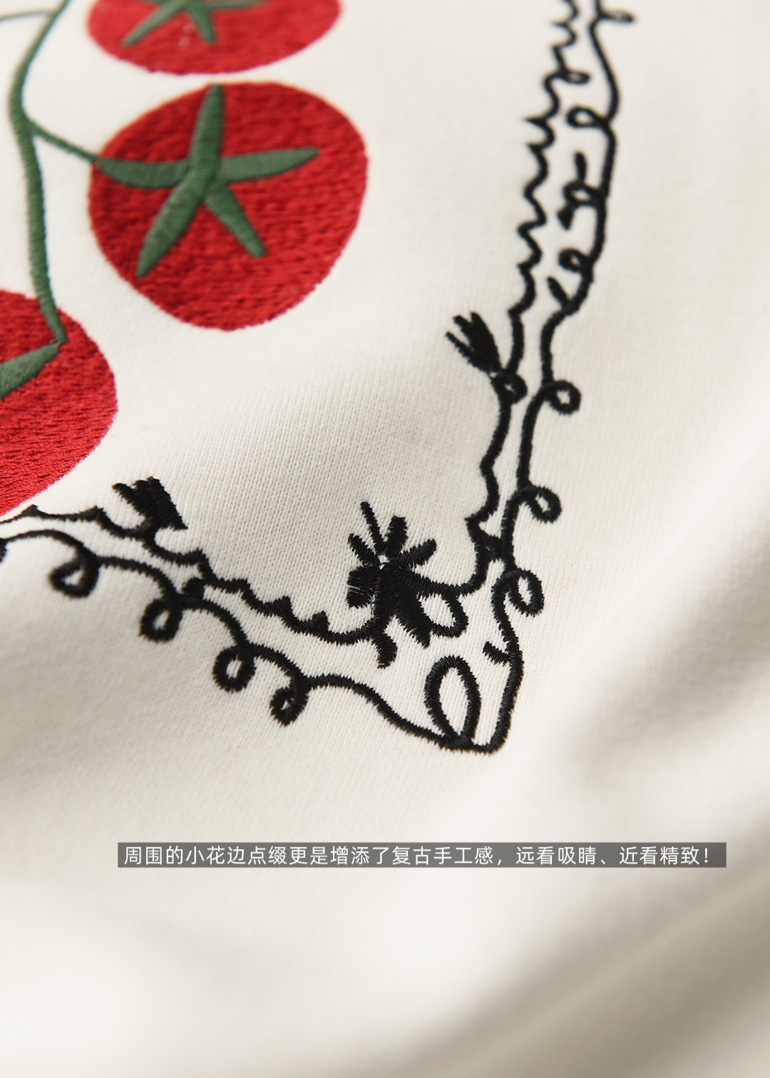 万针线绣西红柿看起来鲜活又立体!周围的小花边点缀更是增添了复古手工感
