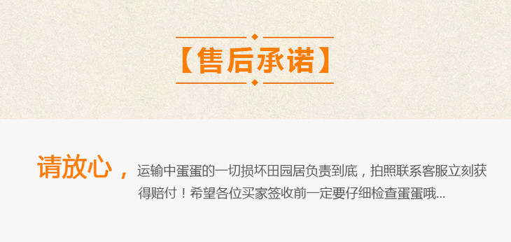 请您收到后请立即开箱检查。如有破损,24小时内拍照(快递面单和商品)联系客服按枚赔付,我们的包装都是专业蛋品包装,安全性、透气性、环保性超好!
