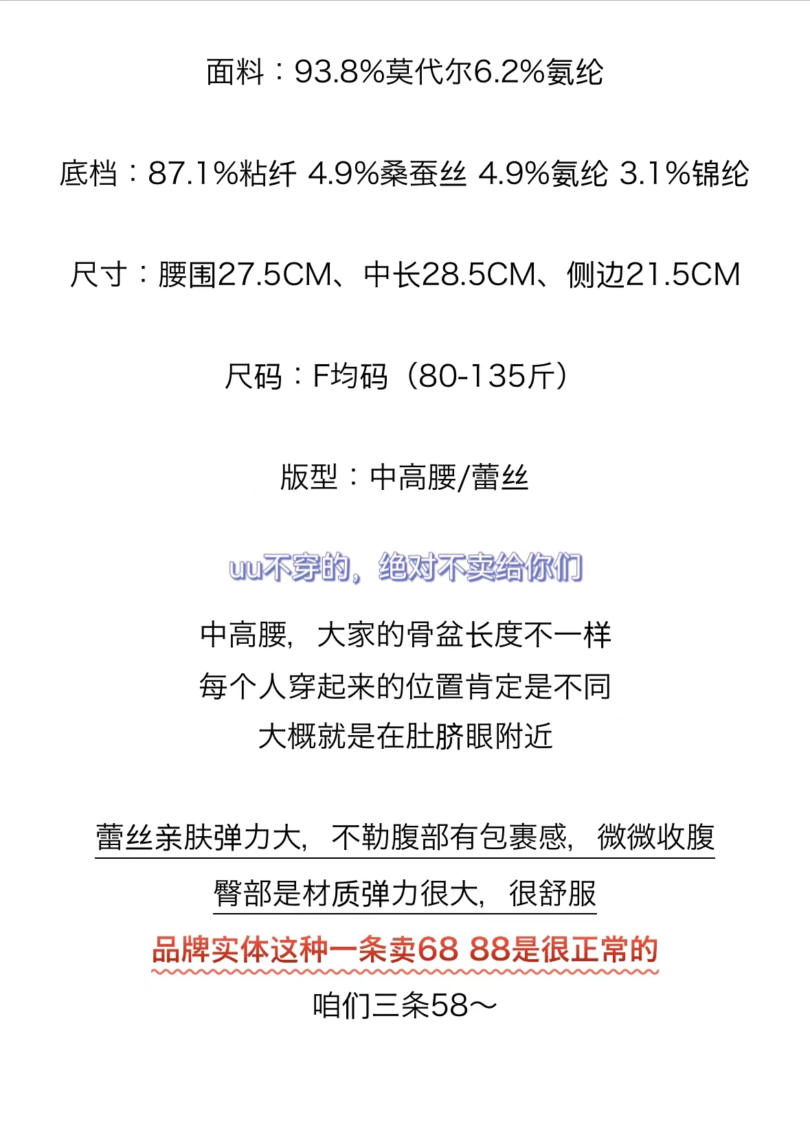供货实体〖3条58元〗全包臀很高腰 奶霜内裤。蕾丝微收腹内裤,实体一条68 88。中高腰/弹力大/全包裹