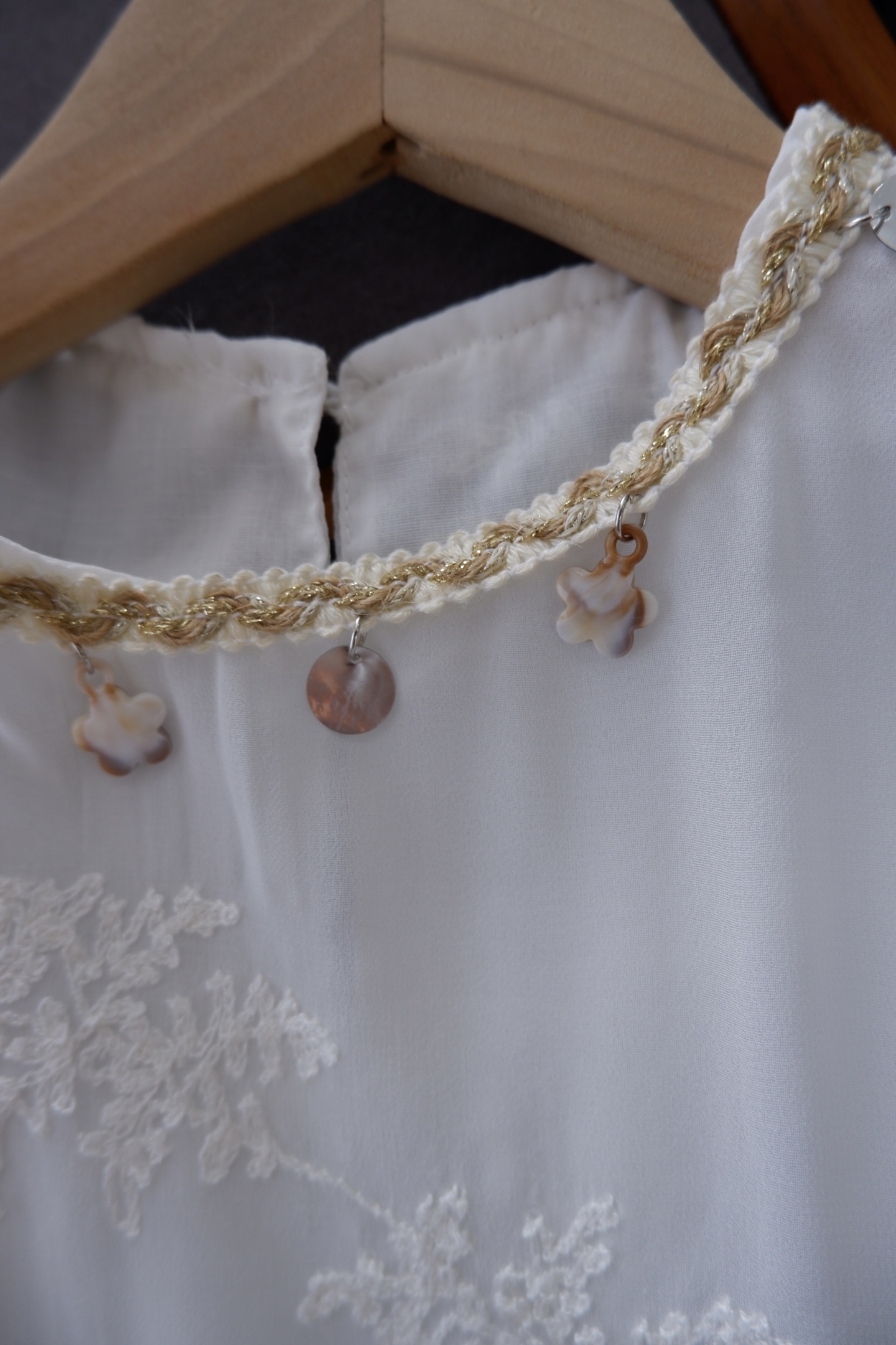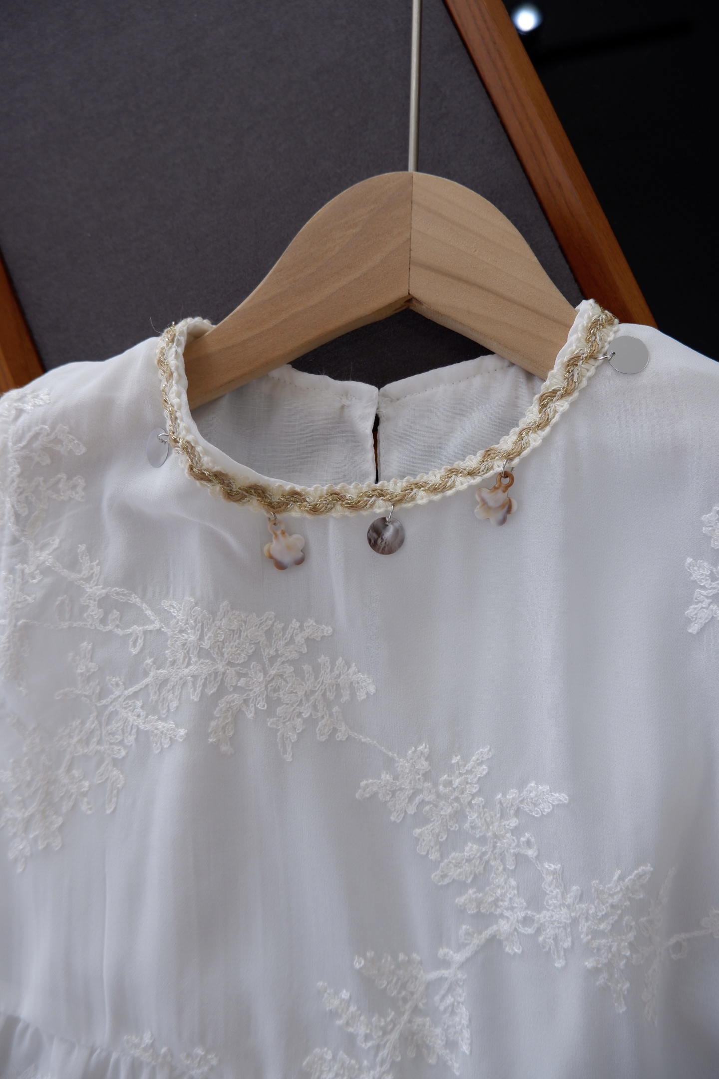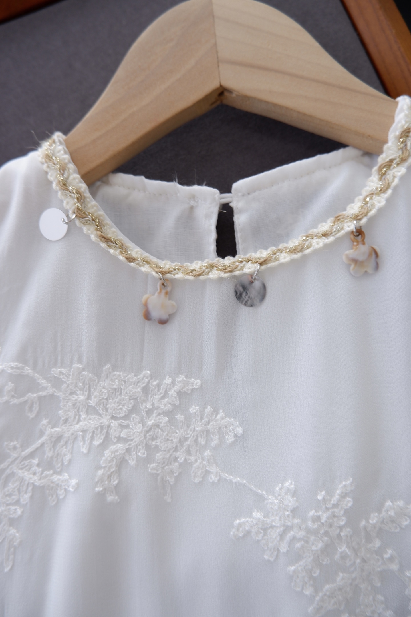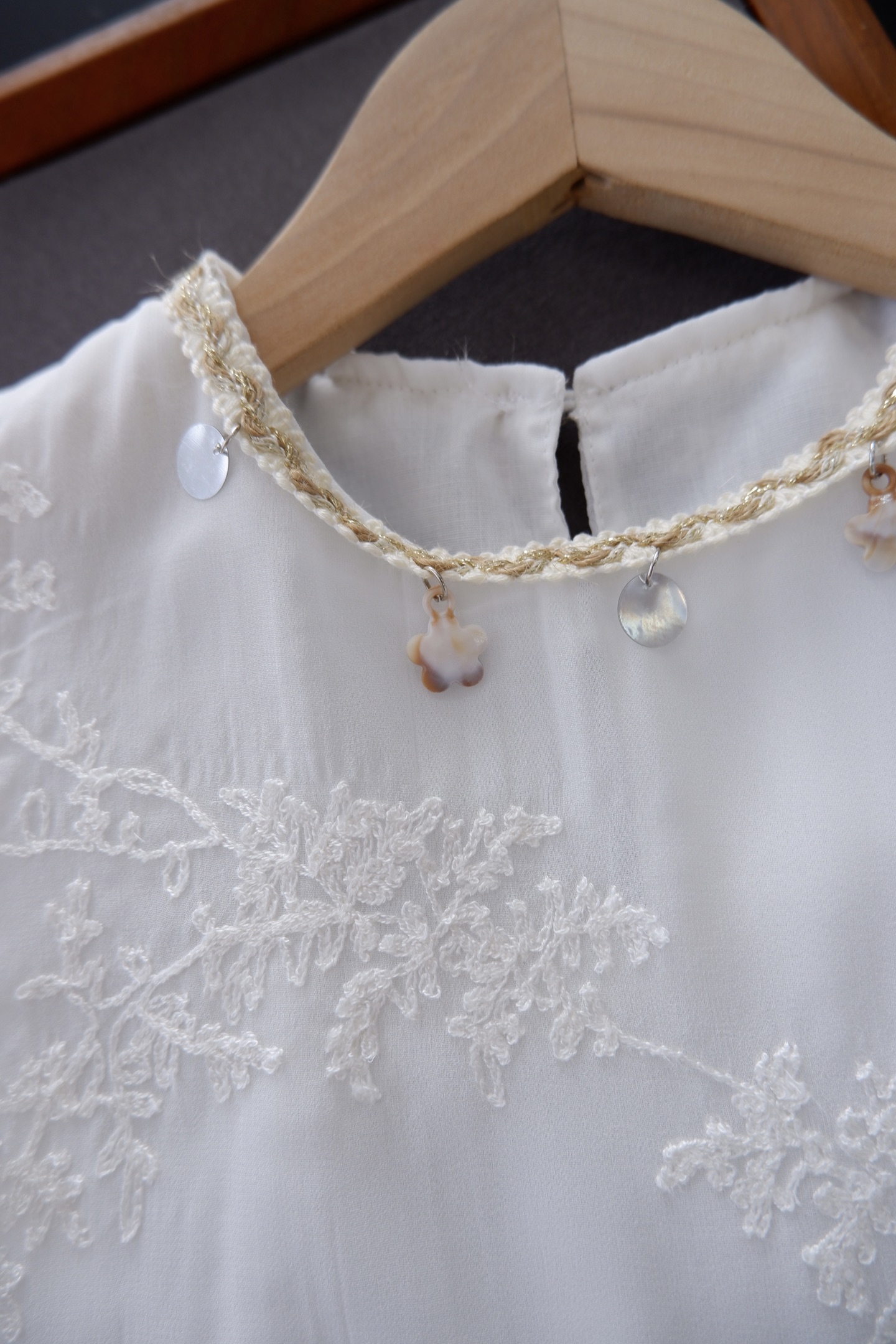 圆领设计,舒适方便穿脱;领口处定制贝壳花串,精致绝美