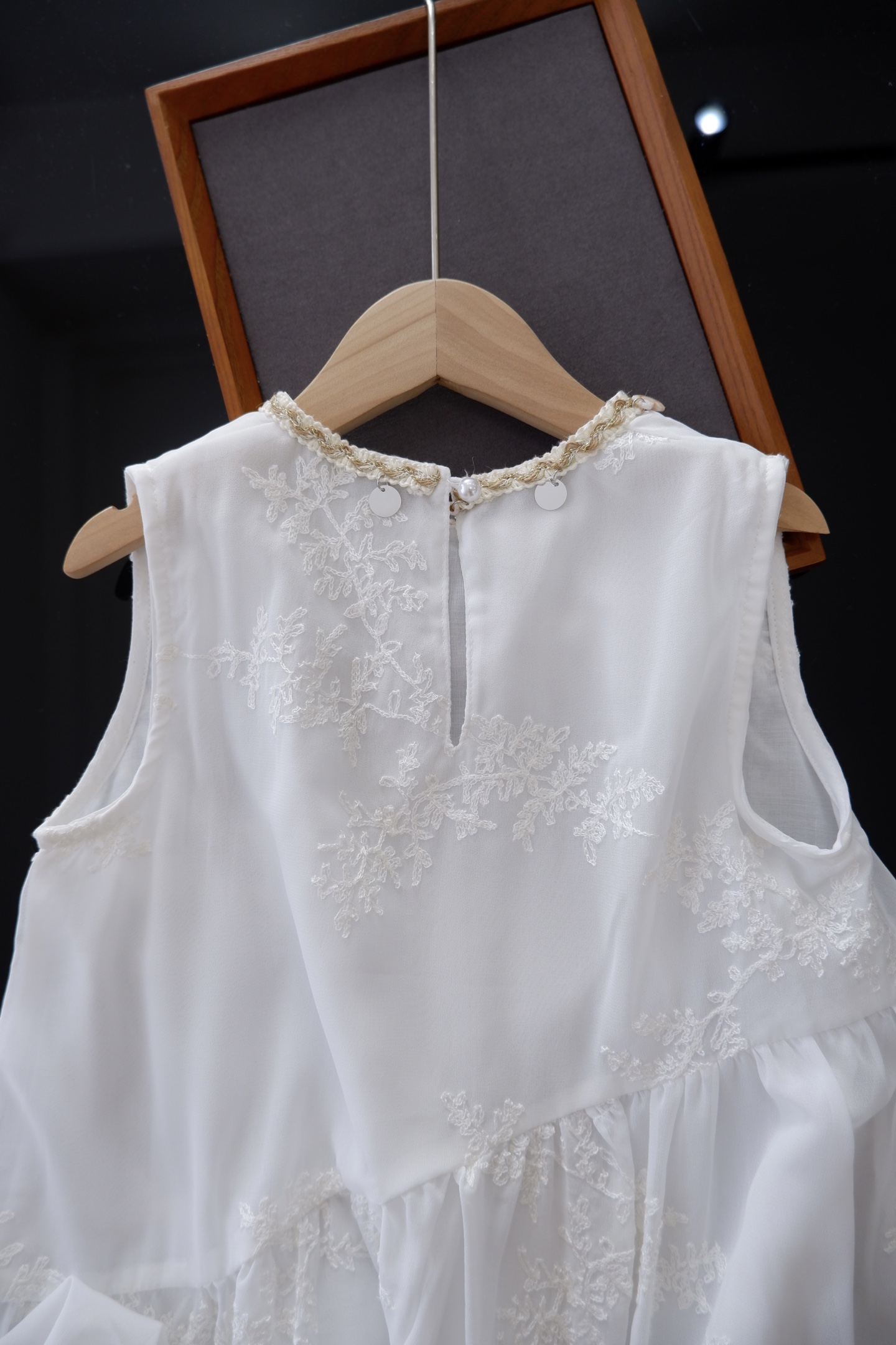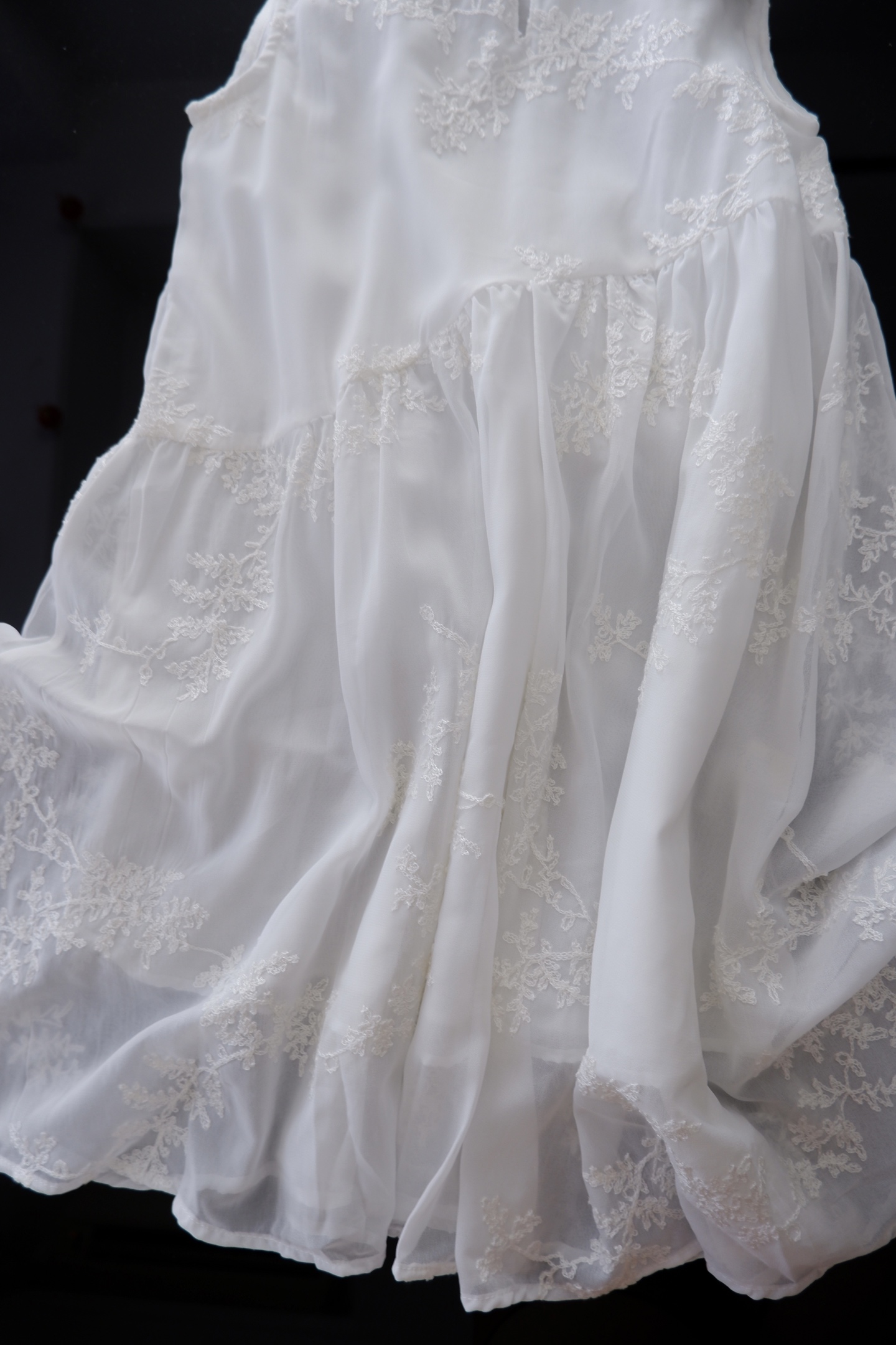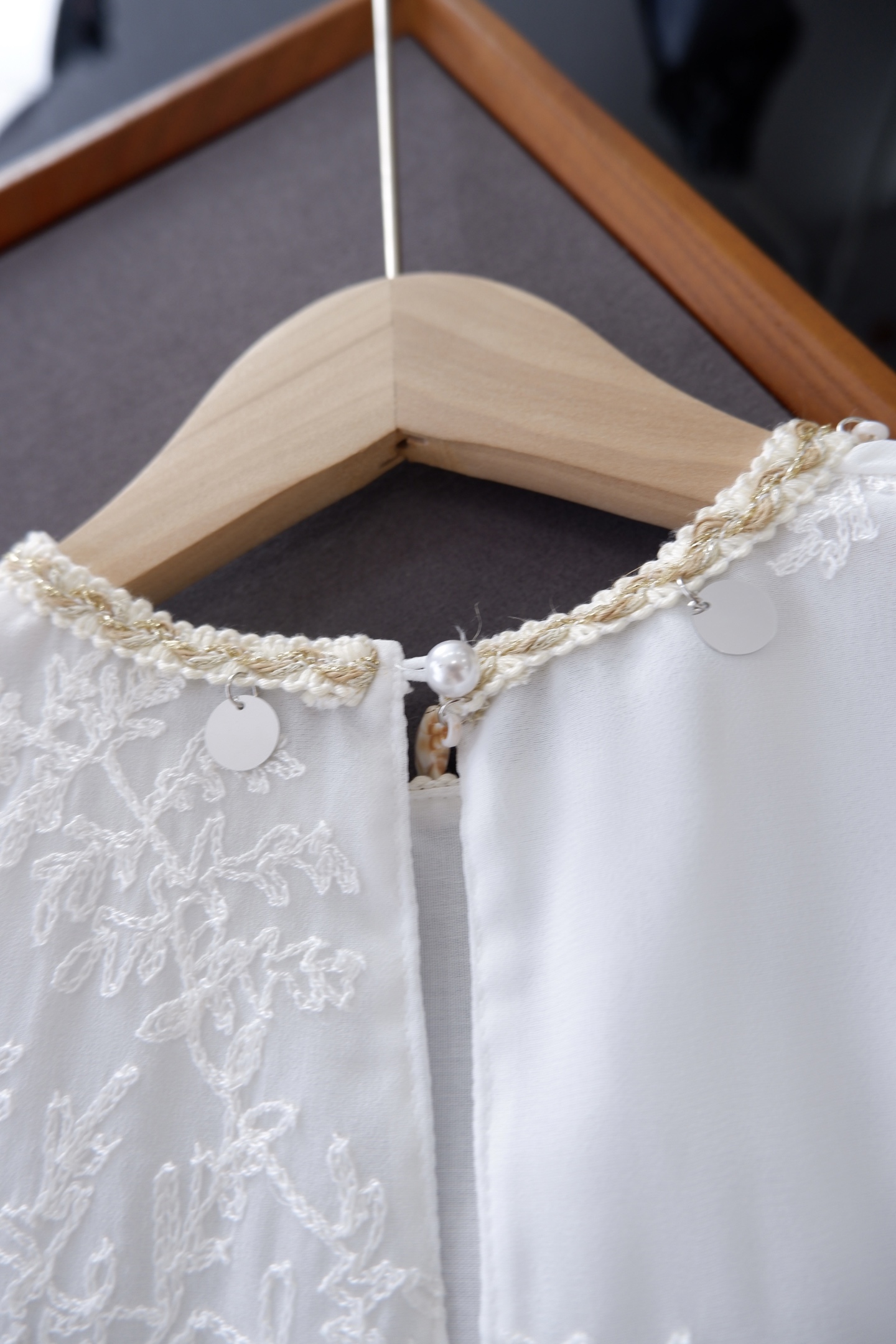 白色雪纺连衣裙, 加上上面做了暗纹绣花 ,上身自带柔光滤镜~