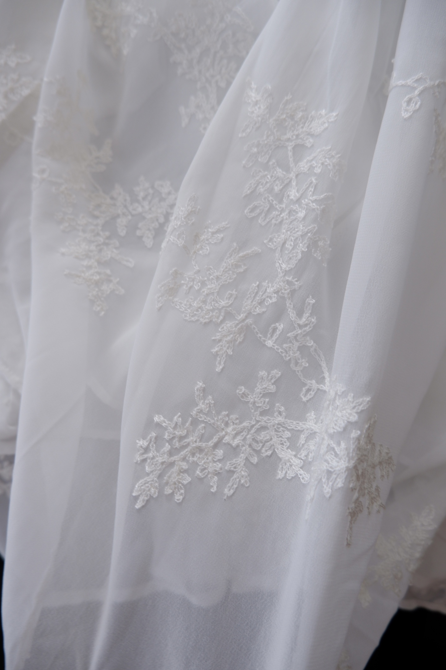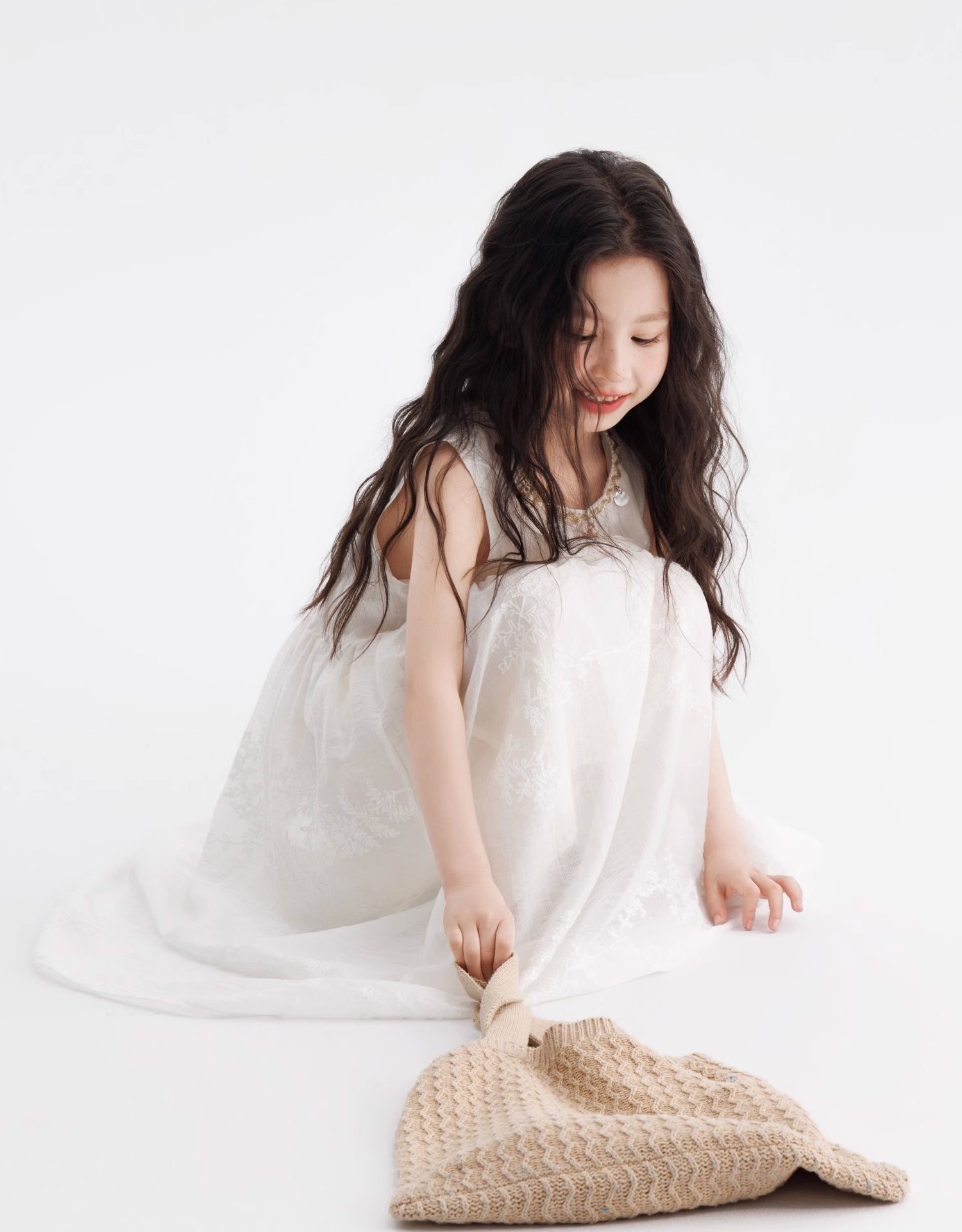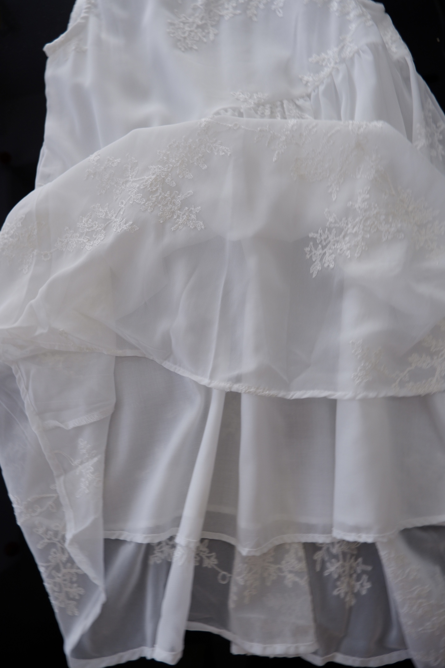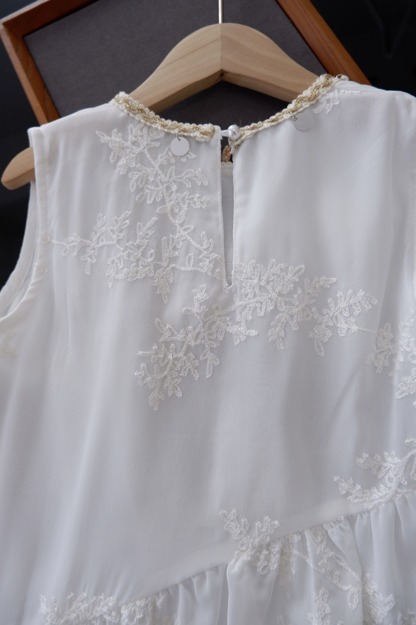 白色雪纺连衣裙, 加上上面做了暗纹绣花 ,上身自带柔光滤镜~