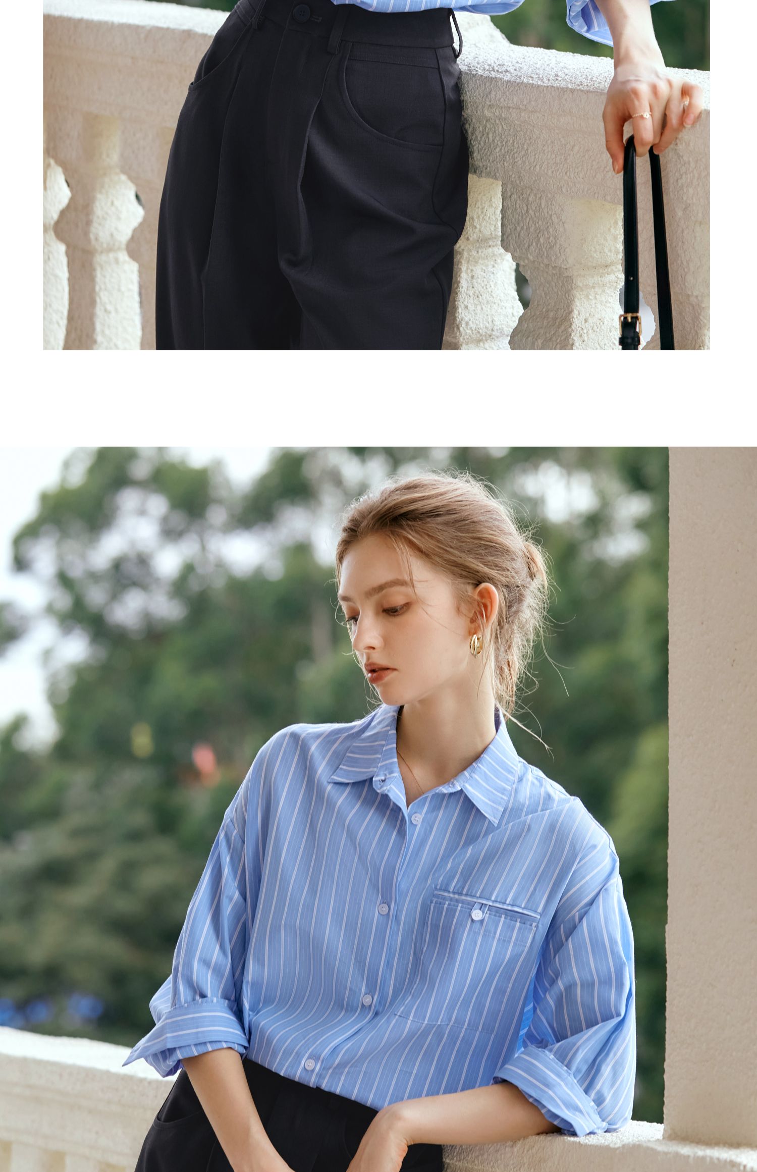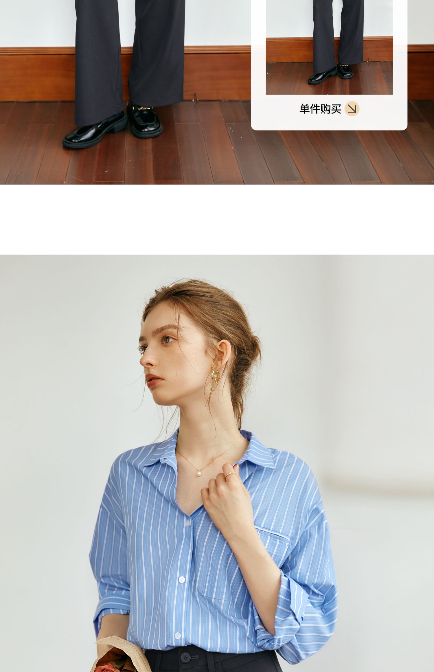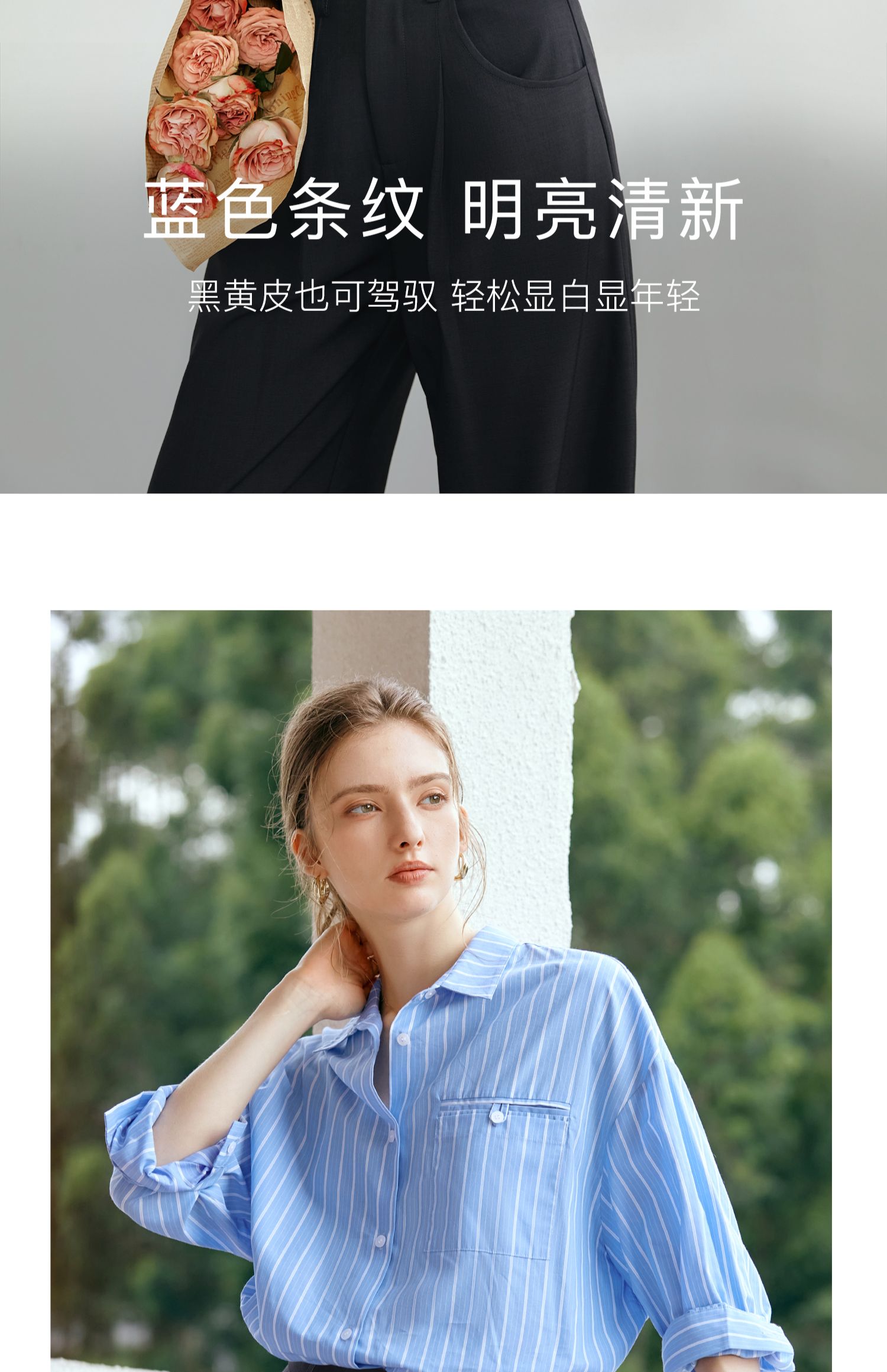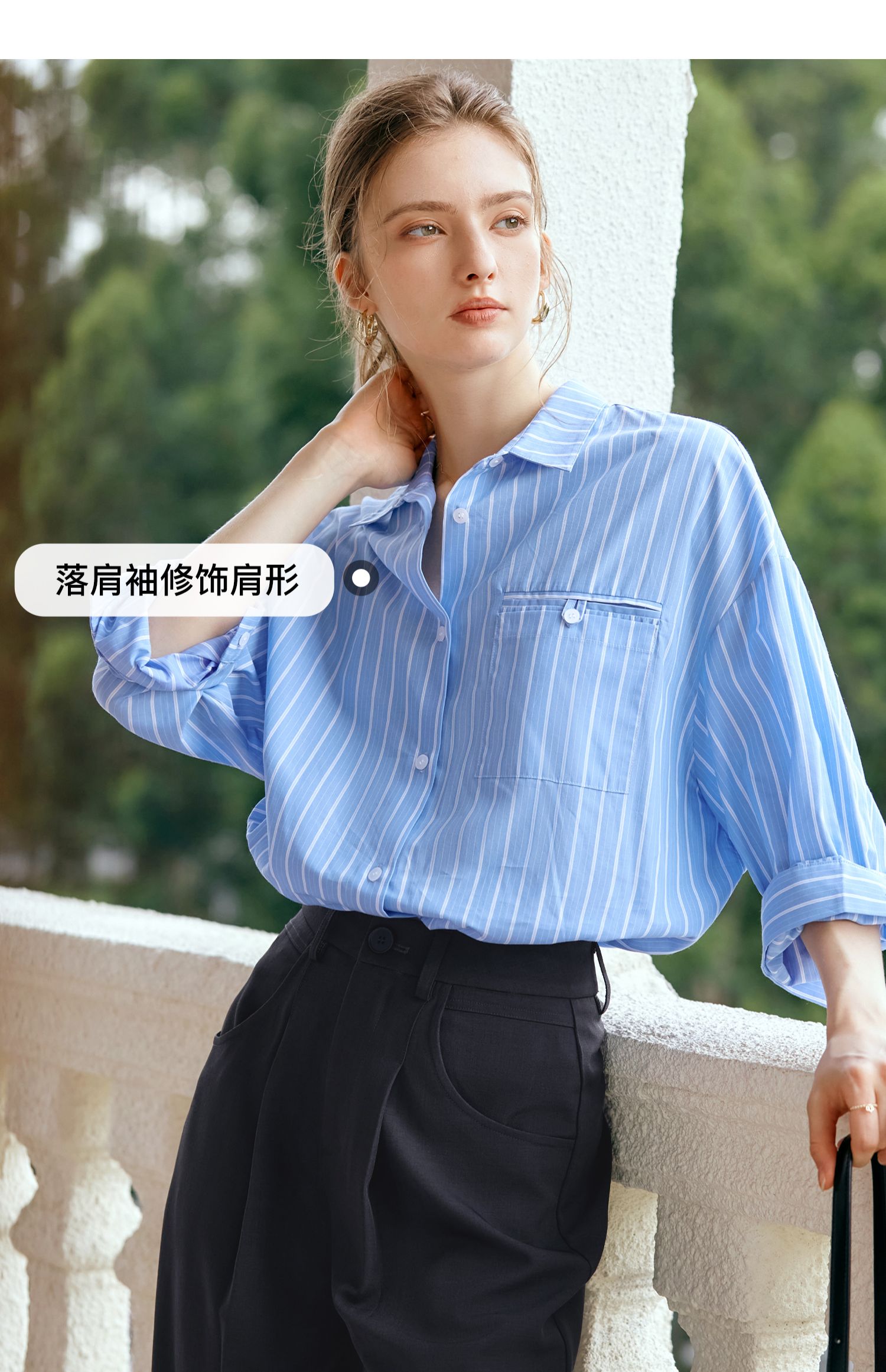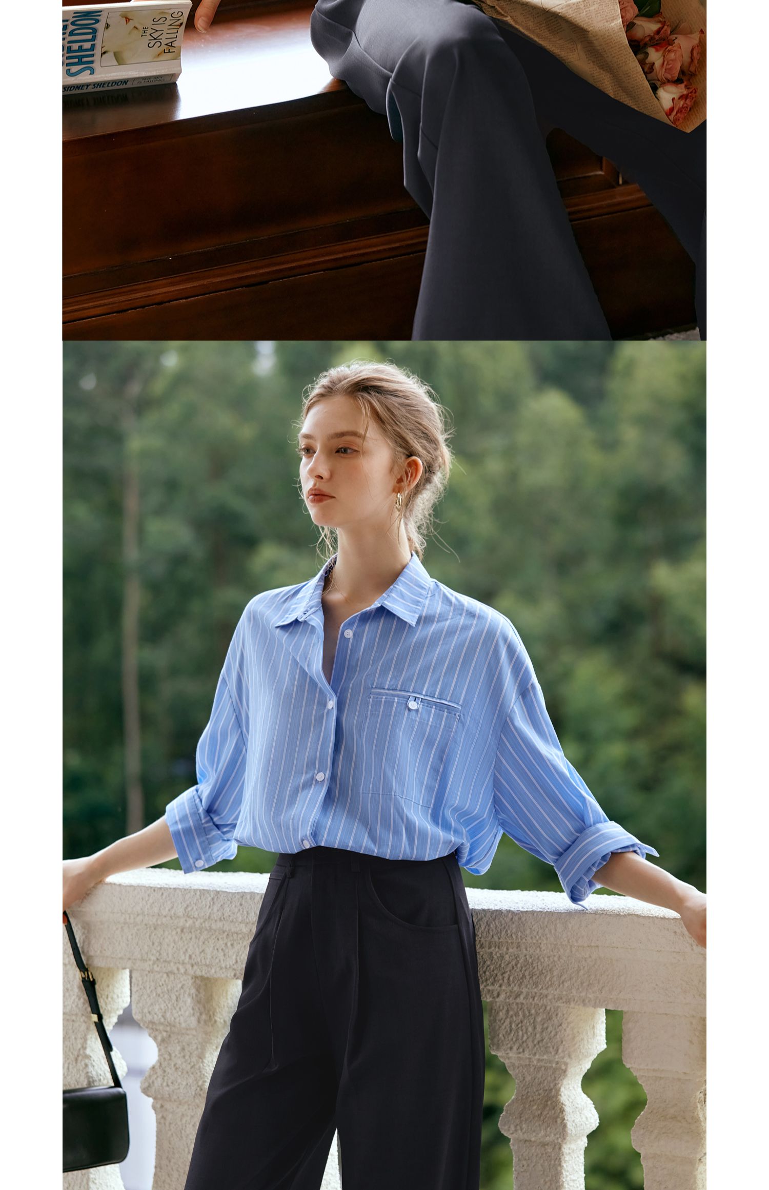 OLrain欧芮儿法式蓝色条纹衬衫女早秋慵懒风设计感宽松休闲衬衣