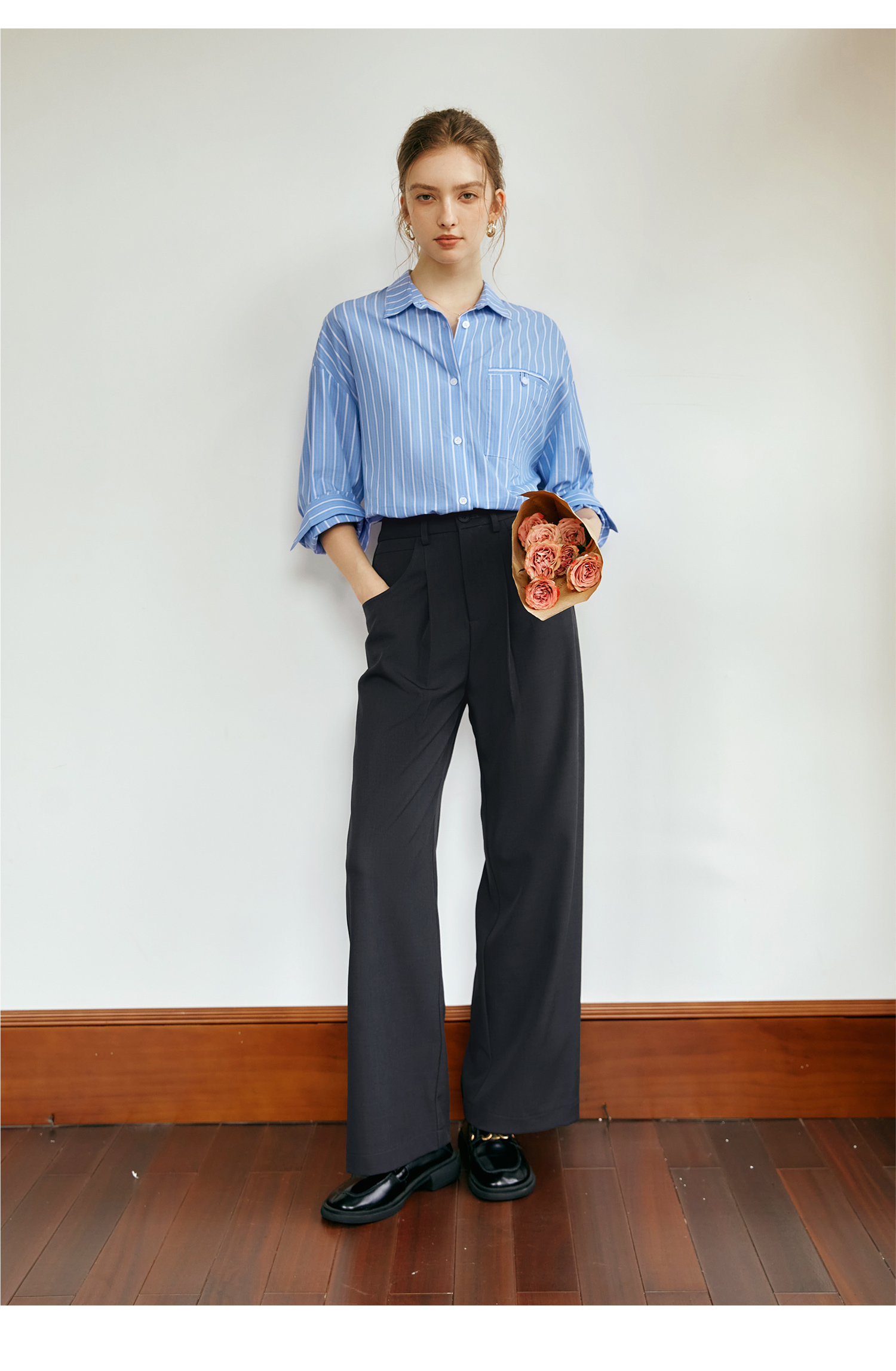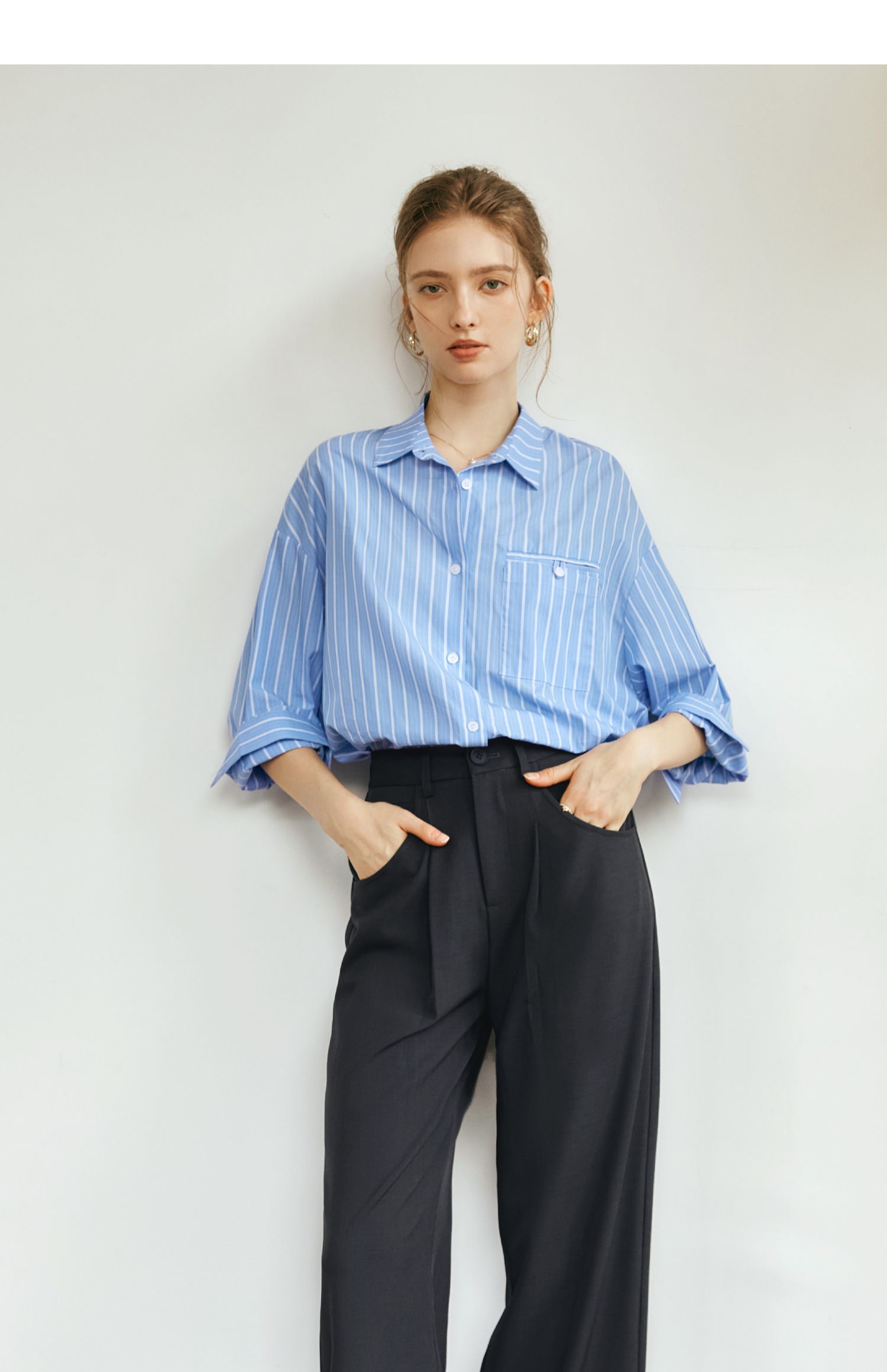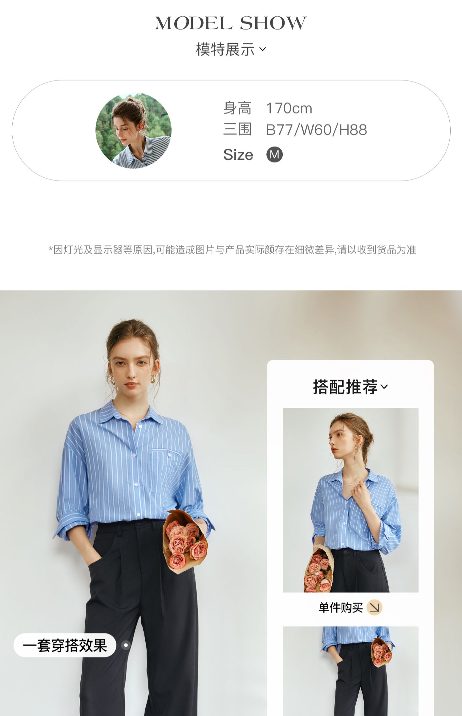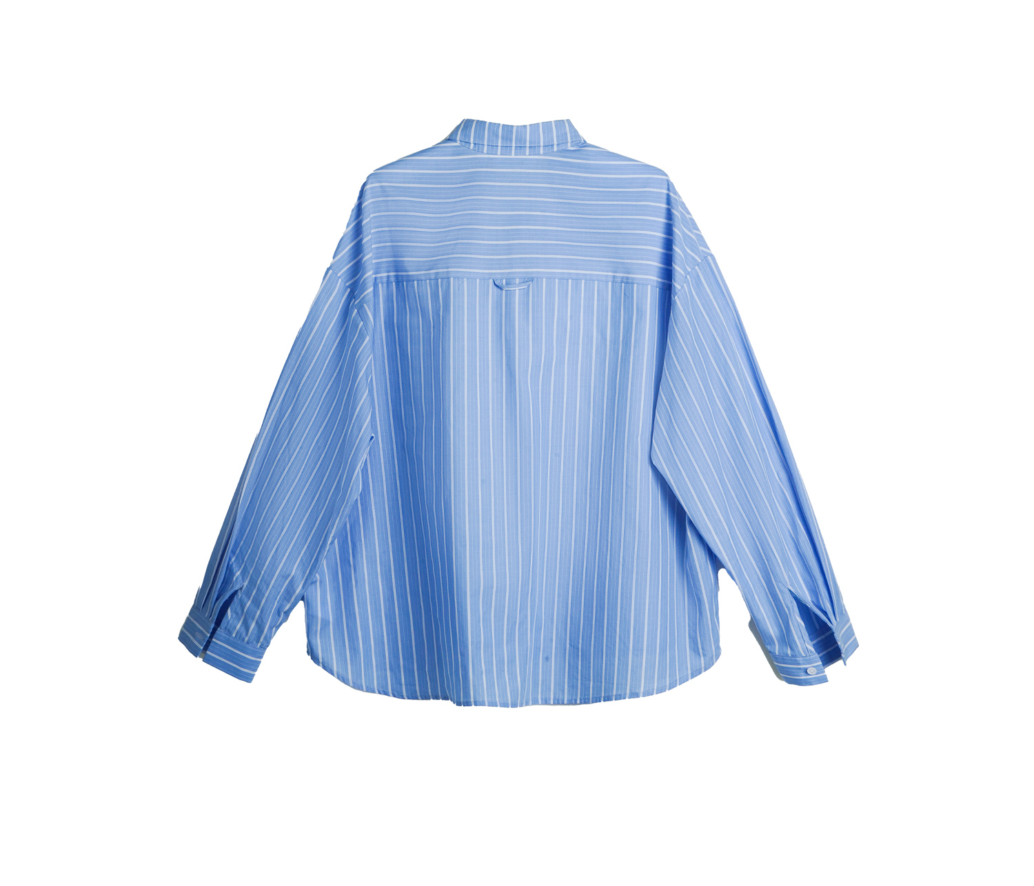 OLrain欧芮儿法式蓝色条纹衬衫女早秋慵懒风设计感宽松休闲衬衣