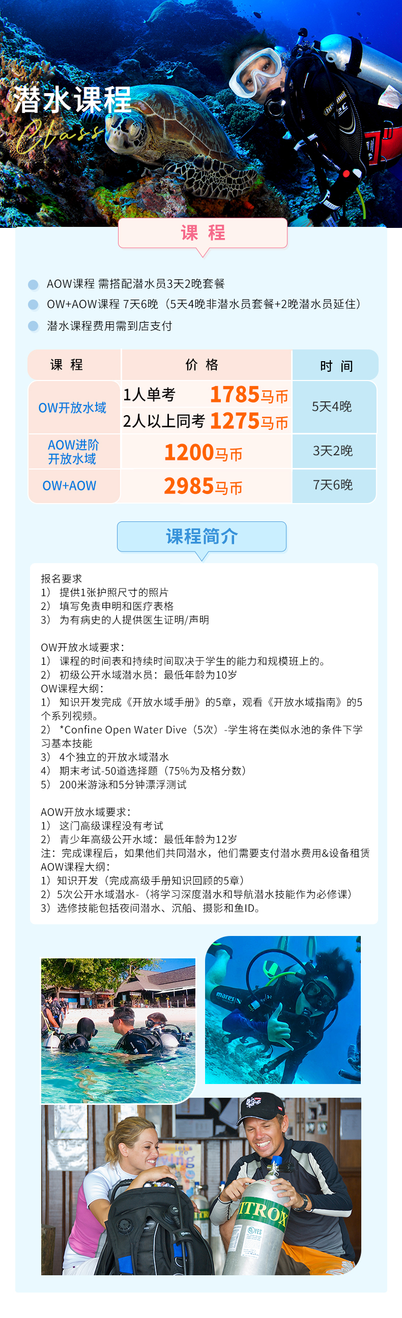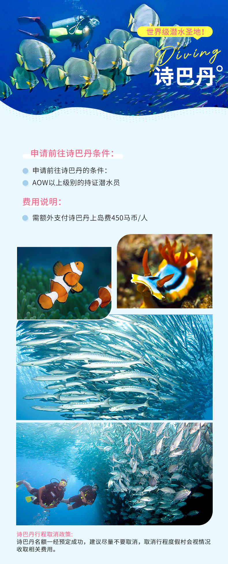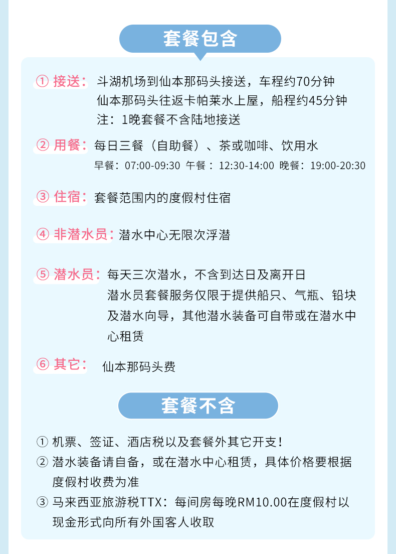 2. 特殊人群的说明:基于仙本那3个特点:(1)由于海岛需要乘快艇前往,快艇颠簸;(2)仙本那医疗设施落后,岛上没有任何医疗设施,镇上的也只有小诊所没有大医院;(3)仙本那施行宵禁晚上18点至早上6点,海上禁止任何船只出行。因此仙本那不适宜65岁以上老人、孕妇、骨质疏松、高血压、贫血、糖尿病、慢性肺病、严重心脑血管疾病、气喘病、过敏体质等及其他不适宜人员前往。一切以安全为先,如执意出海,发生意外后果自负。任何不适合搭乘快艇的人员暂不接待;如执意报名,请提供3个月内的体检证明且签署风险告知书;