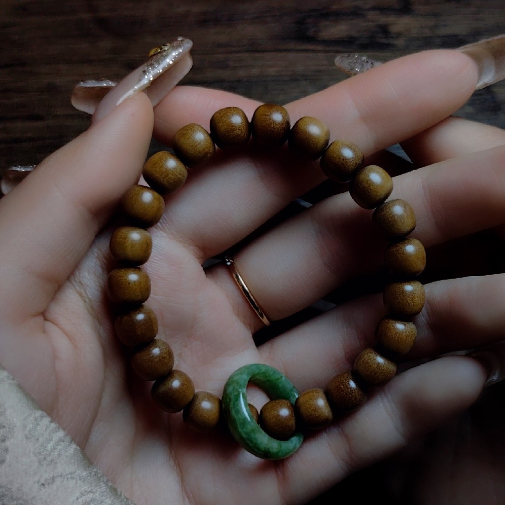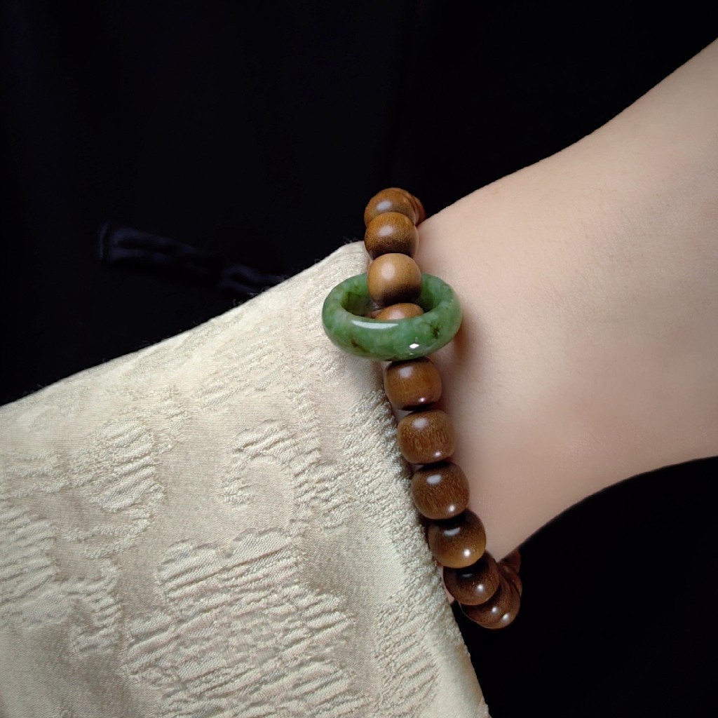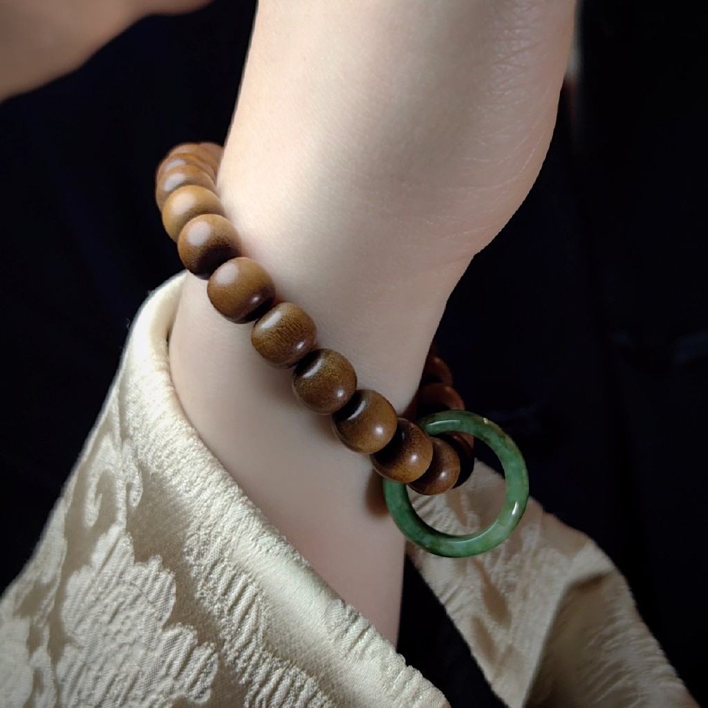 翡翠指环寓意平安和圆满,搭配老山檀便成为一件可佩戴,可盘玩手上装饰。