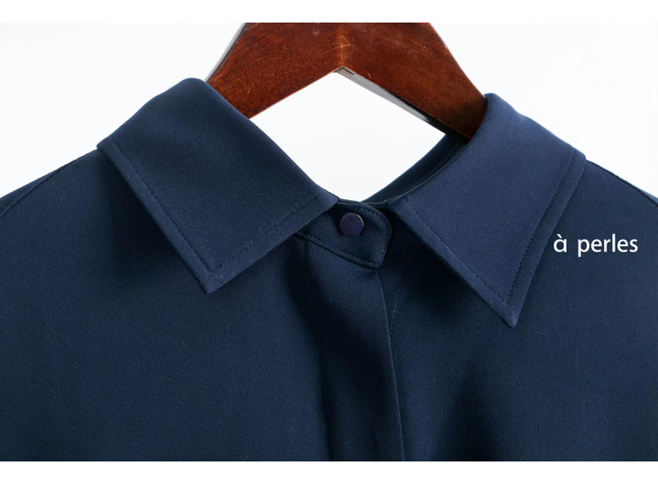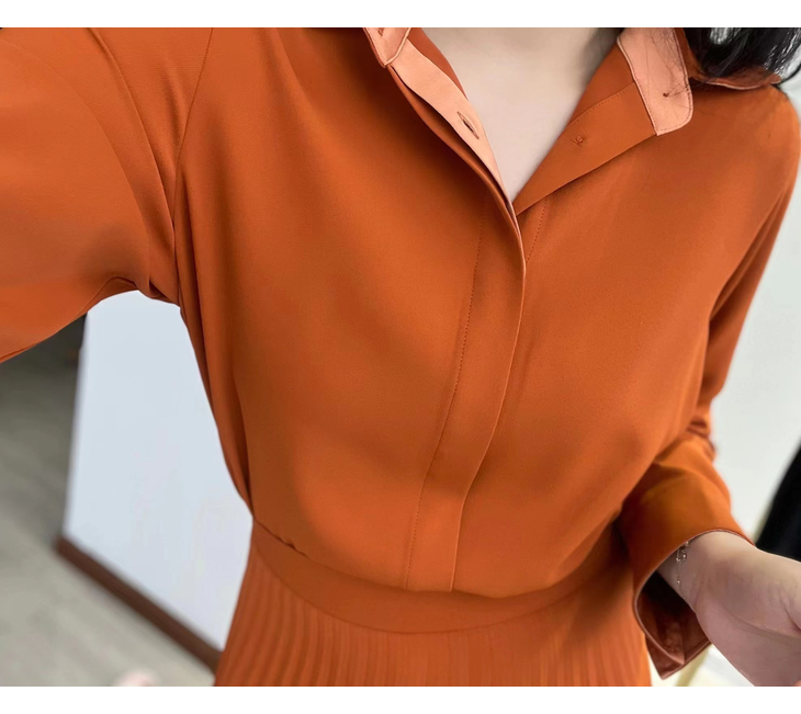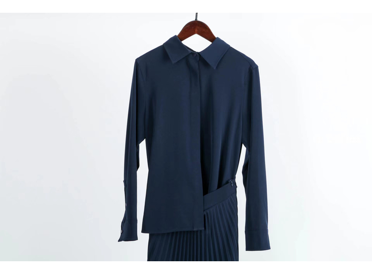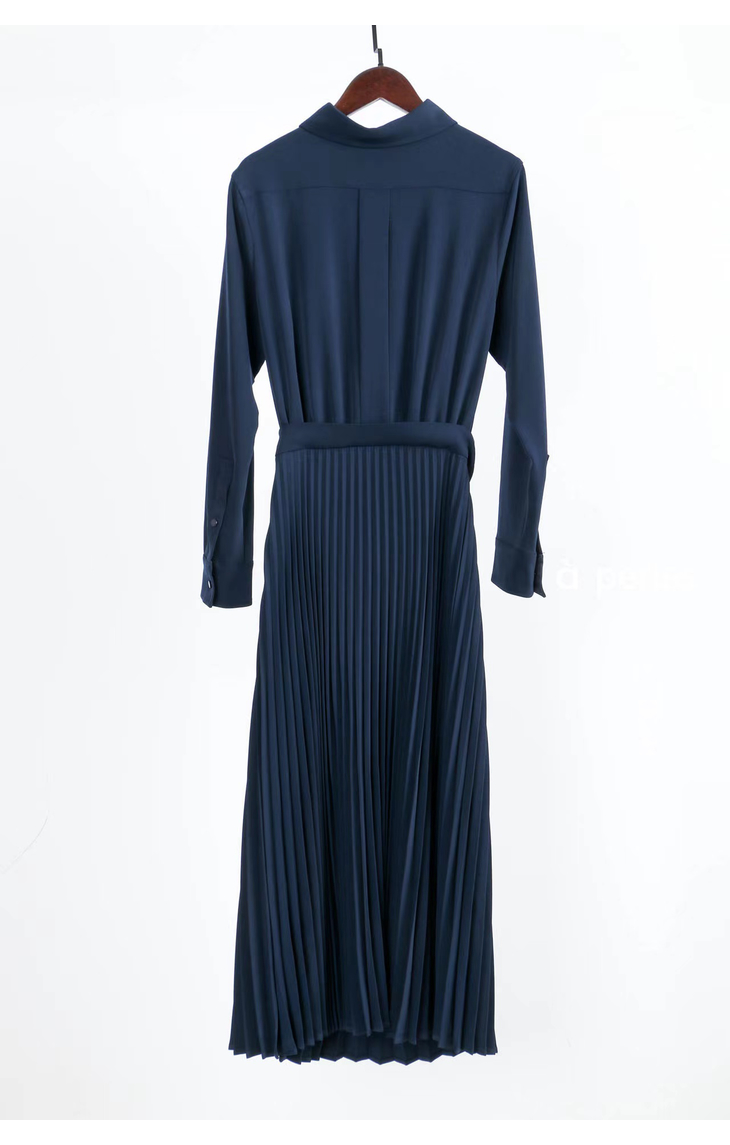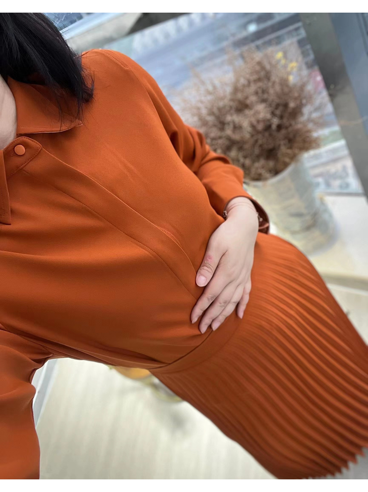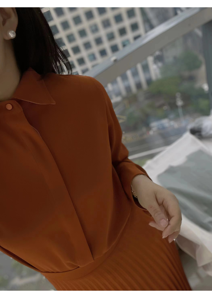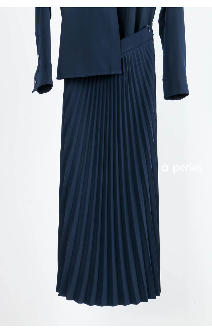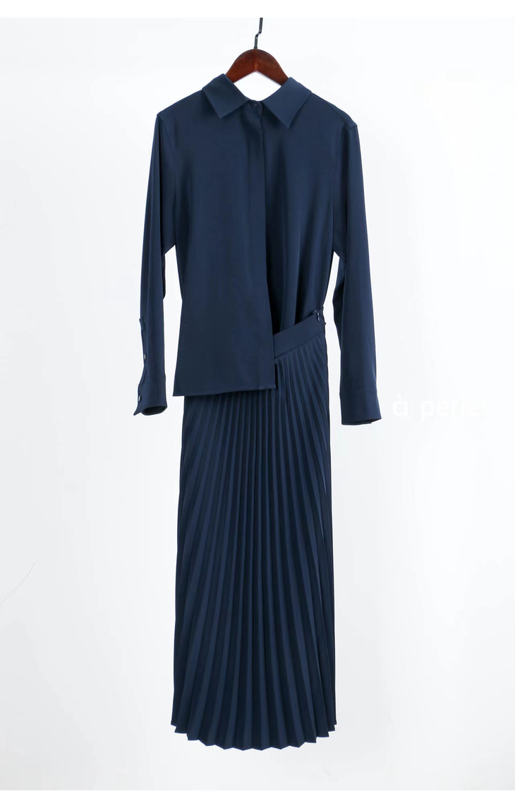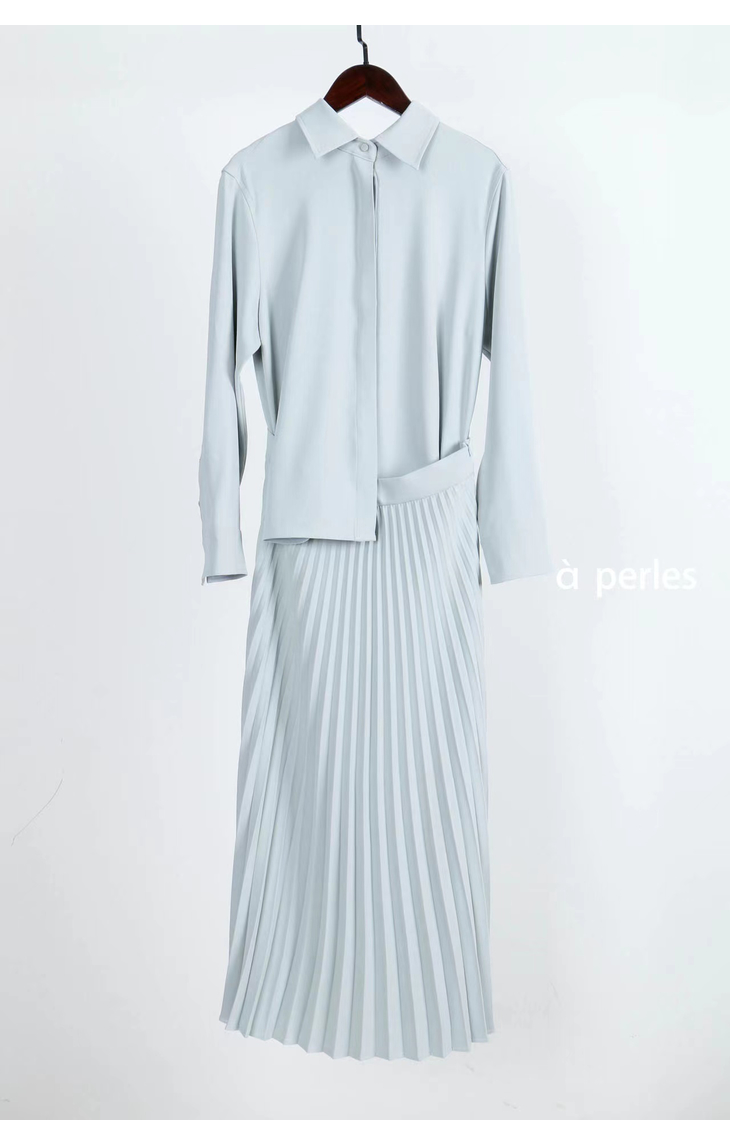 合身的衬衣和优雅的百褶裙完美组合,搭配的同色系套装, 其实是一条连衣裙哦,在腰部的位置做了巧妙的设计,后片连在一起,解决了我们衣服塞不平整的烦恼。