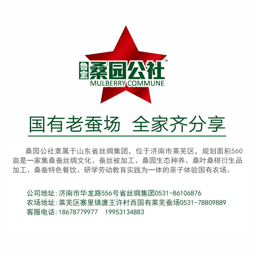 - 桑园公社,隶属于山东省丝绸集团。莱芜基地位于山东省济南市莱芜区寨里镇,规划面积600亩,是一家集原生态桑园立体种养殖、蚕丝被加工、桑蚕衍生品加工、桑蚕特色餐饮、研学体验等一体的生态循环农业示范园。