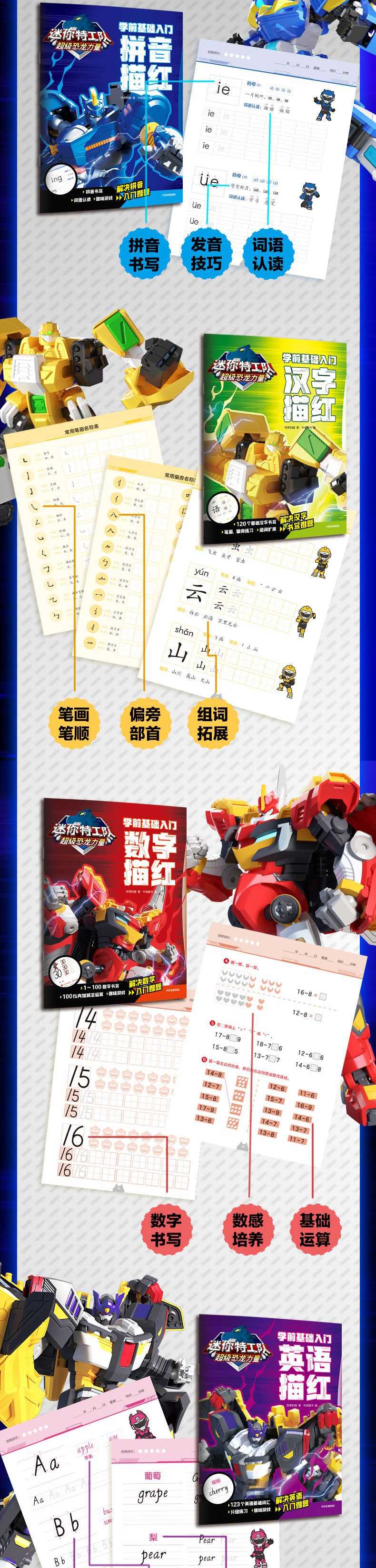 根据火爆的动画IP《迷你特工队超级恐龙力量》改编的幼小衔接描红书。针对小学一年级学习的英语、数学、语文课本的内容,结合迷你特工队ip,进行趣味描红,乐趣 知识,更好得为小朋友幼小衔接做好准备。 《迷你特工队超级恐龙力量 学前基础入门:数字描红》是该系列其中一本,涵盖1_100数字、100以内基本运算等内容,配合趣味练习,让孩子学习更有趣,更高效,培养孩子持续专注力。