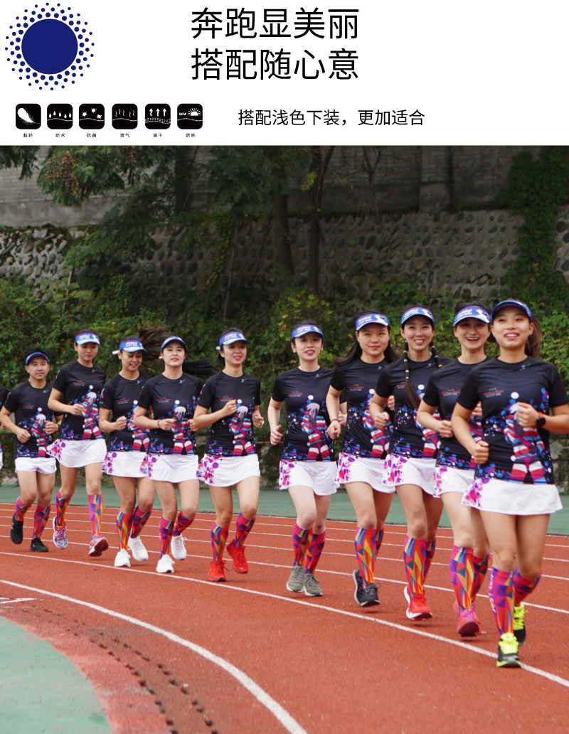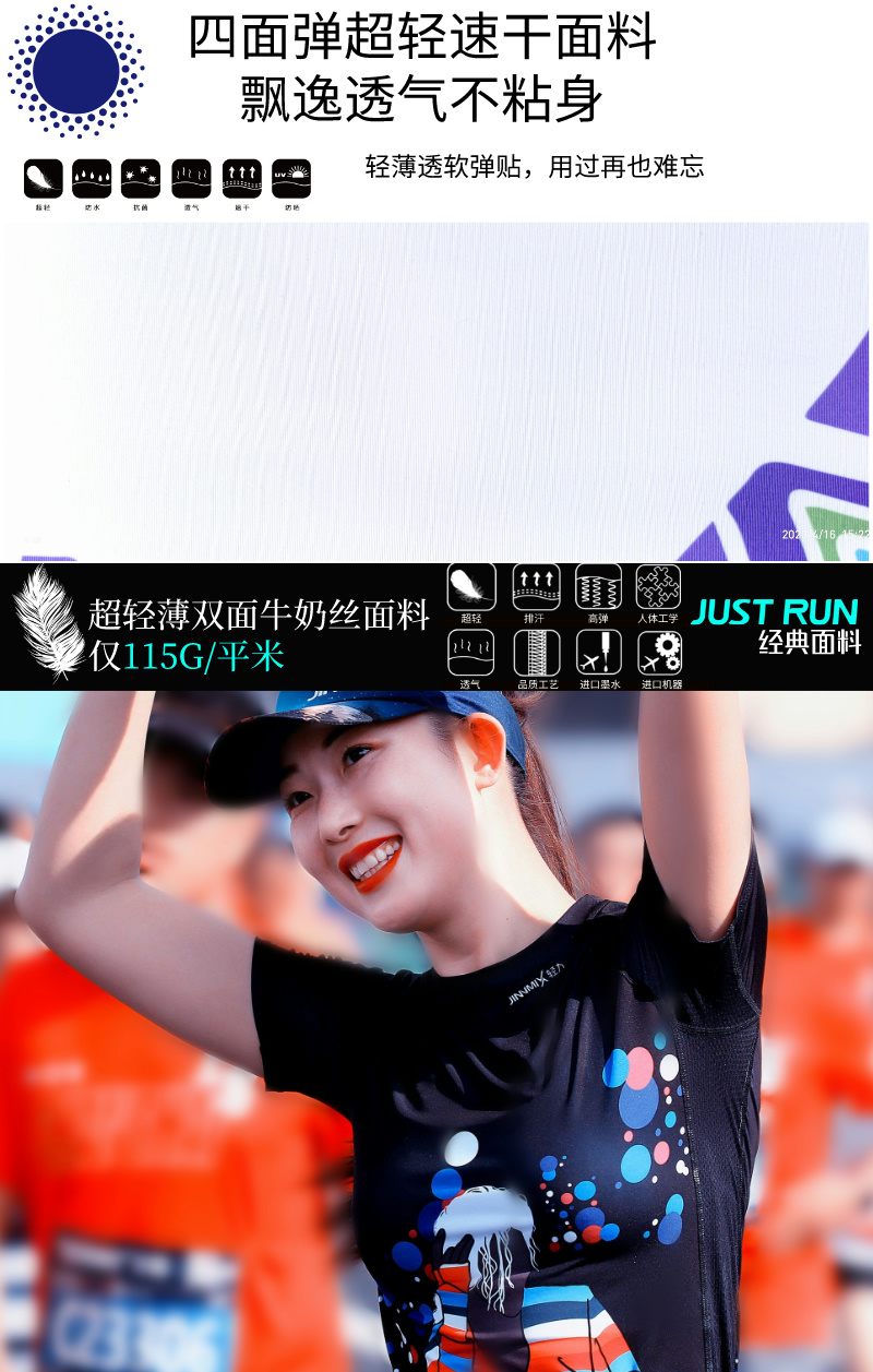 使用意大利MITI公司优质牛奶丝与透气网眼布,使得跑服轻薄、速干、透气、服帖、高弹。