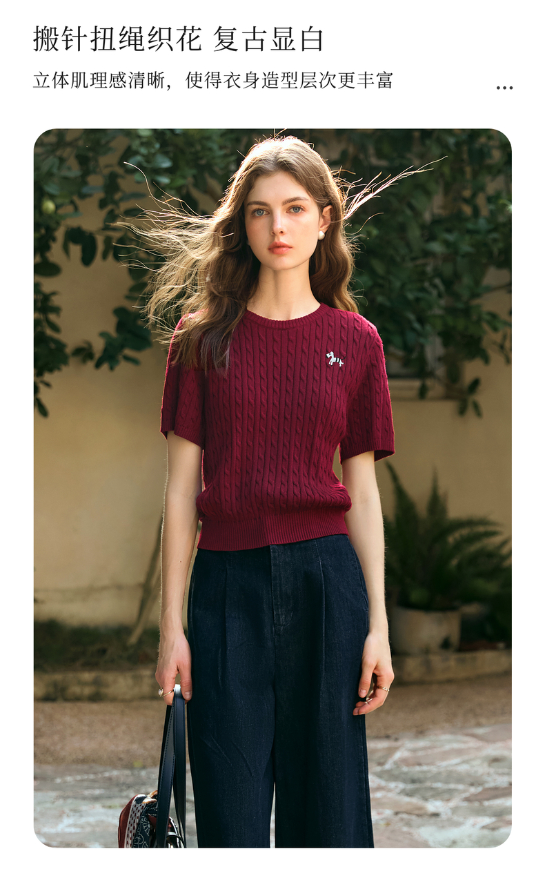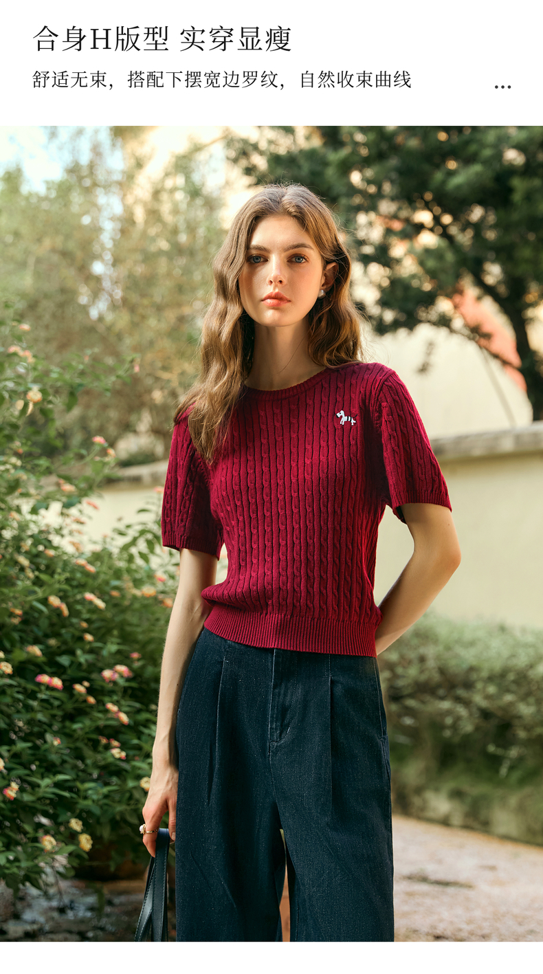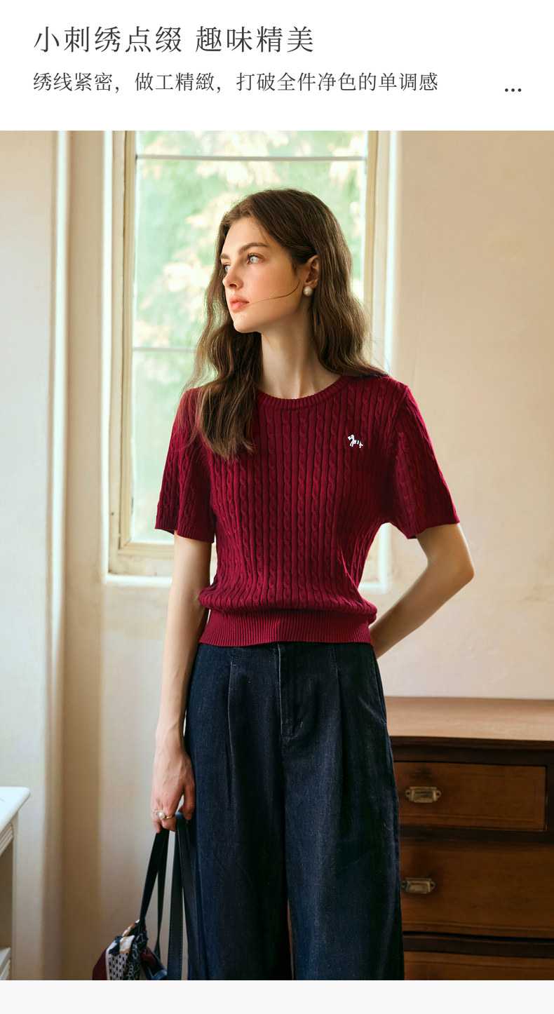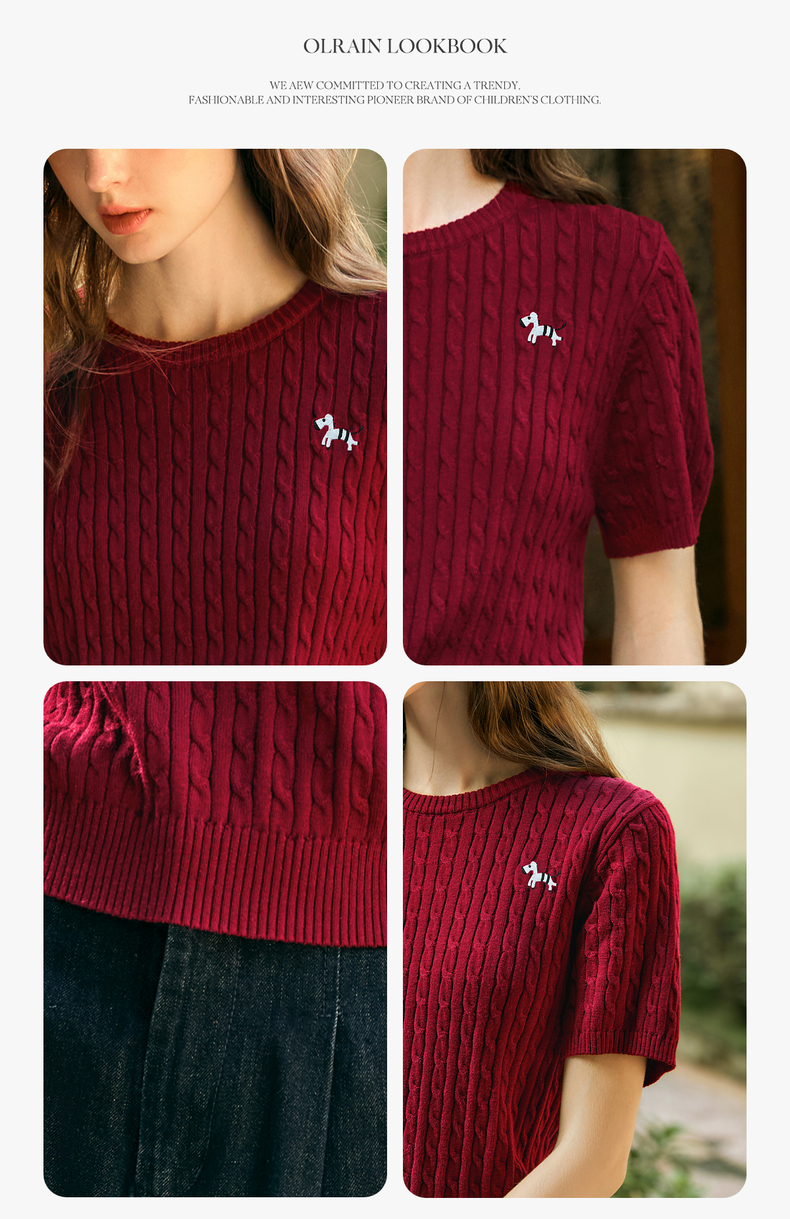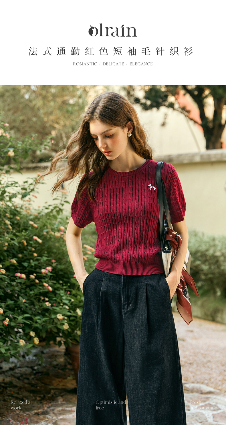 OLrain欧芮儿法式短袖T恤女冬季2024年新款通勤圆领针织套头衫