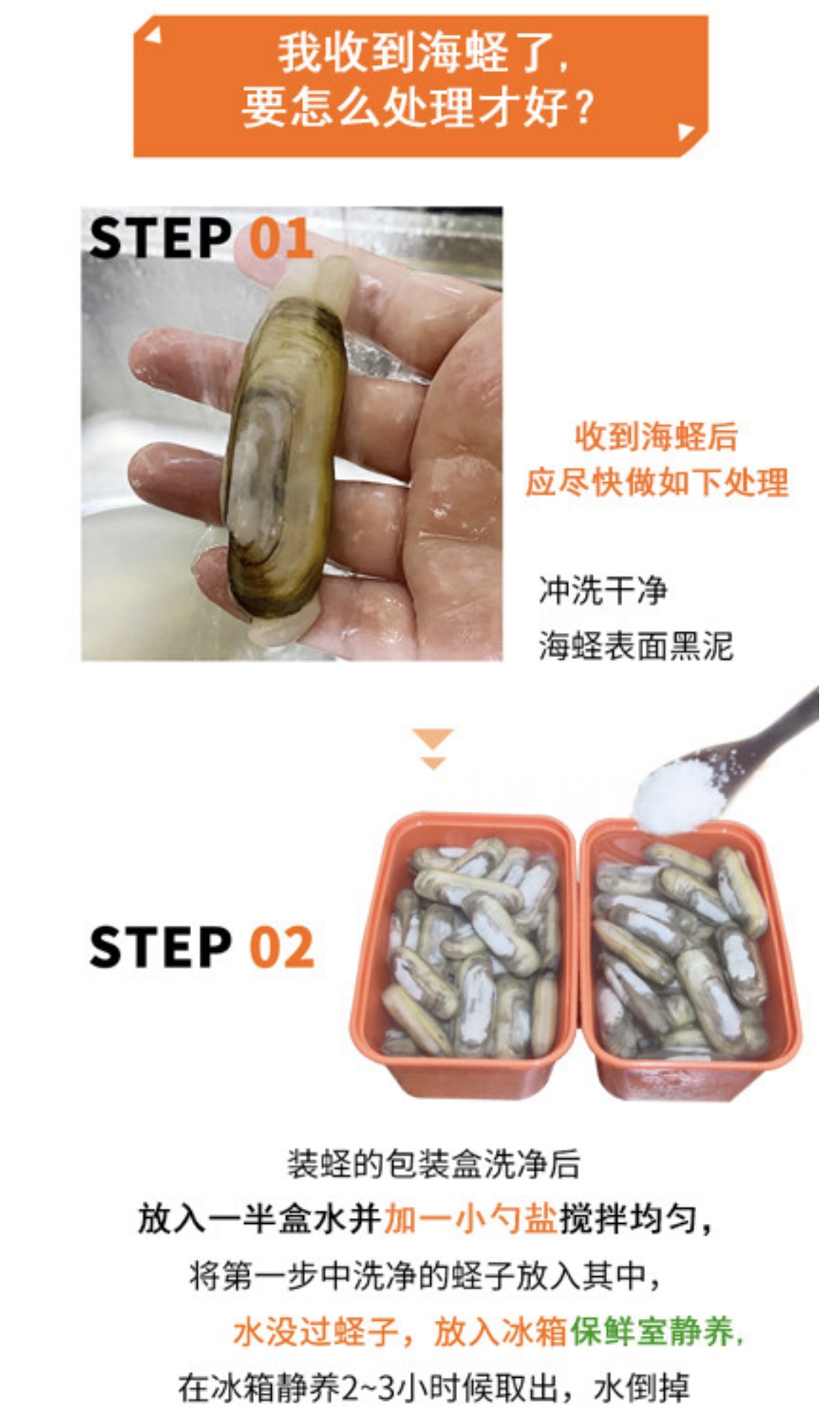 蛏到手是活的,直接带着泥挖出来盒子装好寄来,看似费事,其实清洗一下,加碘盐,泡2-3小时就可以烹饪了。