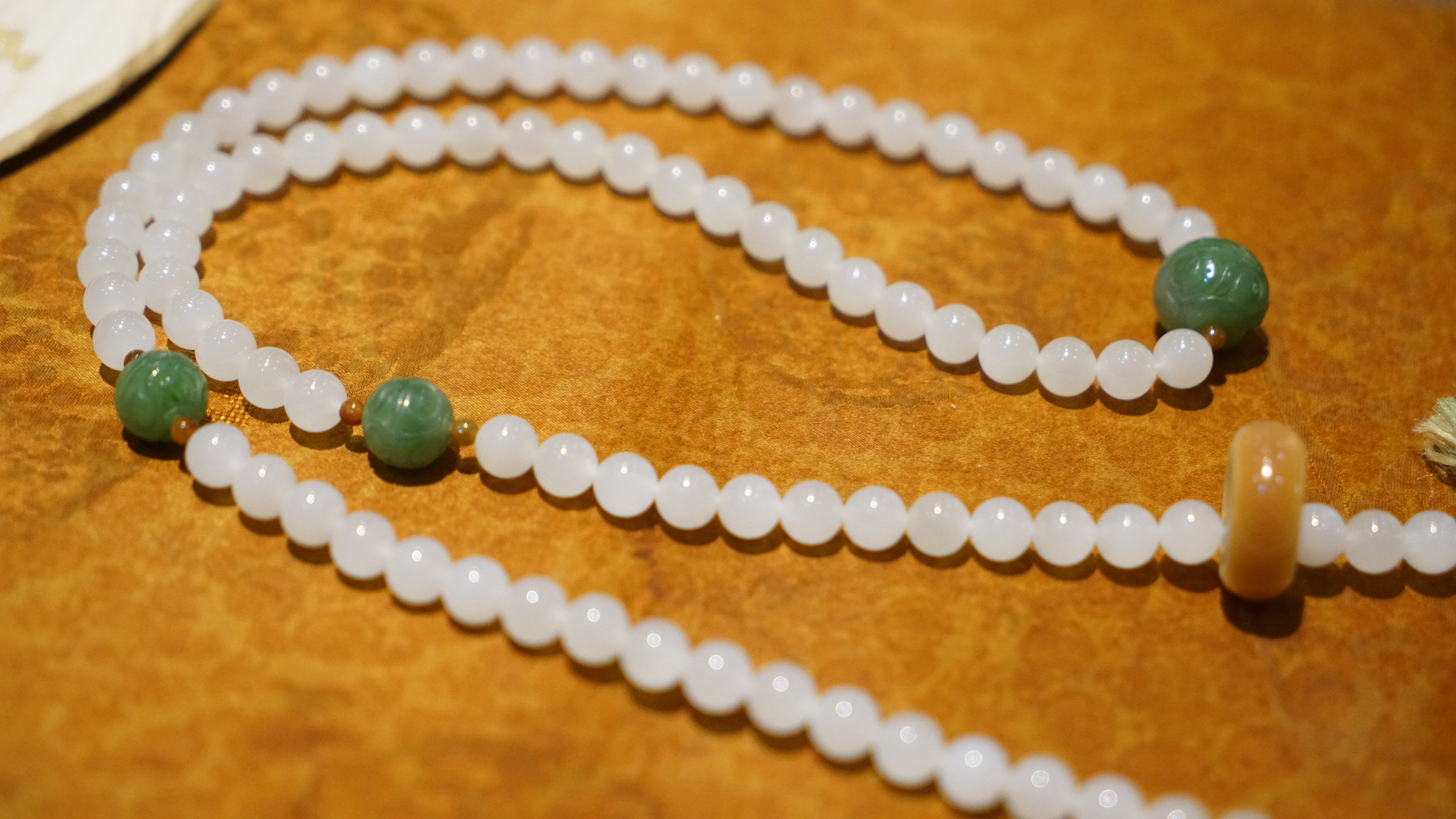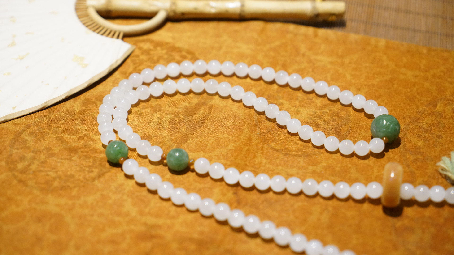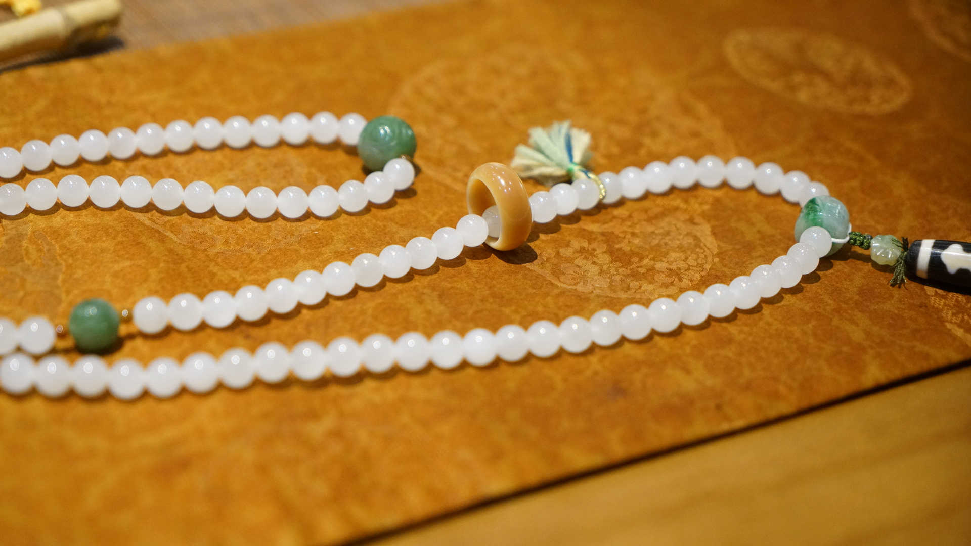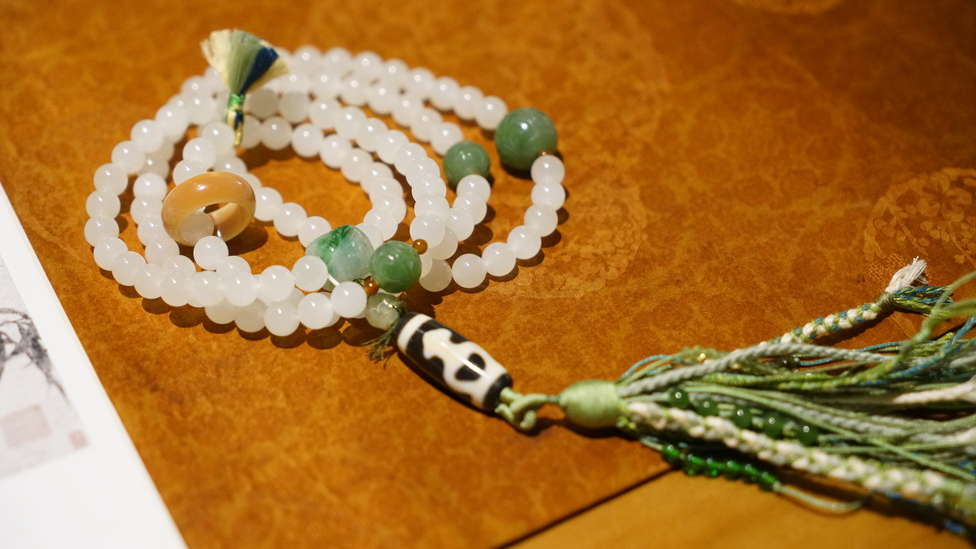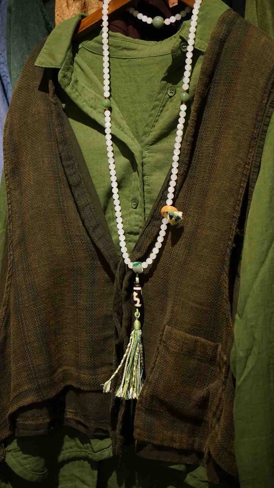 108颗念珠项链,青海料老料白玉,8mm直径,温润细腻,是不可多得的青海料和田玉好料子。顶珠和腰珠搭配了碧玉回纹珠全套,三通是翡翠一抹色辣的绿,值得回味。