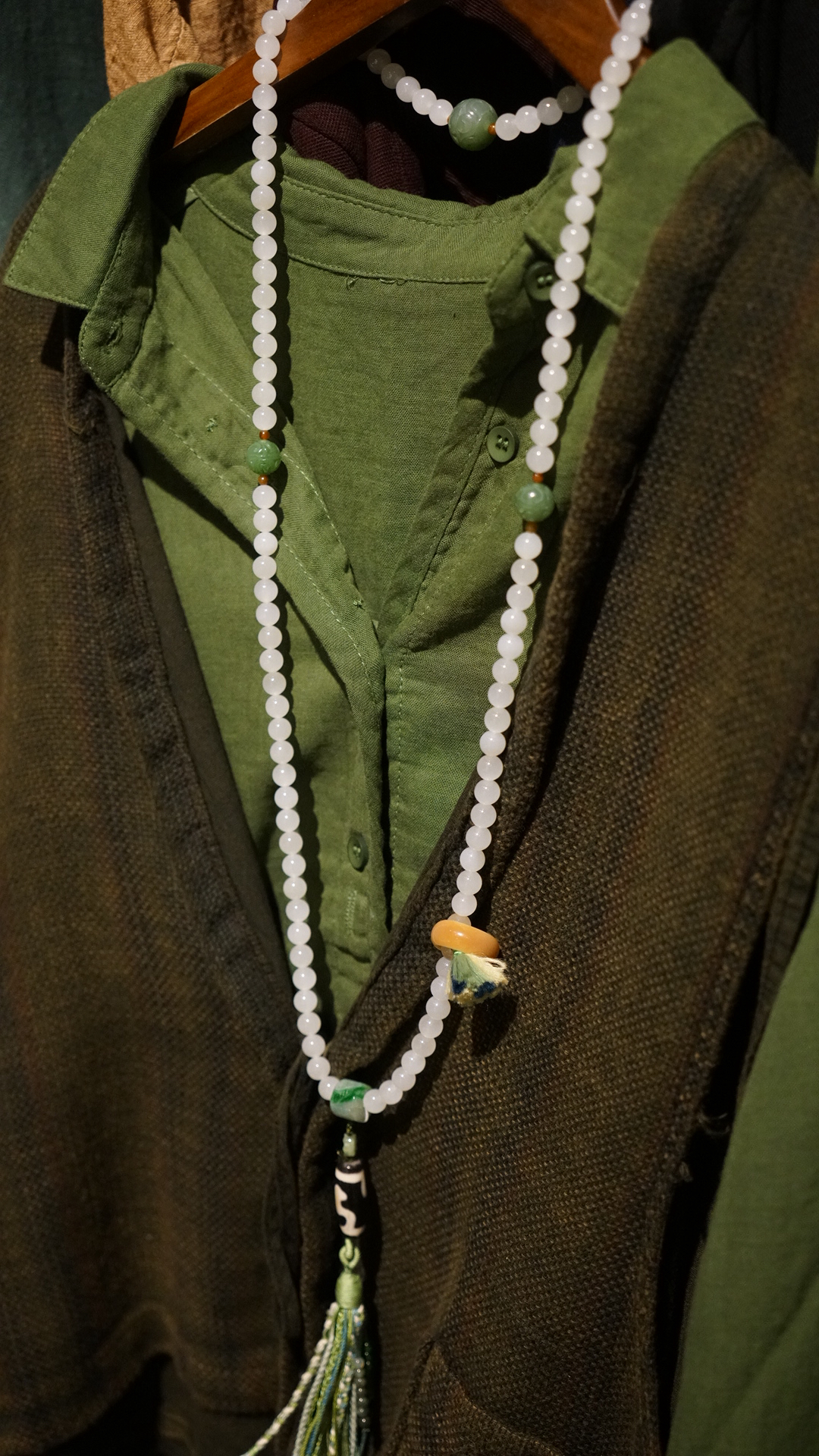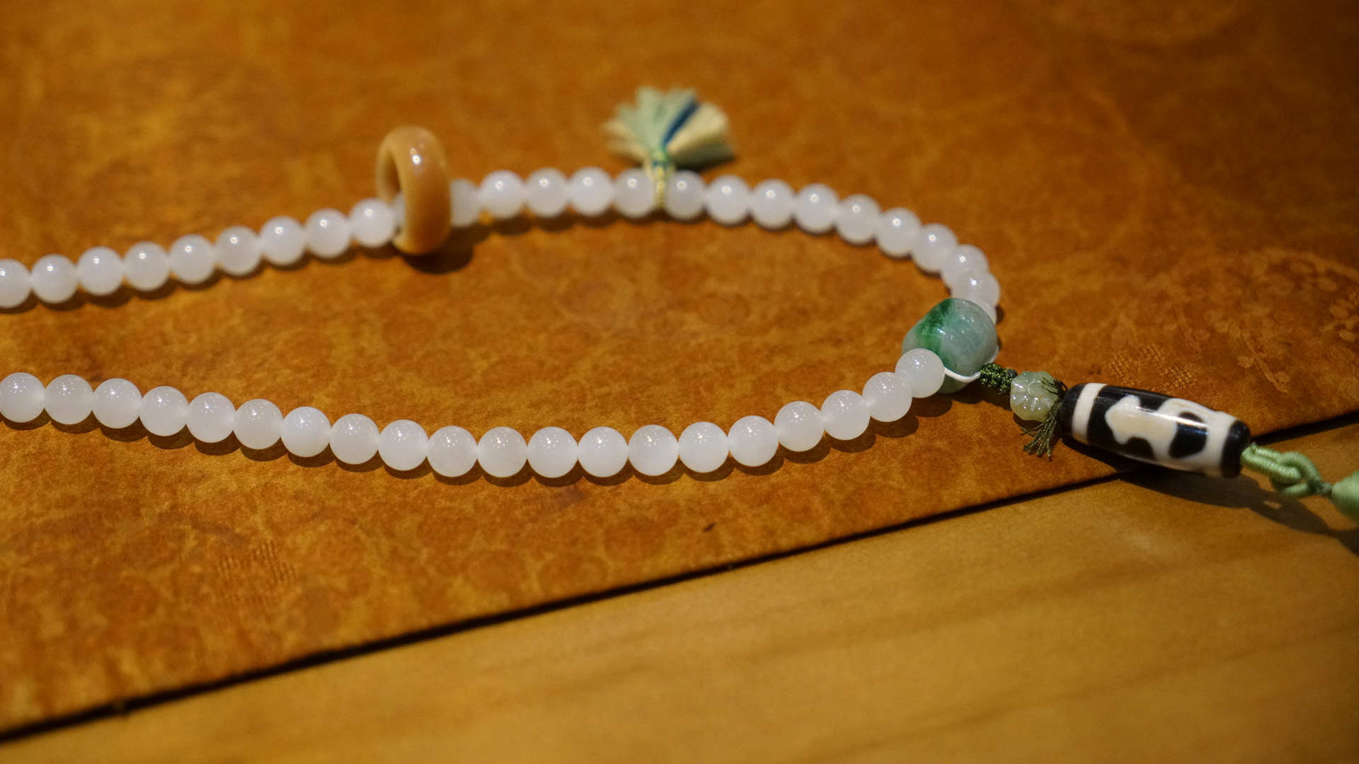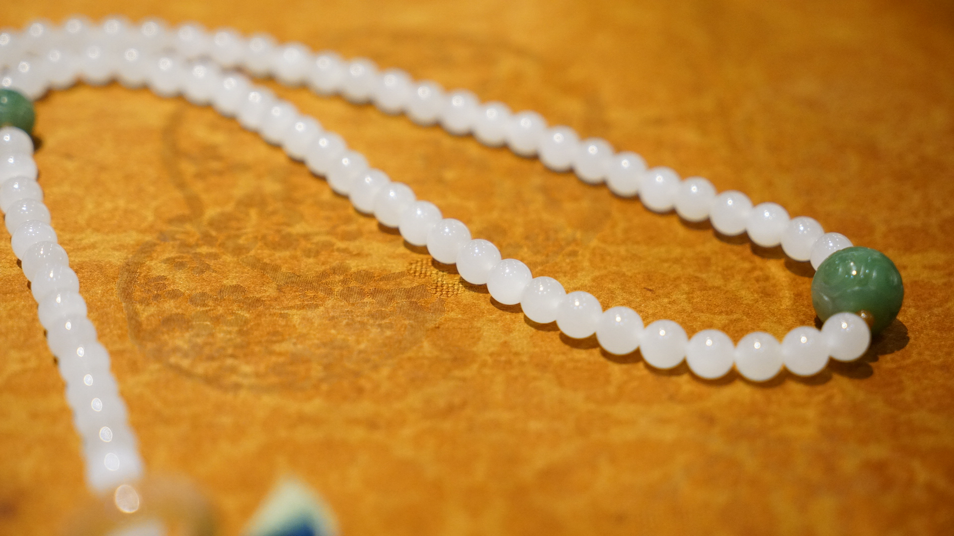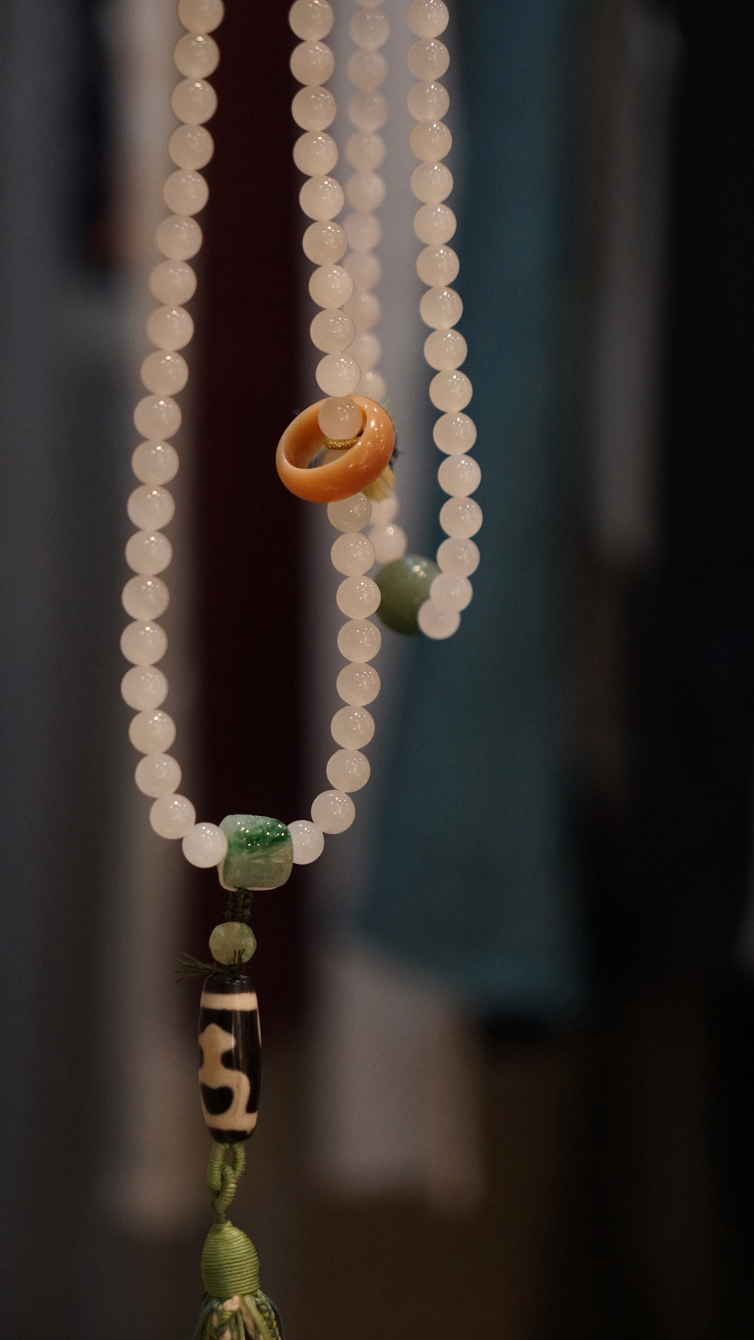 108颗念珠项链,青海料老料白玉,8mm直径,温润细腻,是不可多得的青海料和田玉好料子。顶珠和腰珠搭配了碧玉回纹珠全套,三通是翡翠一抹色辣的绿,值得回味。
