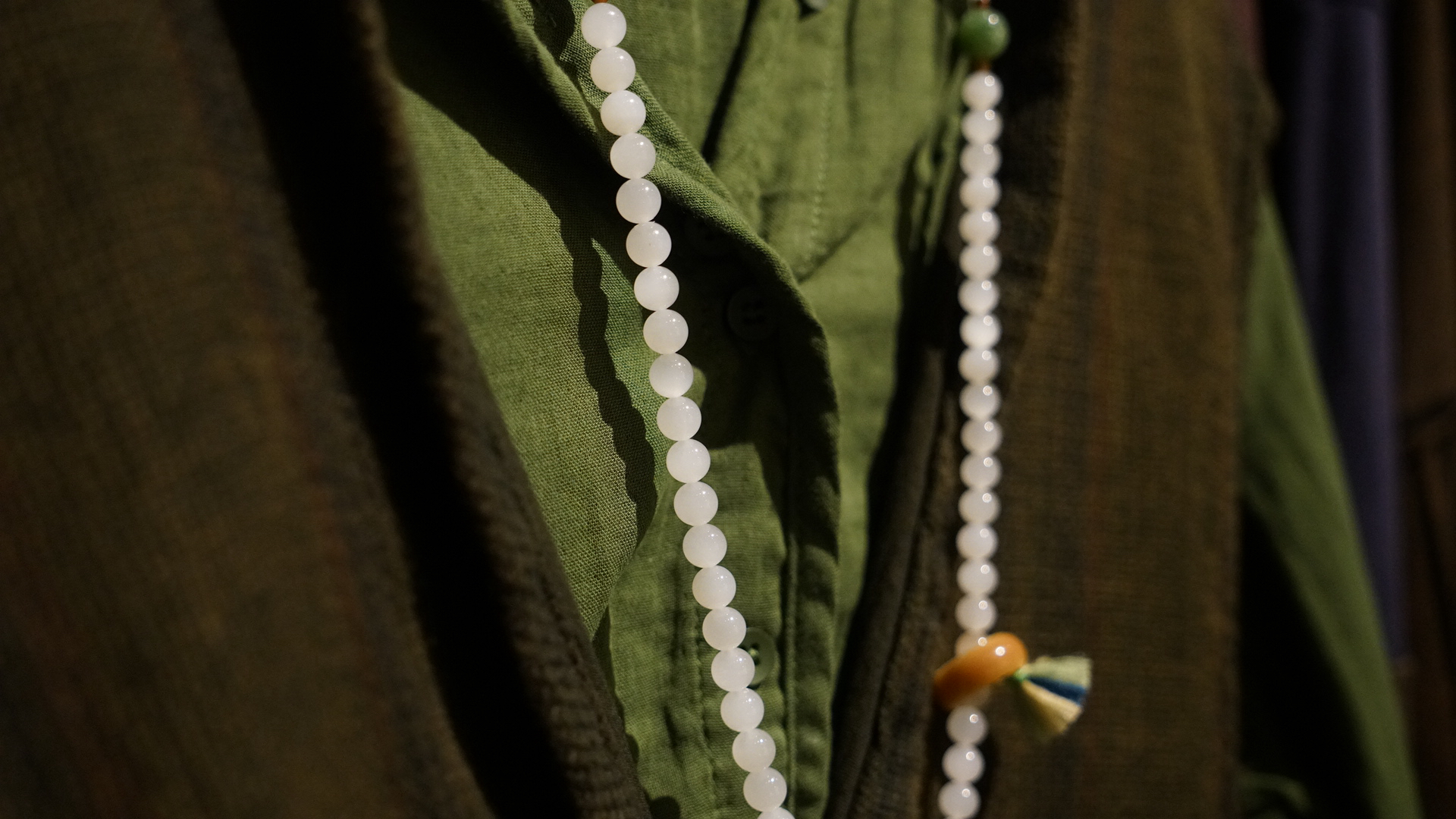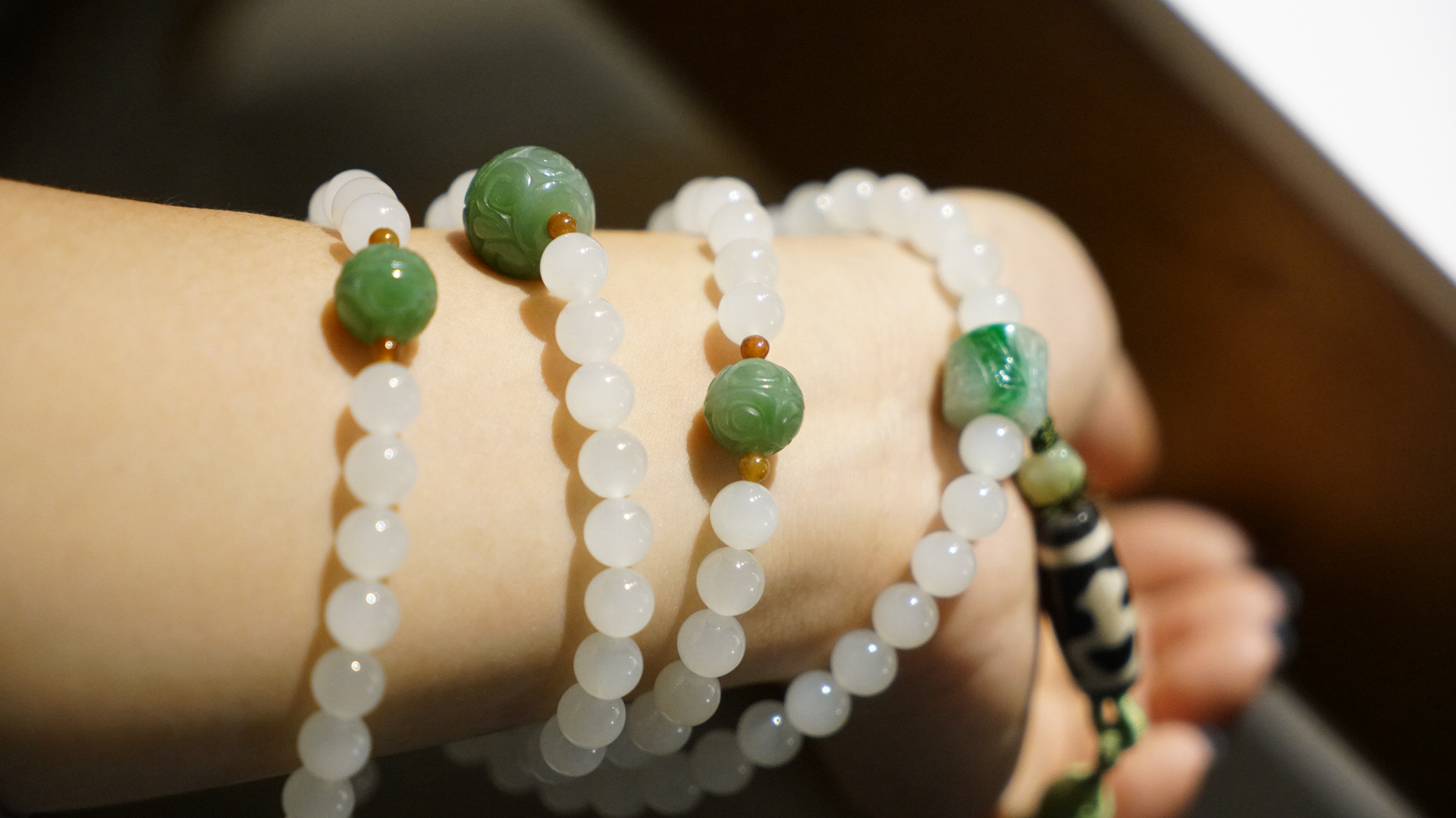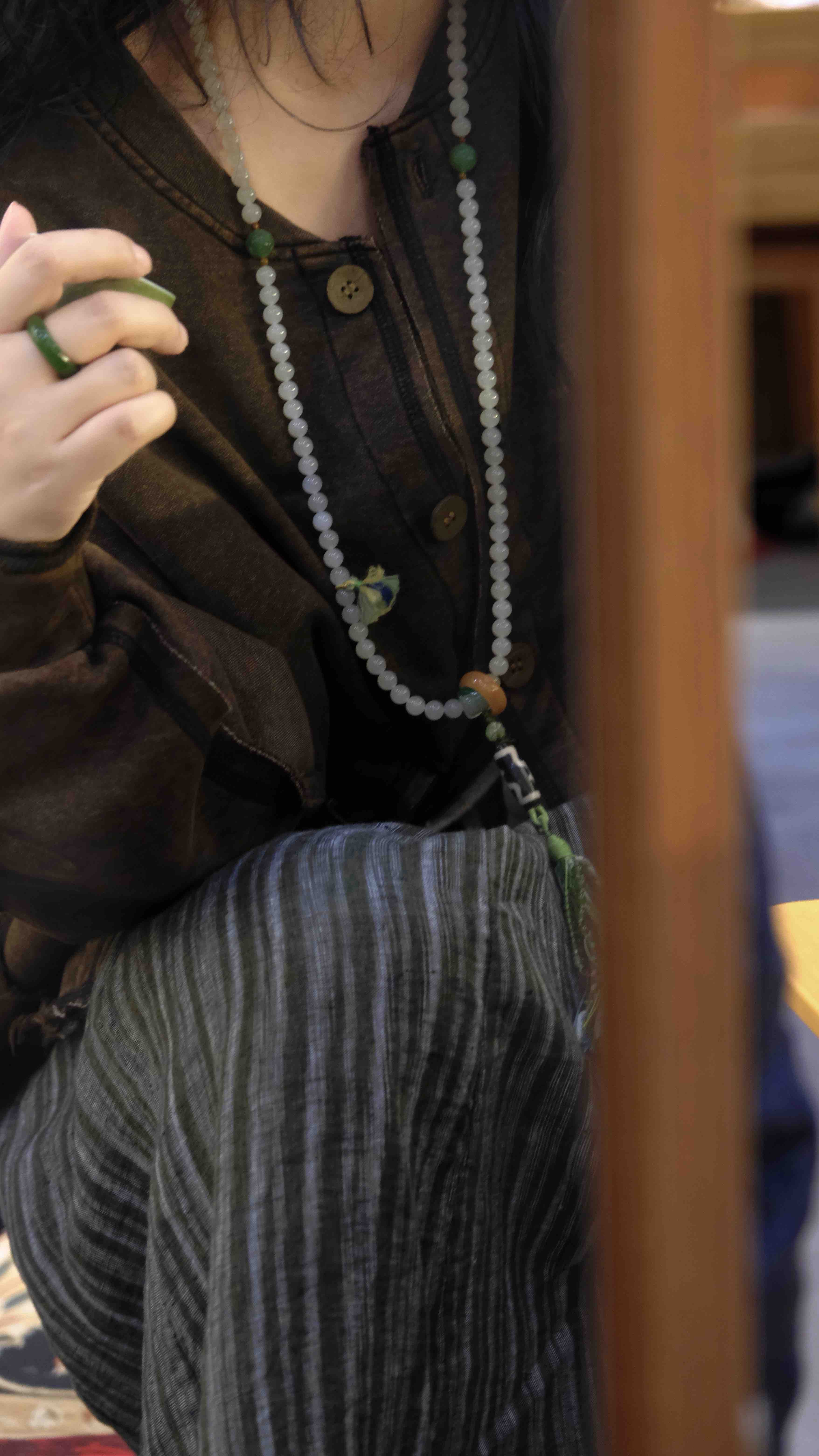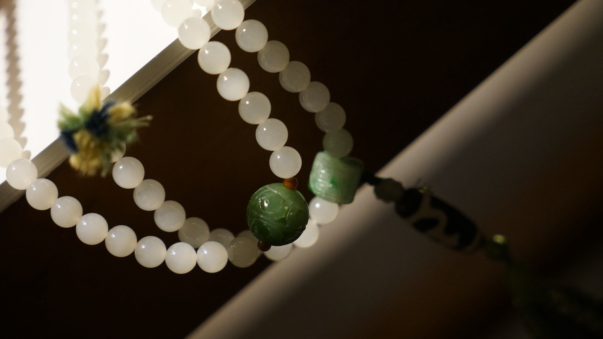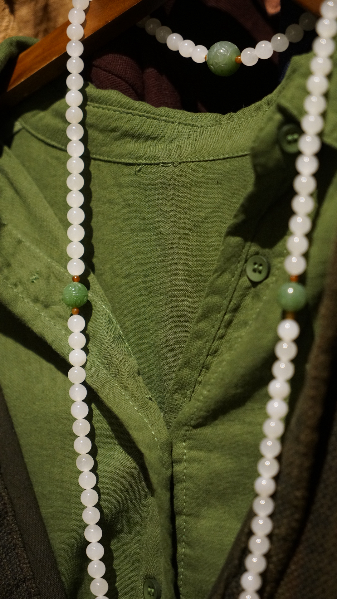 108颗念珠项链,青海料老料白玉,8mm直径,温润细腻,是不可多得的青海料和田玉好料子。顶珠和腰珠搭配了碧玉回纹珠全套,三通是翡翠一抹色辣的绿,值得回味。
