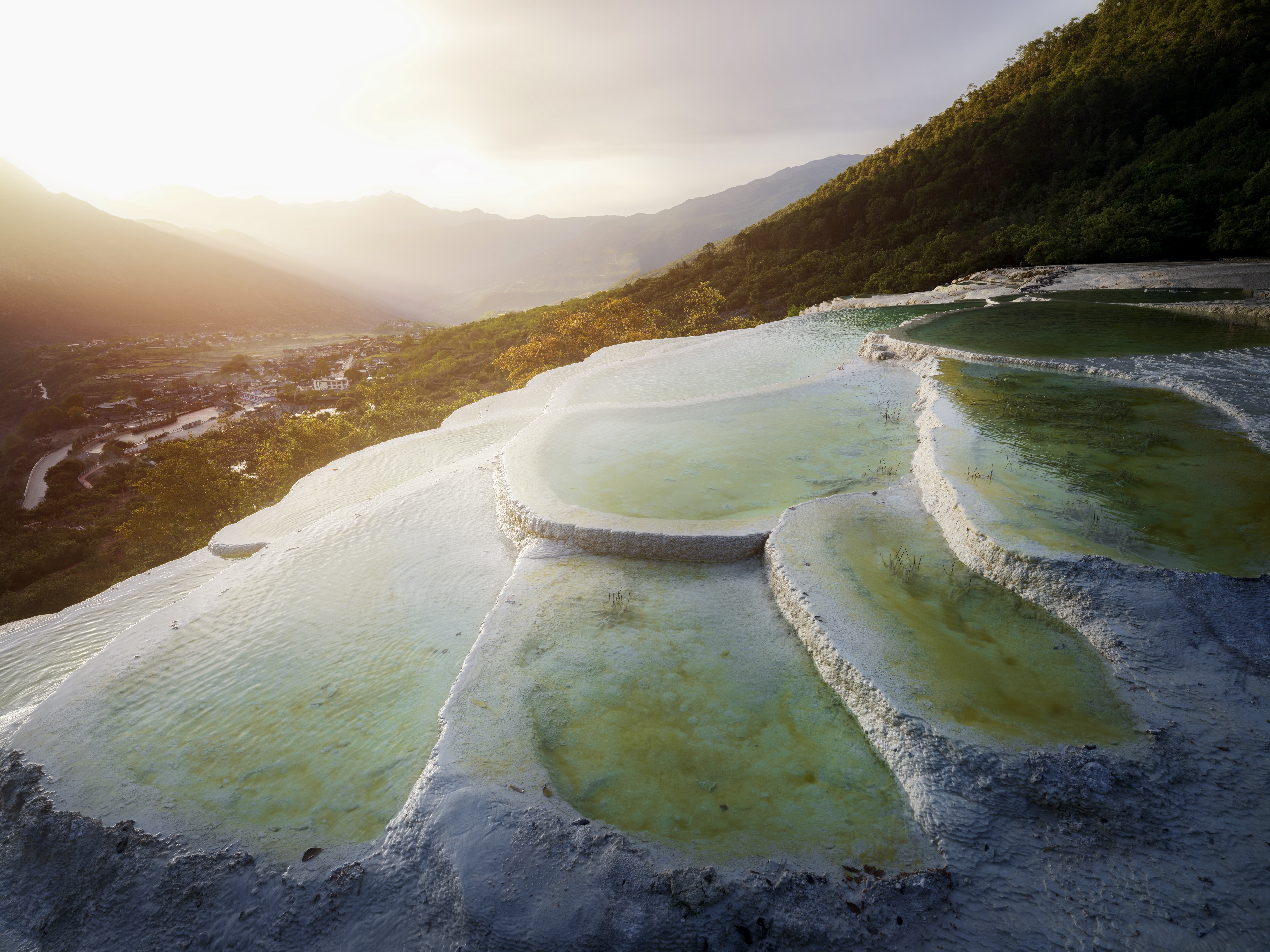 每一个月牙形彩池都有池底、池埂,都注满了水;一池与一池紧密相接,依山傍势,形成完整的群像。