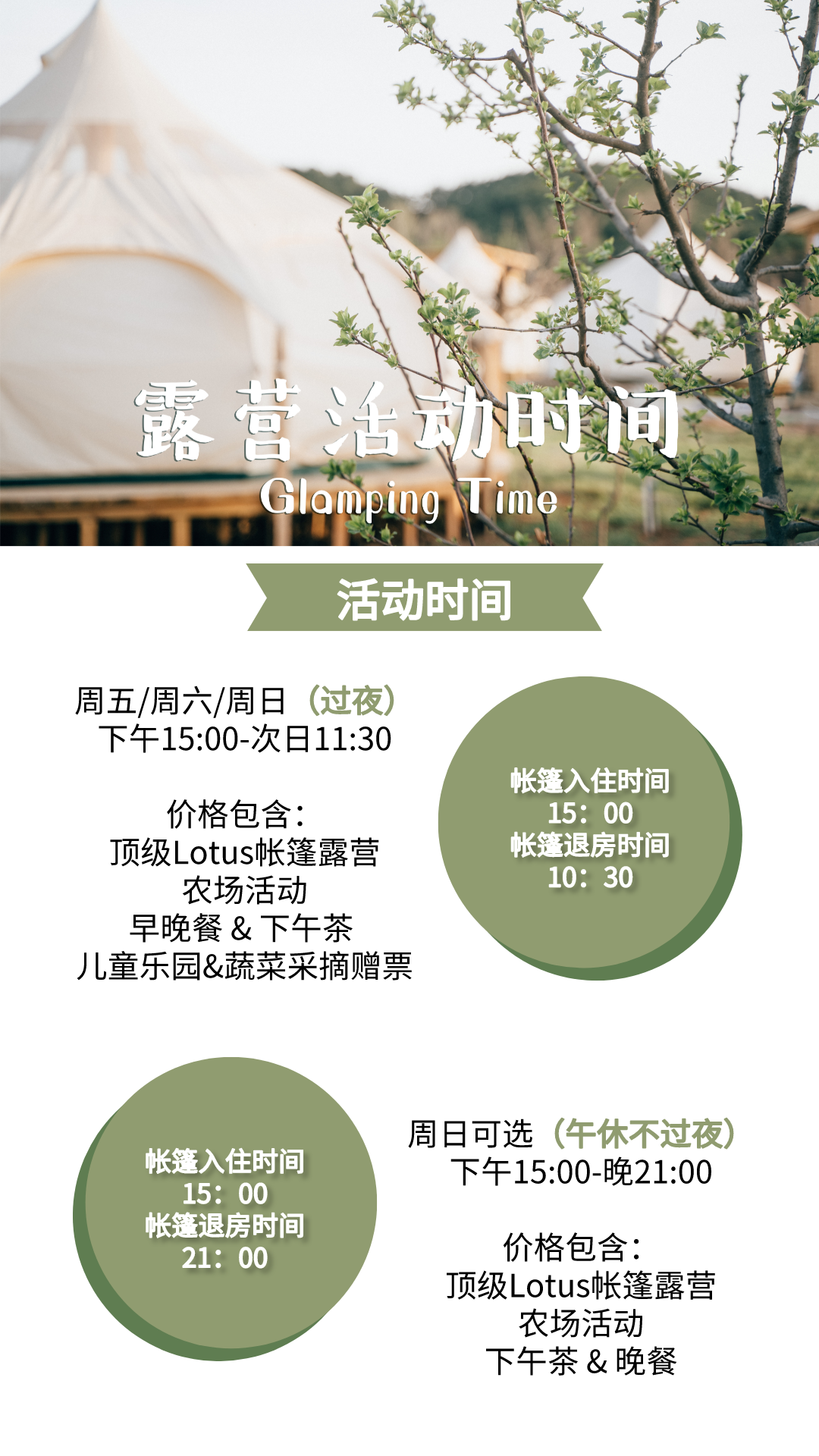 仅白天活动,同一家庭可使用一顶帐篷休息,增加一人请补差价398元。此价格包含下午茶、烧烤晚餐和亲子活动。两岁以下免费。