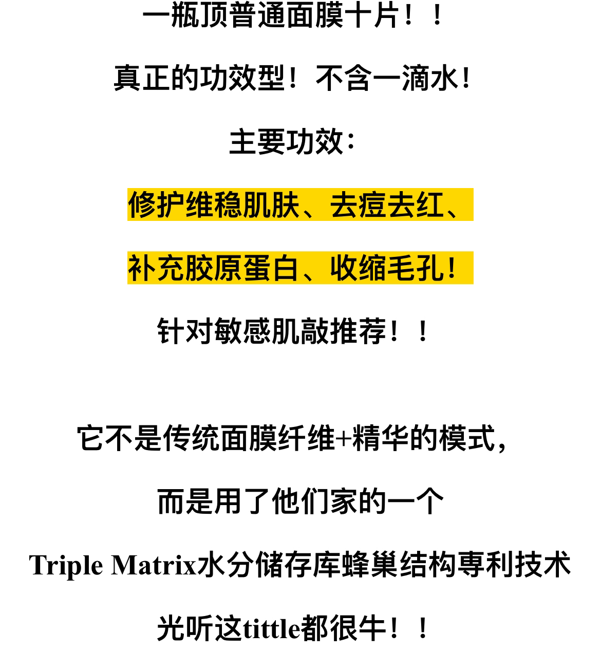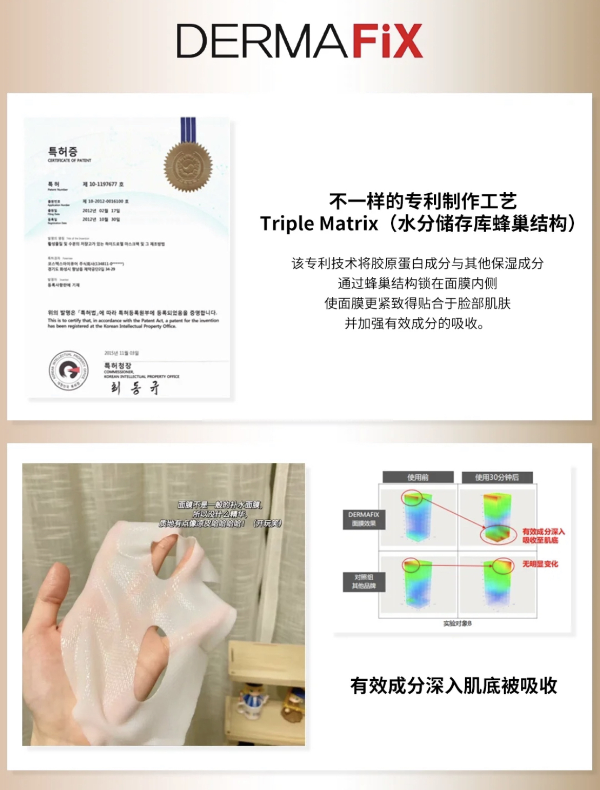 ②、专利工艺:Triple Matrix (水分储存库蜂巢结构),通过蜂巢结构,将营养成分锁于面膜内侧,让面膜更贴于脸部肌肤,充分吸收营养;
