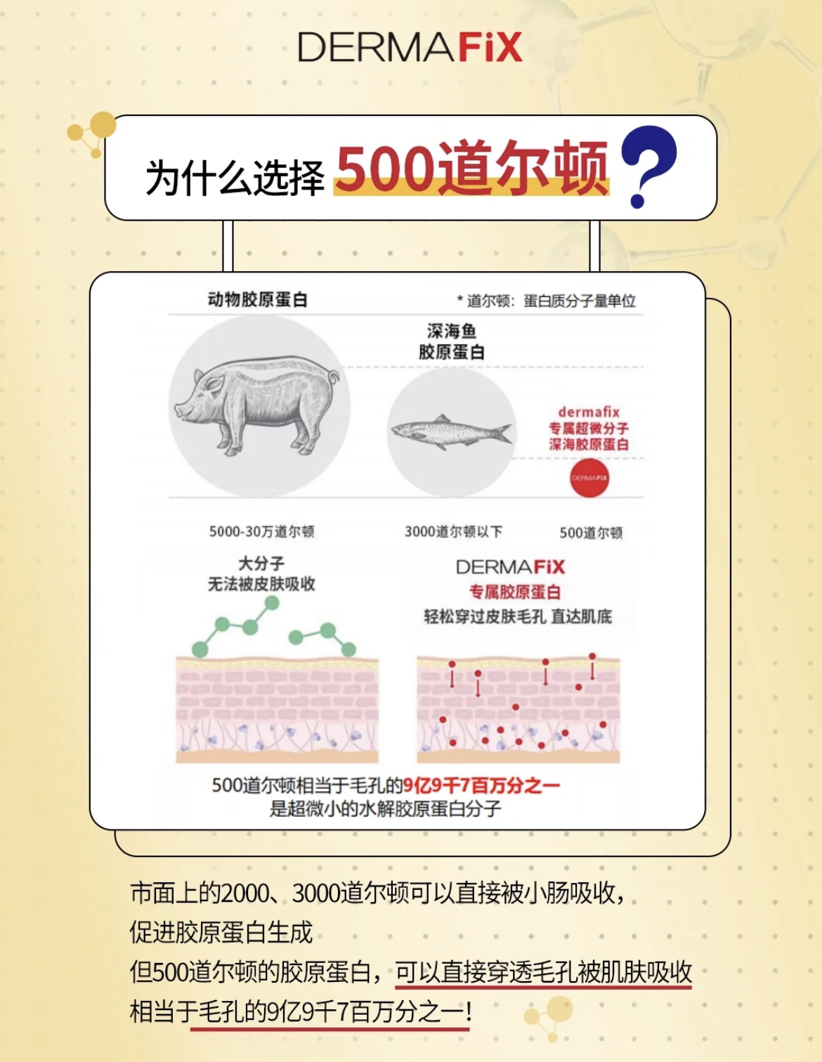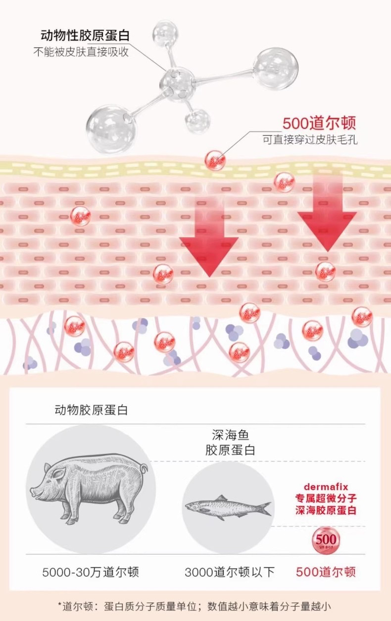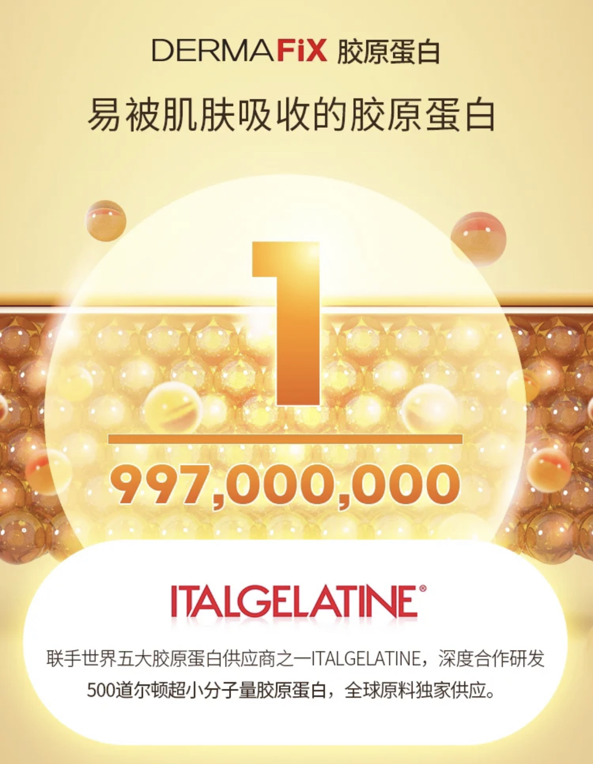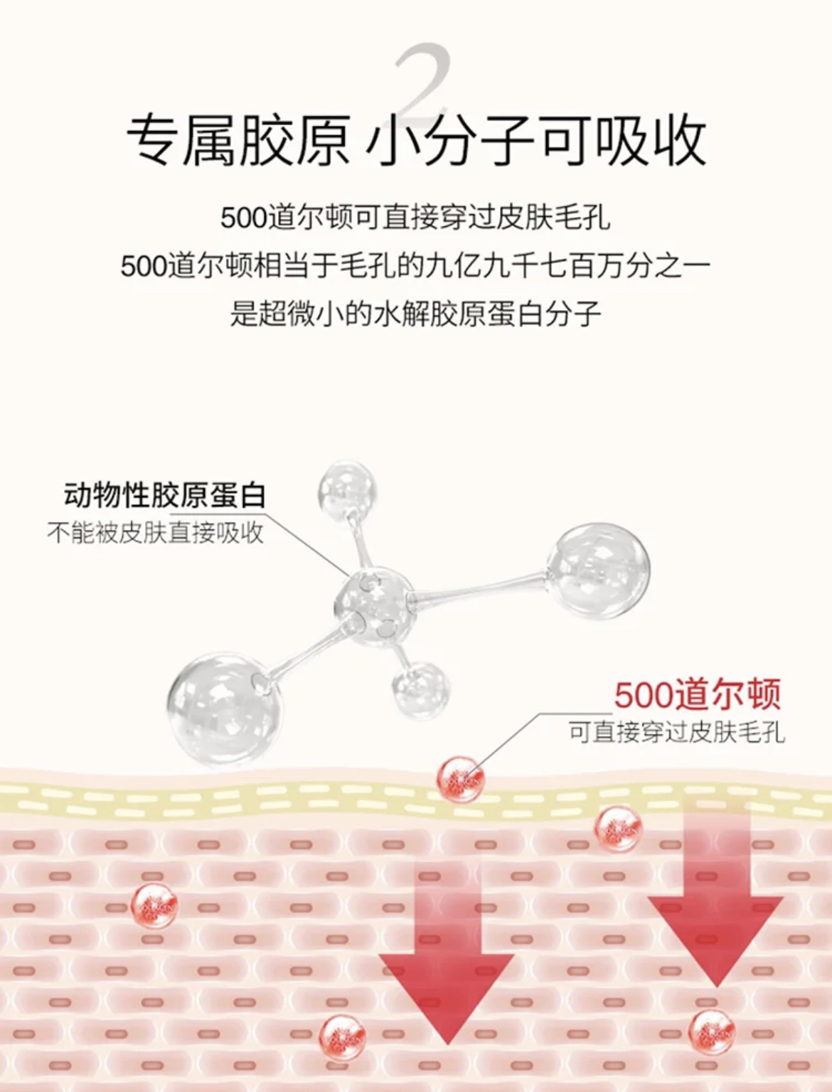 ①、专属胶原蛋白技术:胶原蛋白小分子可吸收!联手世界五大胶原蛋白供应商之一ITALGELATINE,深度合作研发500道尔顿超小分子量胶原蛋白,可直接穿过皮肤毛孔,直达肌底吸收。全球原料DU家供应,500道尔顿相当于毛孔的九亿九千七百万分之一,是超微小的水解胶原蛋白分子;