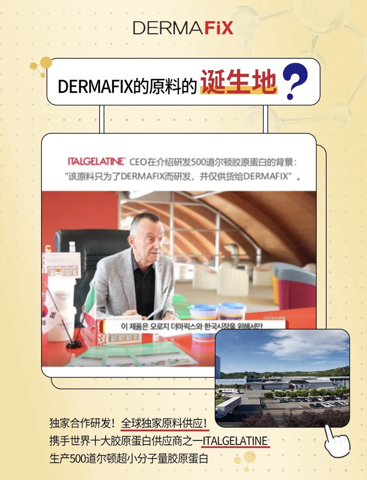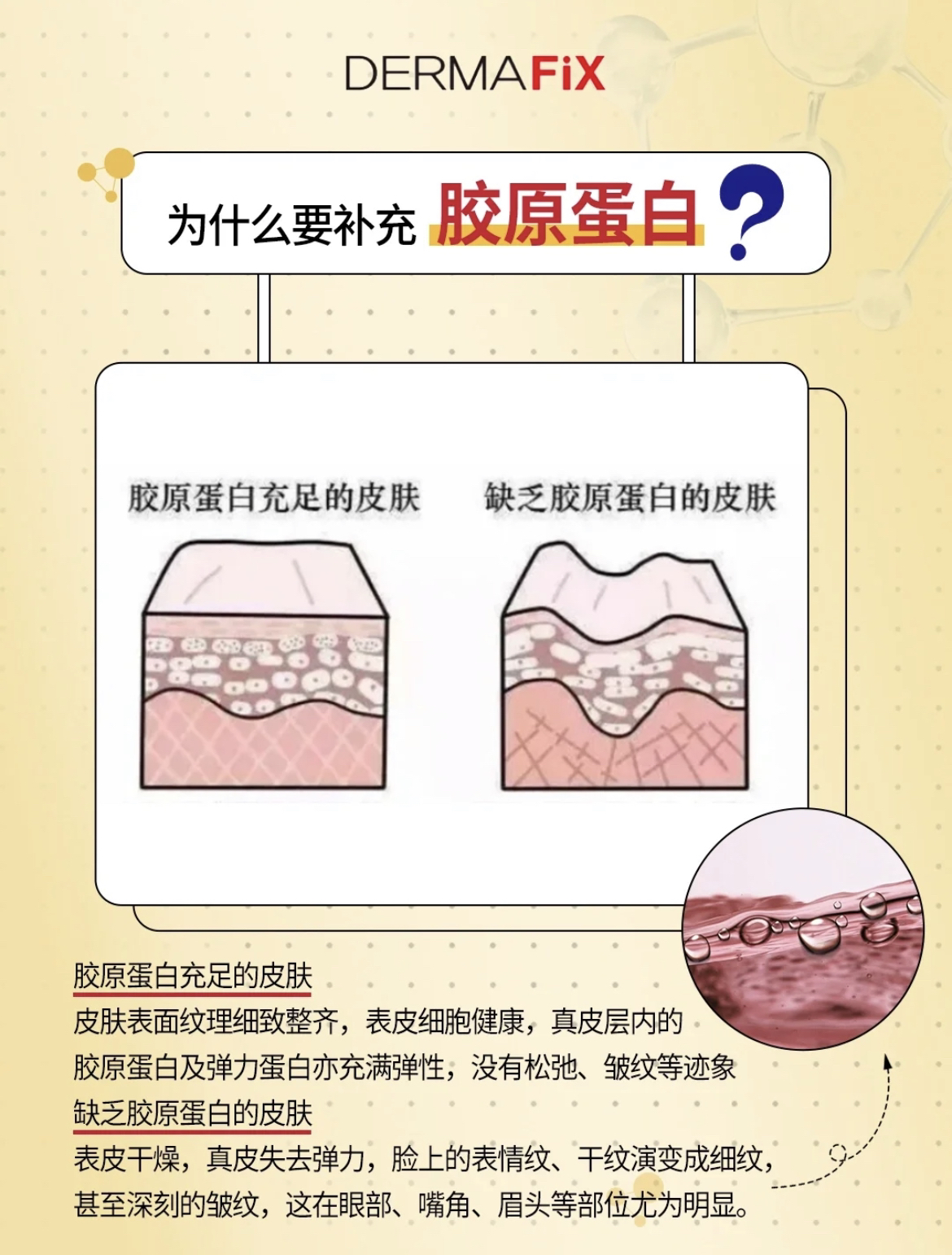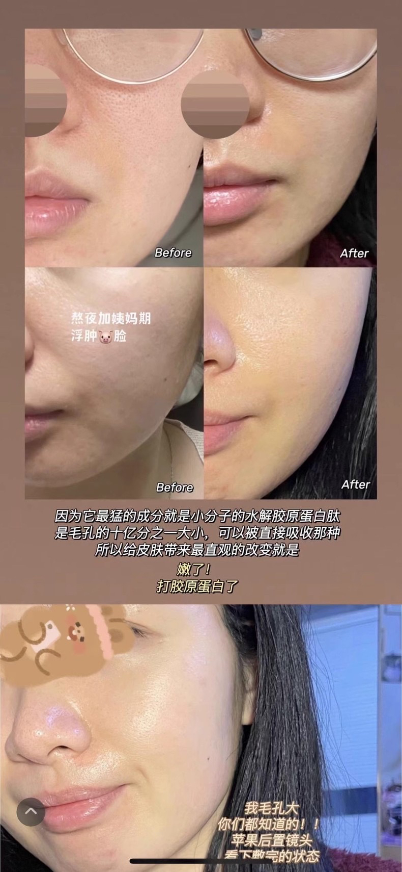 ①、专属胶原蛋白技术:胶原蛋白小分子可吸收!联手世界五大胶原蛋白供应商之一ITALGELATINE,深度合作研发500道尔顿超小分子量胶原蛋白,可直接穿过皮肤毛孔,直达肌底吸收。全球原料DU家供应,500道尔顿相当于毛孔的九亿九千七百万分之一,是超微小的水解胶原蛋白分子;