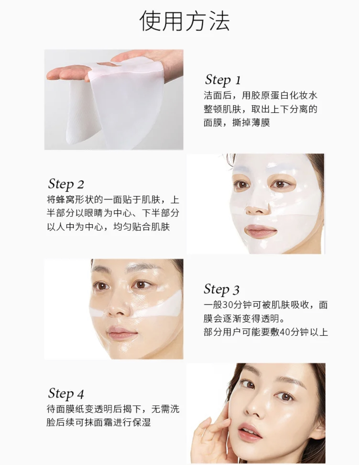 3、使用后,无需冲洗脸部,建议涂抹面霜加以保湿,减少皮肤吸收的胶原蛋白再次流失;