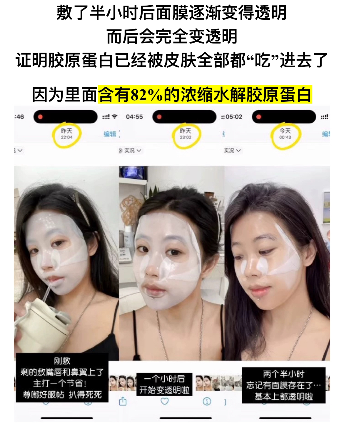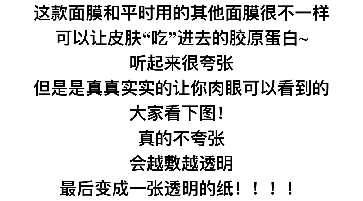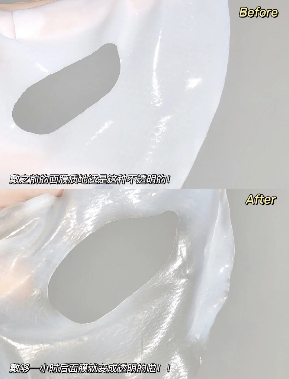 4、本产品变透明的速度与个人皮肤状态有关。使用40分钟以上,有效成分就可以被吸收至肌底,也可以不需要等面膜完全变透明;