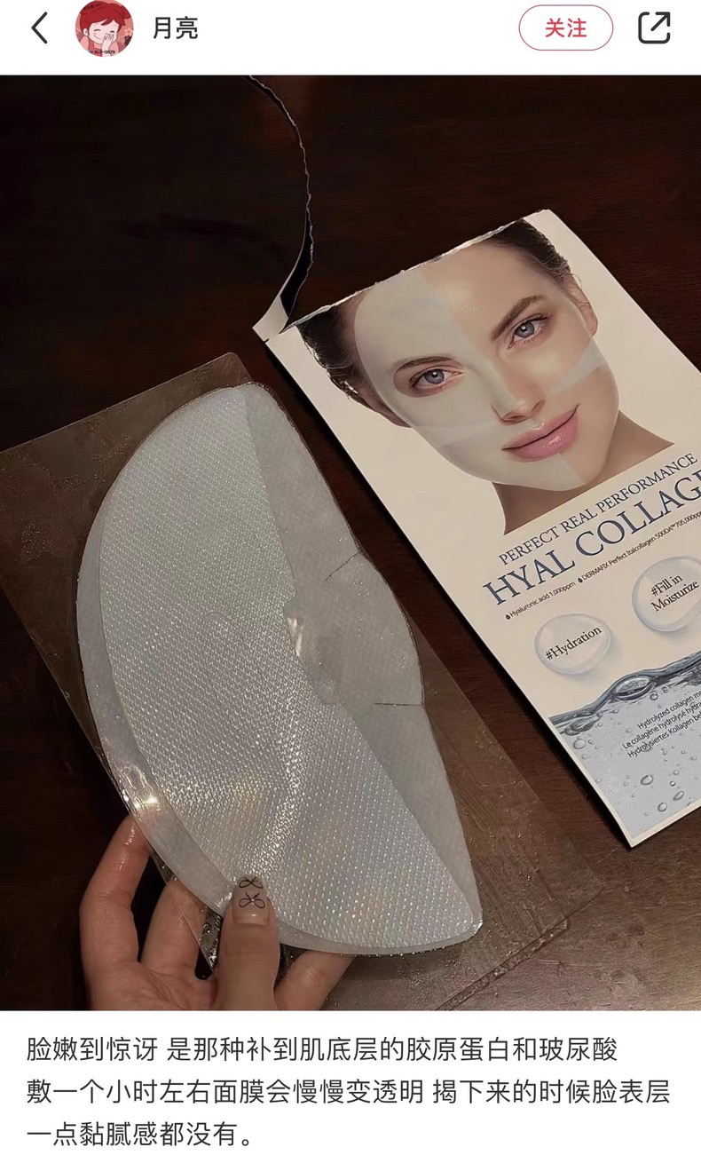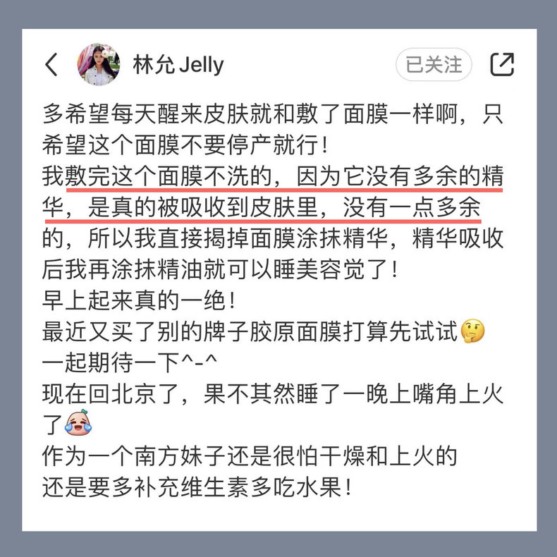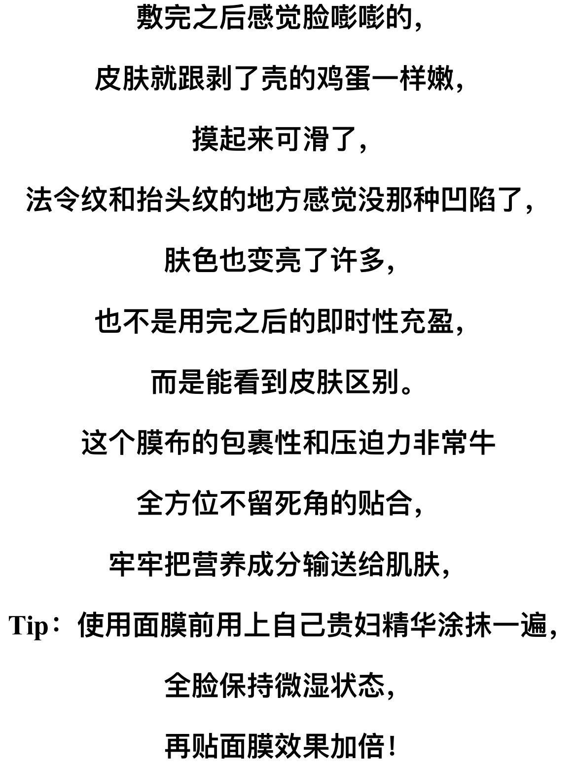 2、本面膜为胶原蛋白集中护理型面膜,使用后紧致提升感较强。并且因为皮肤表面没有精华液的残留,部分客户会不适应干爽的使用感。如果觉得略干,可以使用前涂抹一层乳液or精华打底;