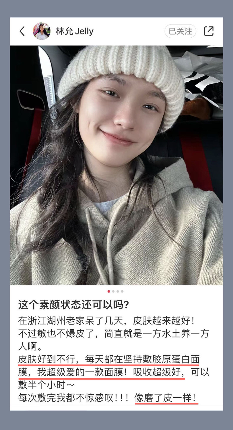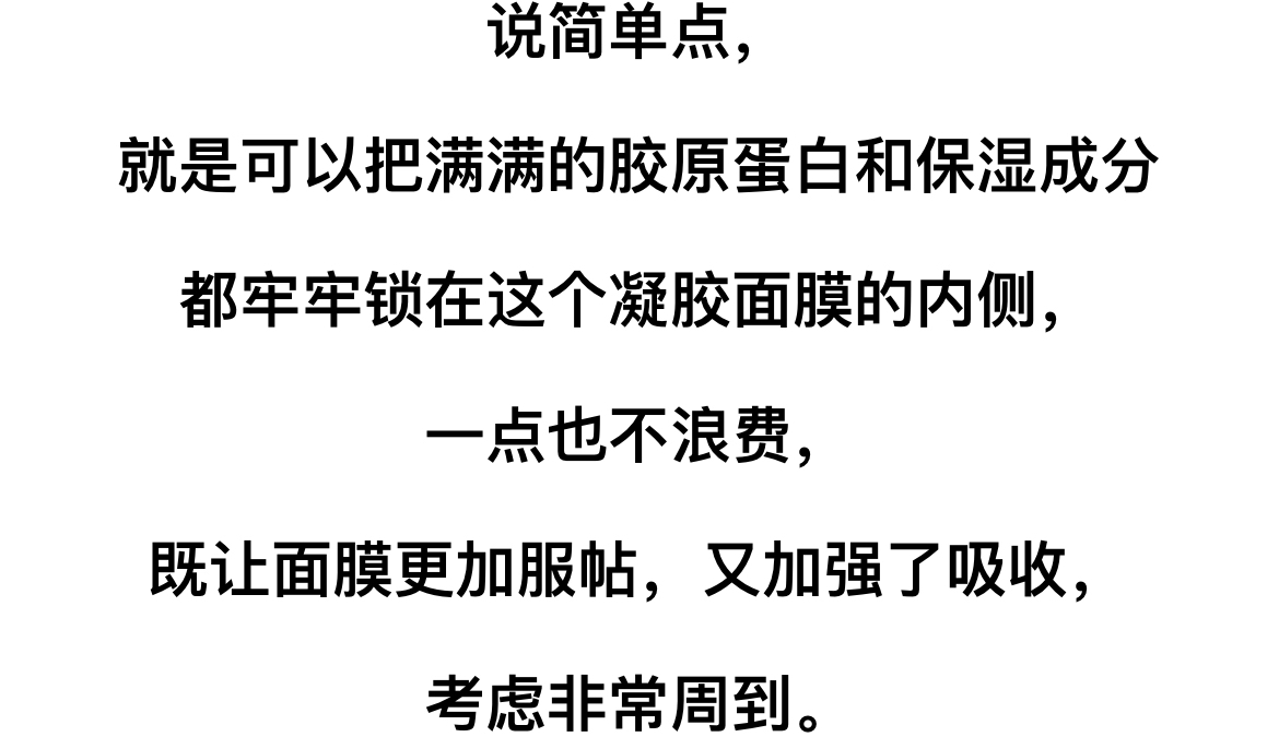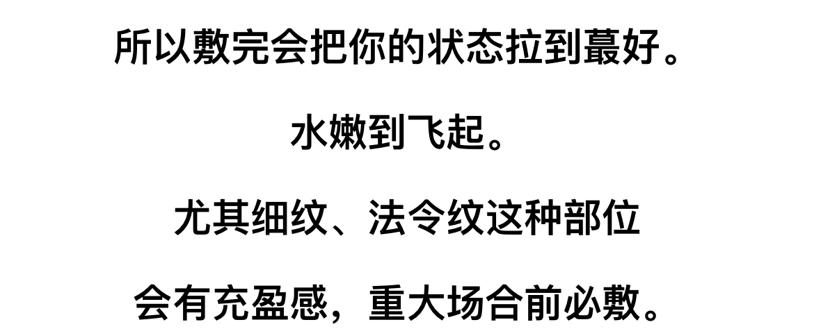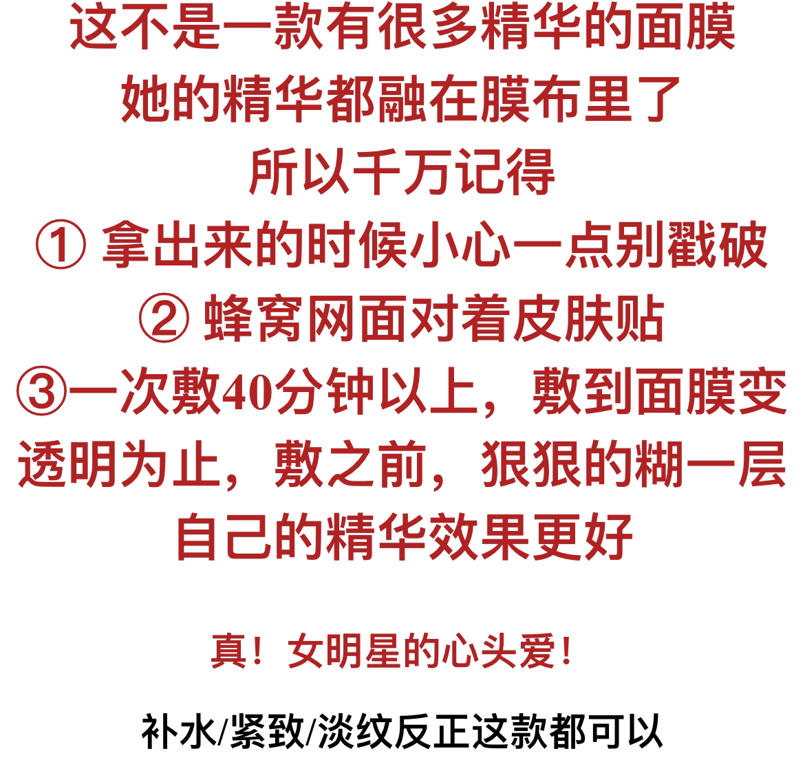 2、本面膜为胶原蛋白集中护理型面膜,使用后紧致提升感较强。并且因为皮肤表面没有精华液的残留,部分客户会不适应干爽的使用感。如果觉得略干,可以使用前涂抹一层乳液or精华打底;