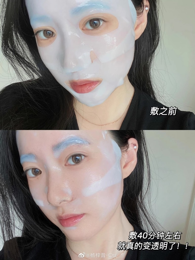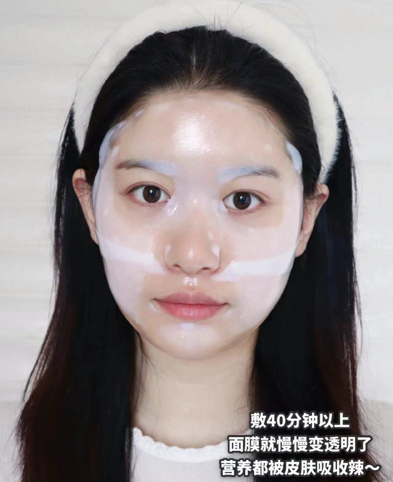 3、一般30分钟可被肌肤吸收,面膜会逐渐变得透明;部分用户可能要敷40分钟以上;