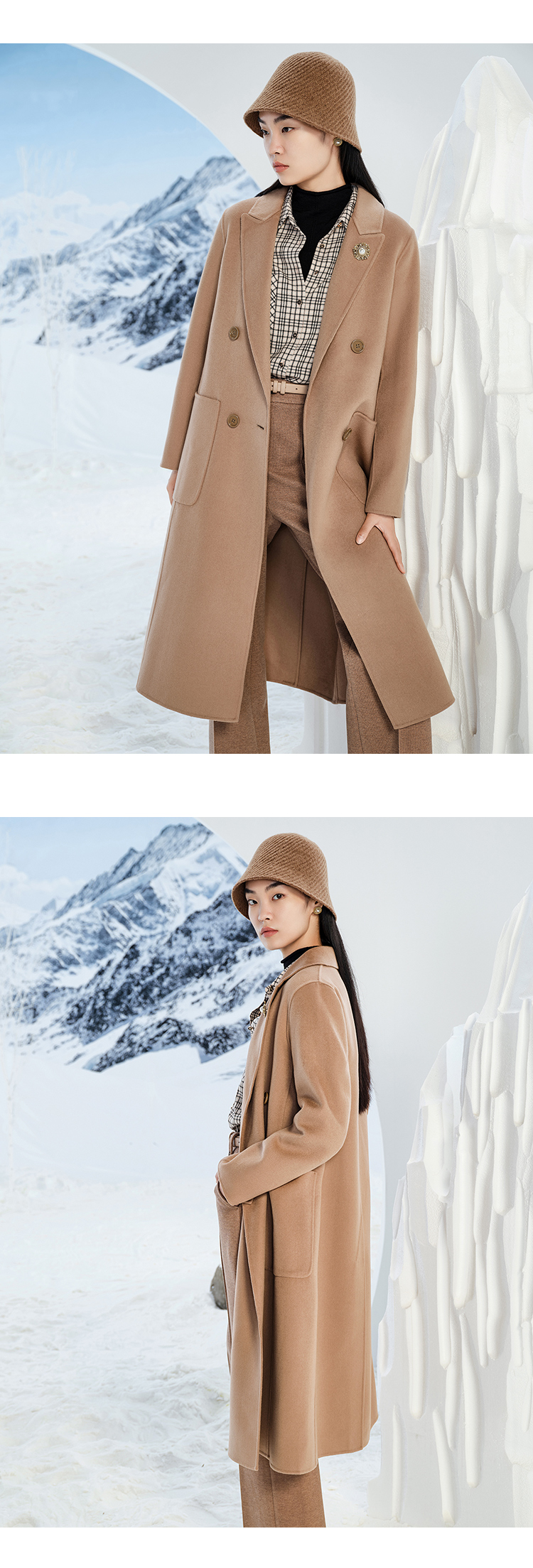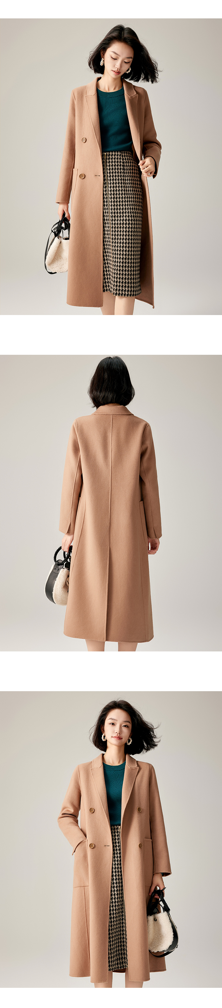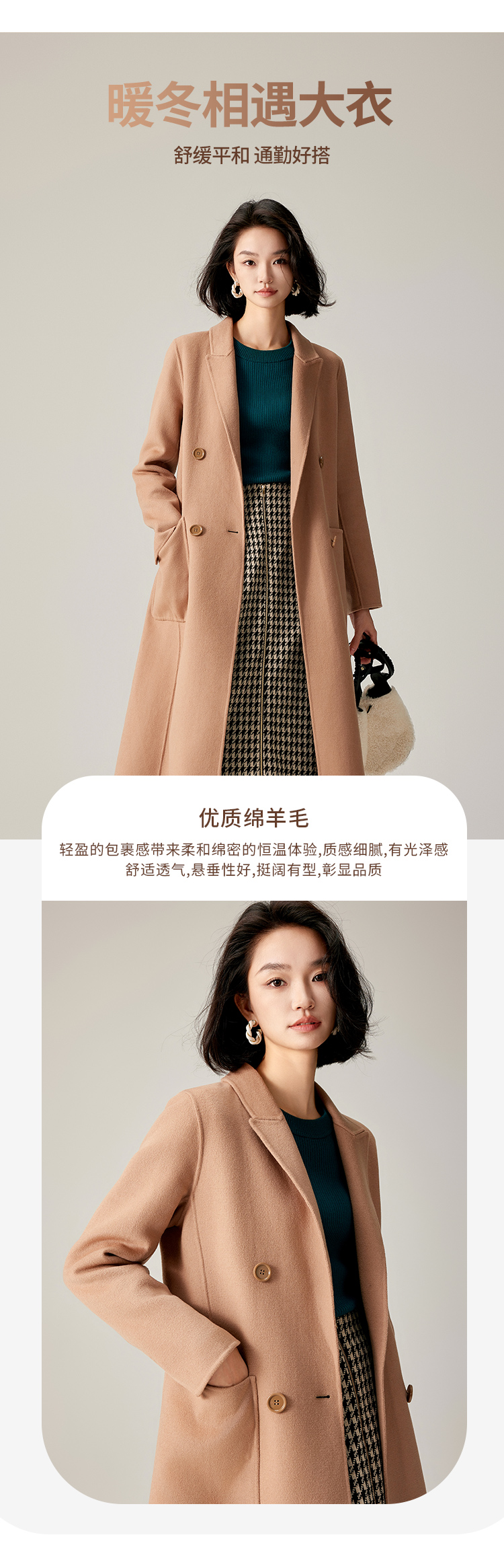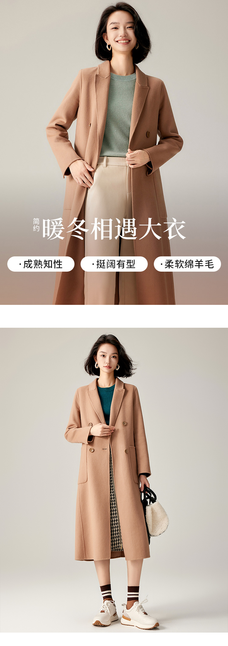 【商场同款】CJCI011 时尚气质毛呢大衣 双面呢 摩卡色 摩登通勤 双排扣气质款中长大衣 绵羊毛 气质