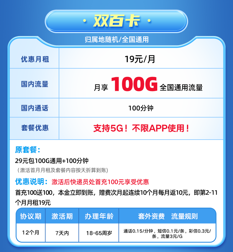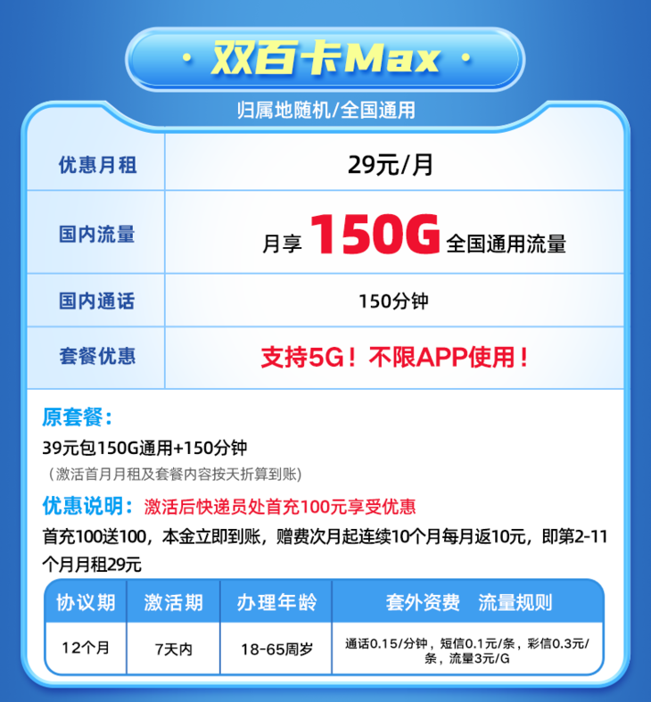 【收货地=归属地】支持5G网!月享150G纯通用流量!不限APP使用!仅发上海!双百卡、双百卡Max